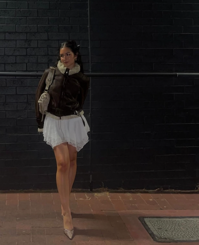 Vintage Leather Jacket, Vintage Mesh Overlay Floral Dress