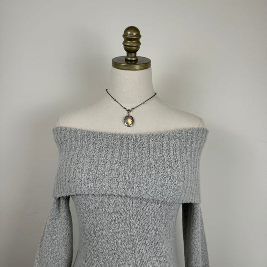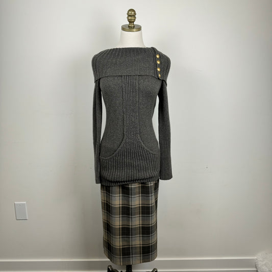 Grey Off Shoulder Gold Button Sweater