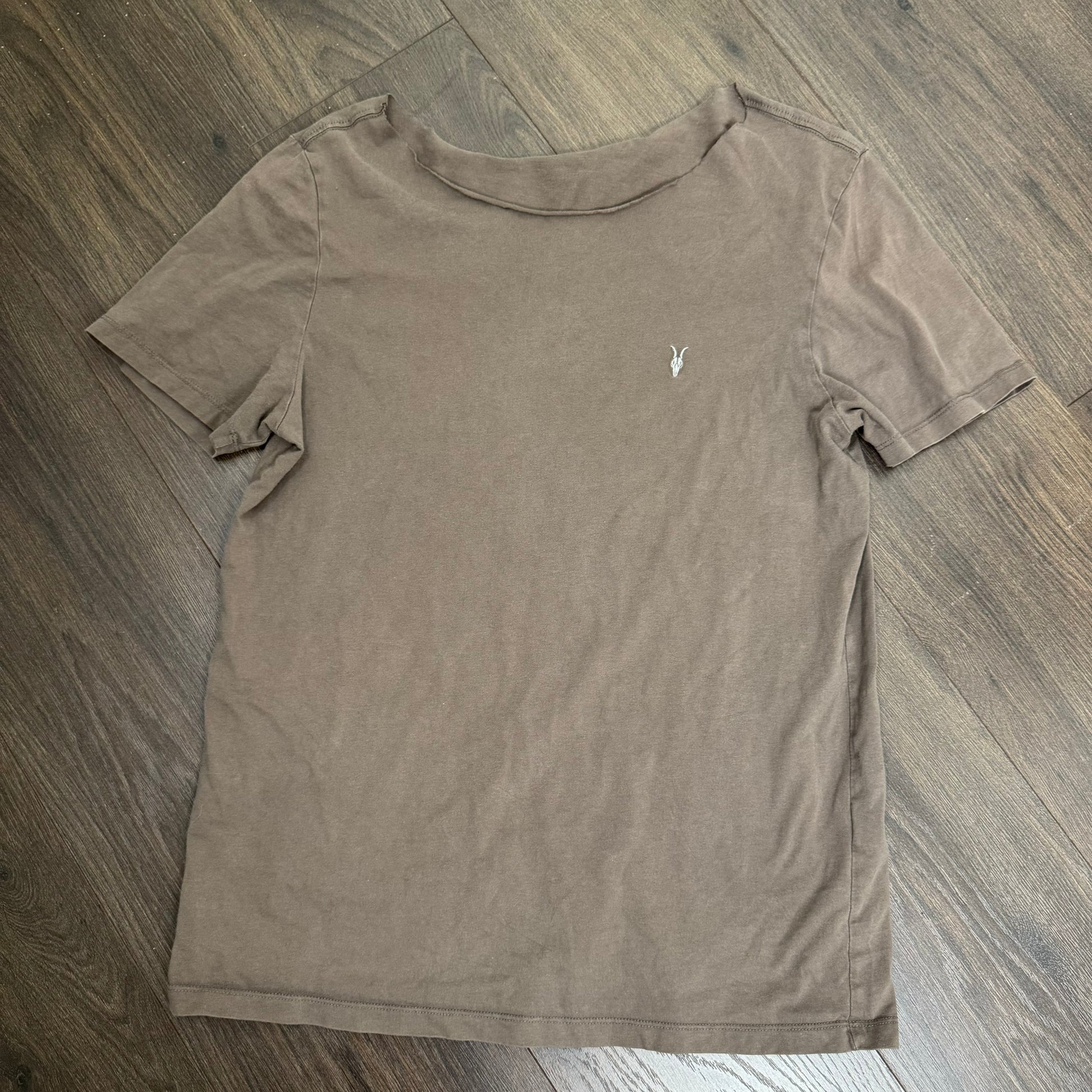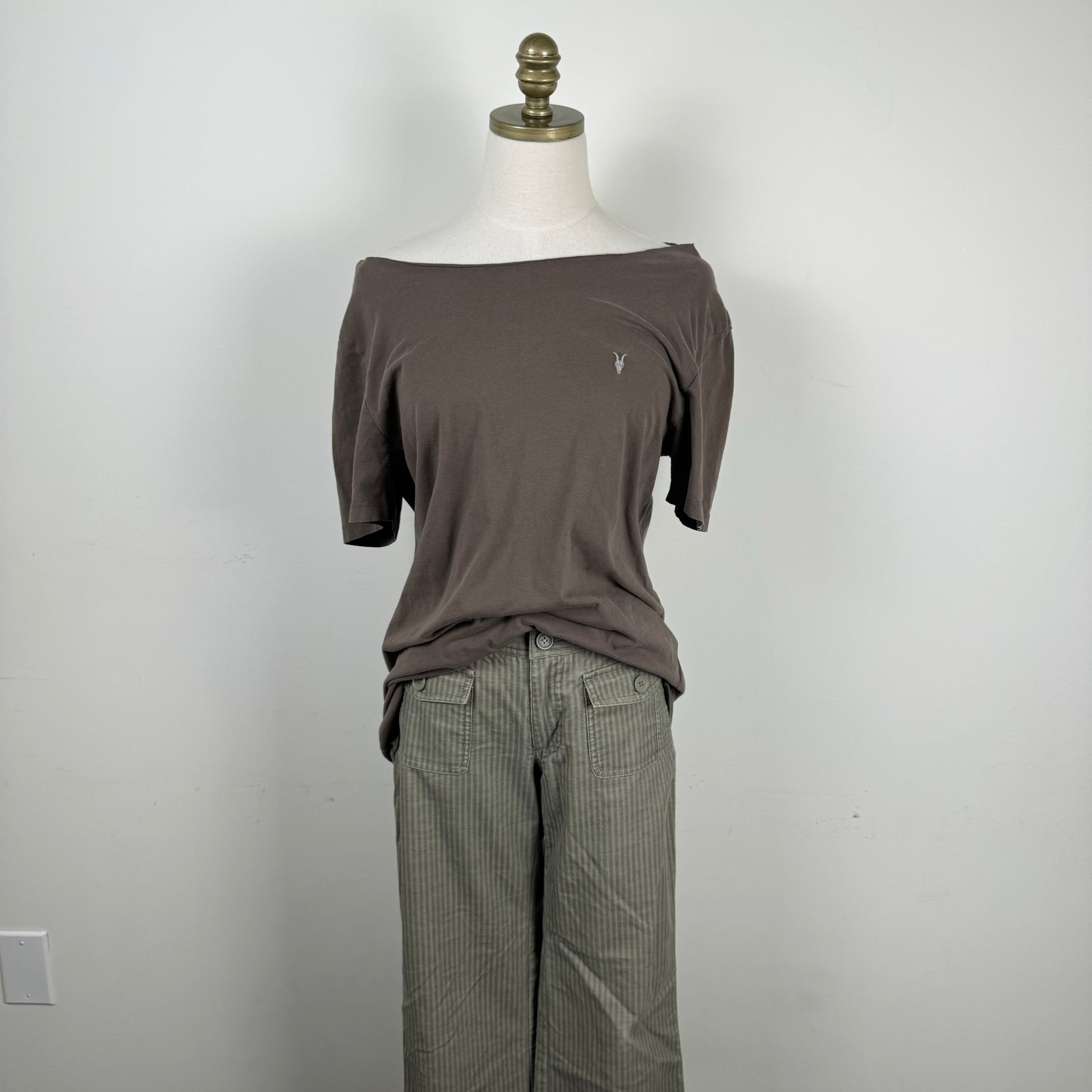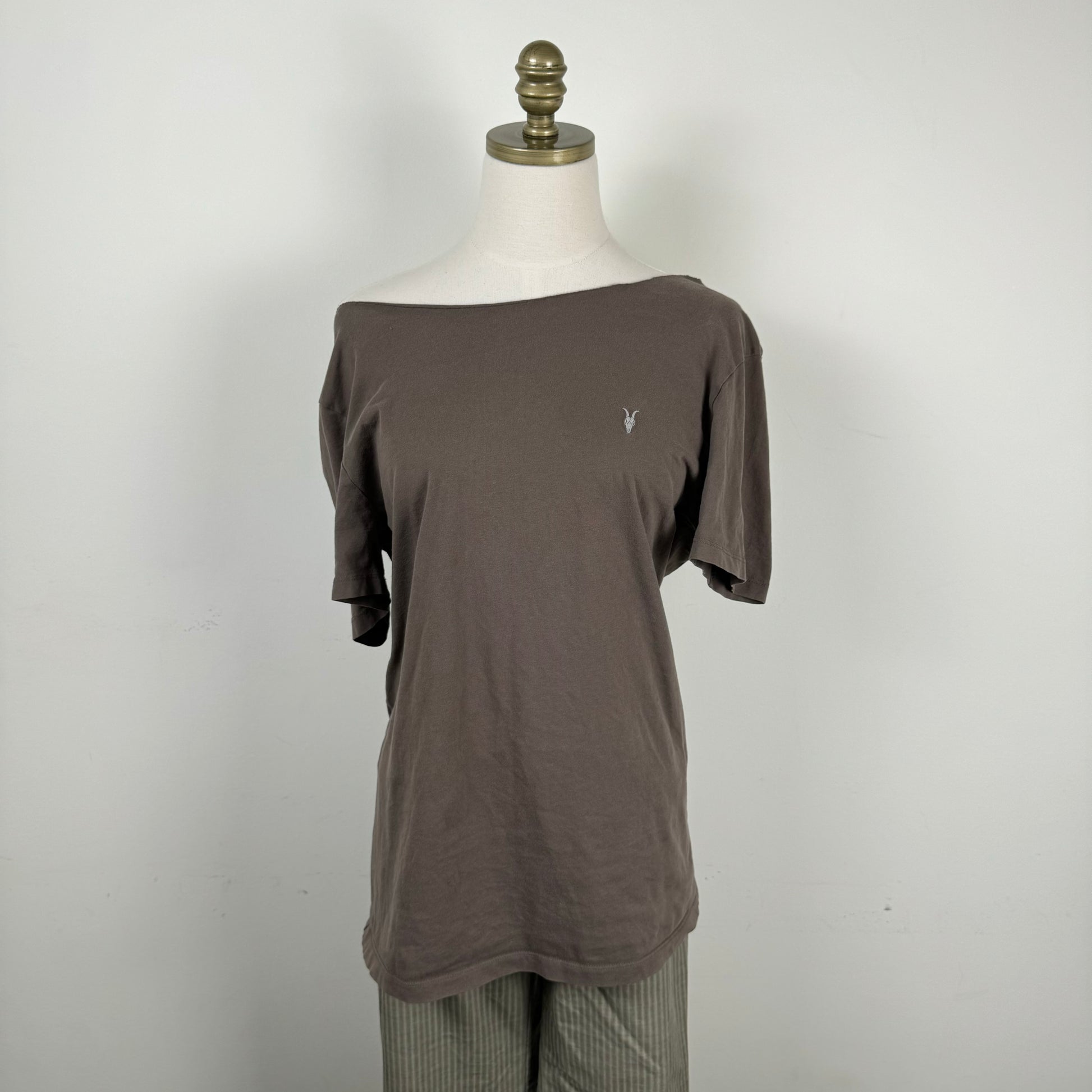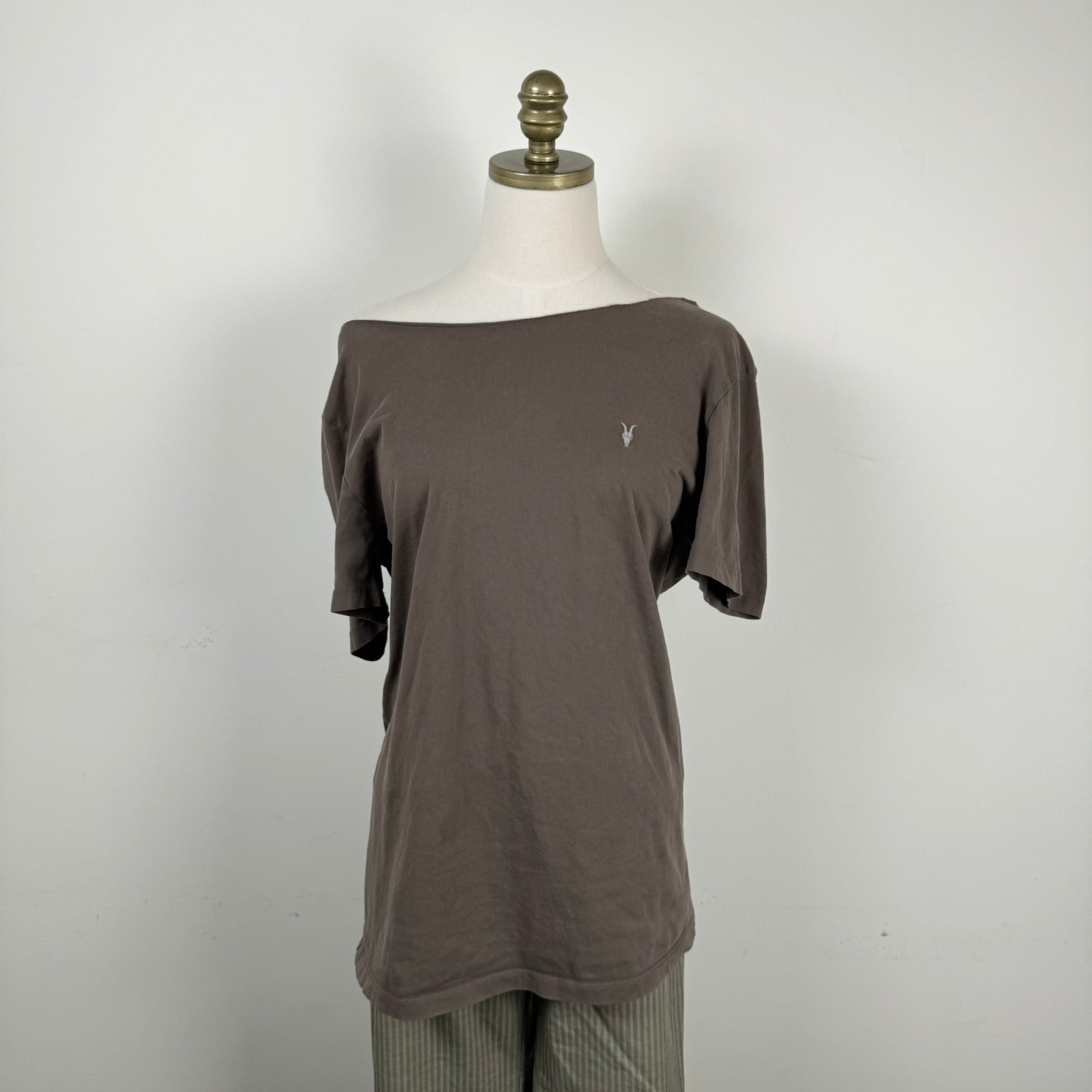 Details: Brown off-shoulder t-shirt with raw hem detail.