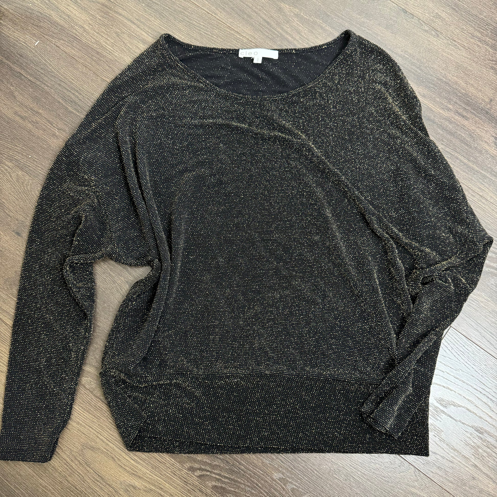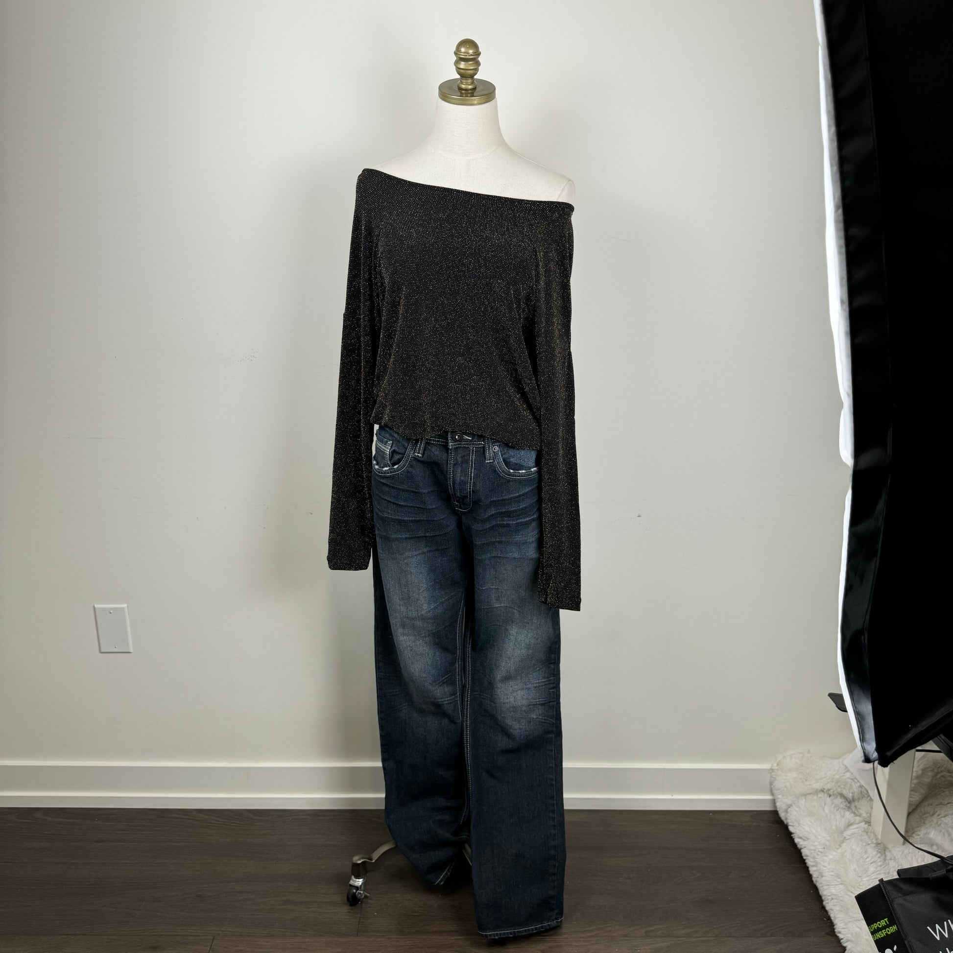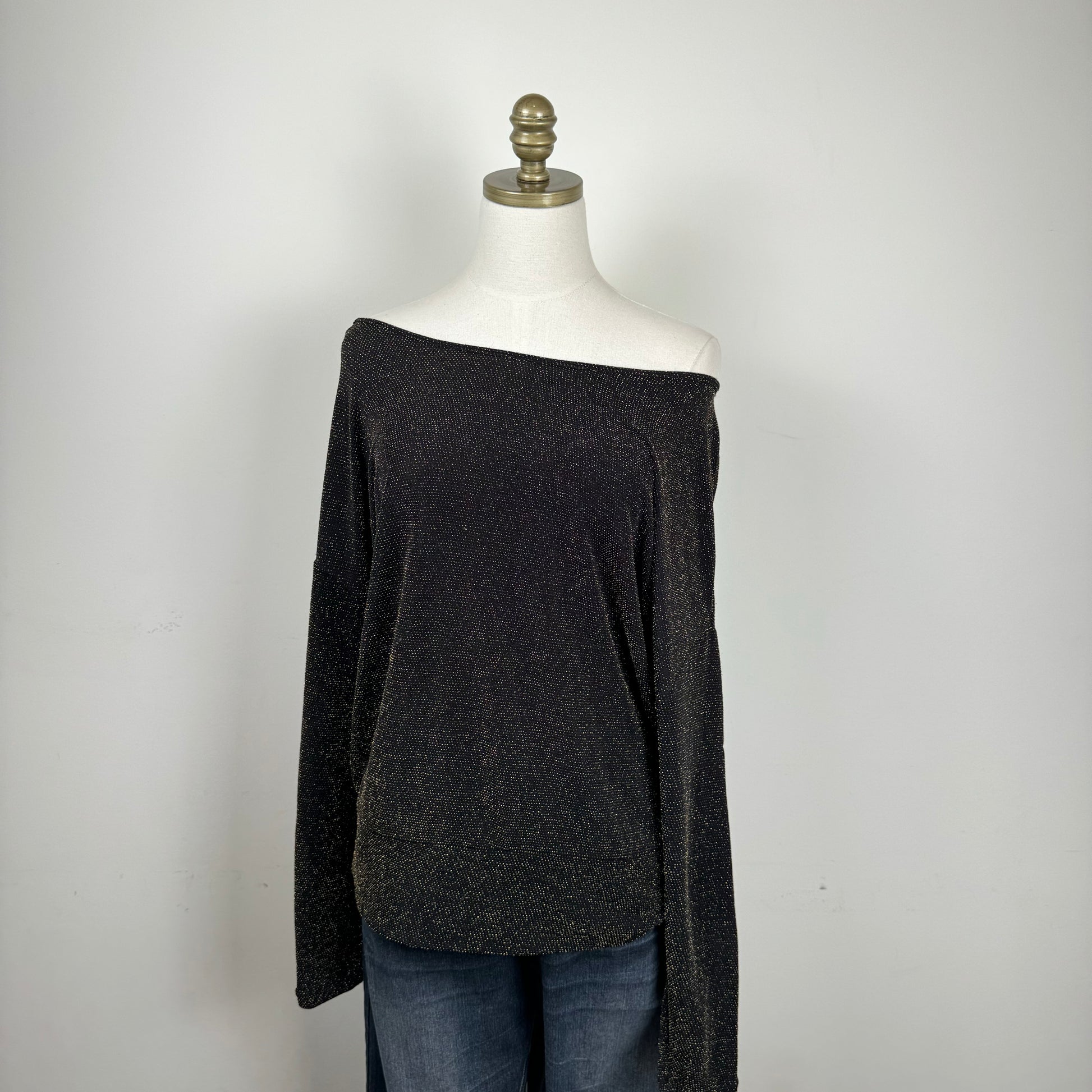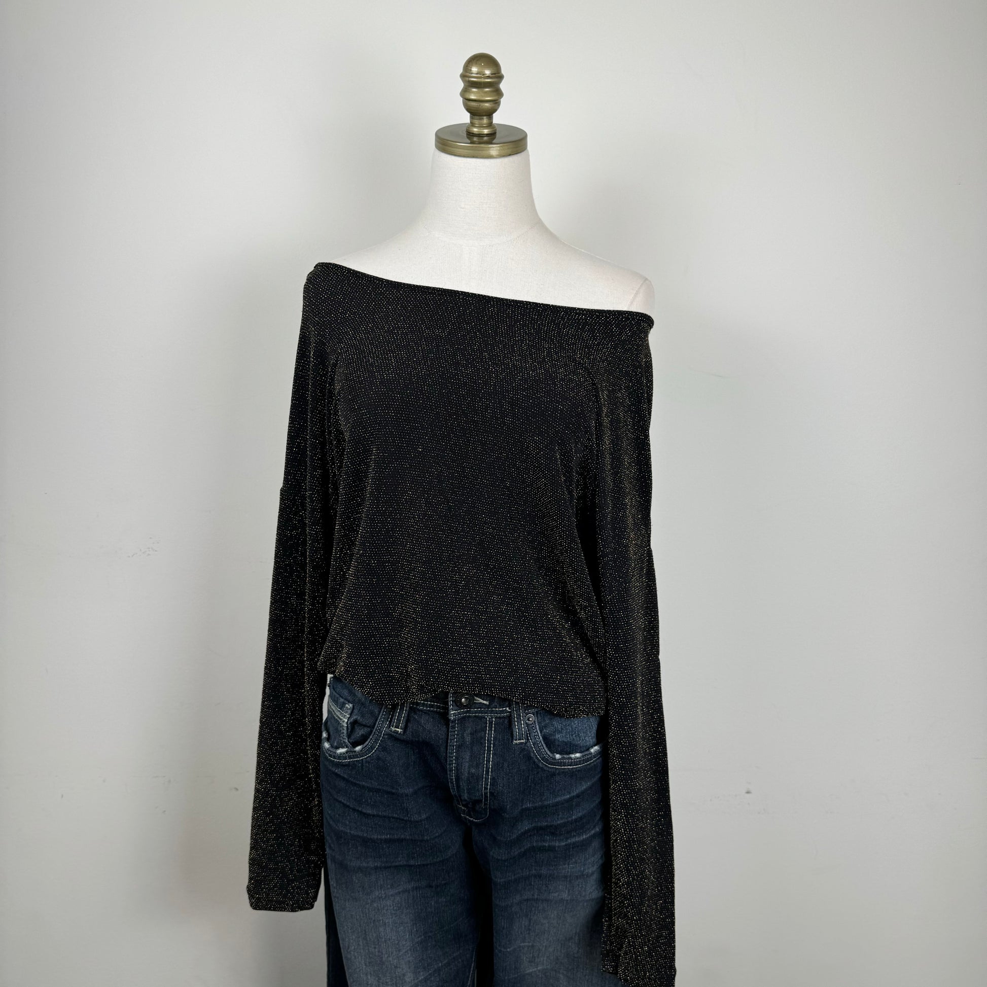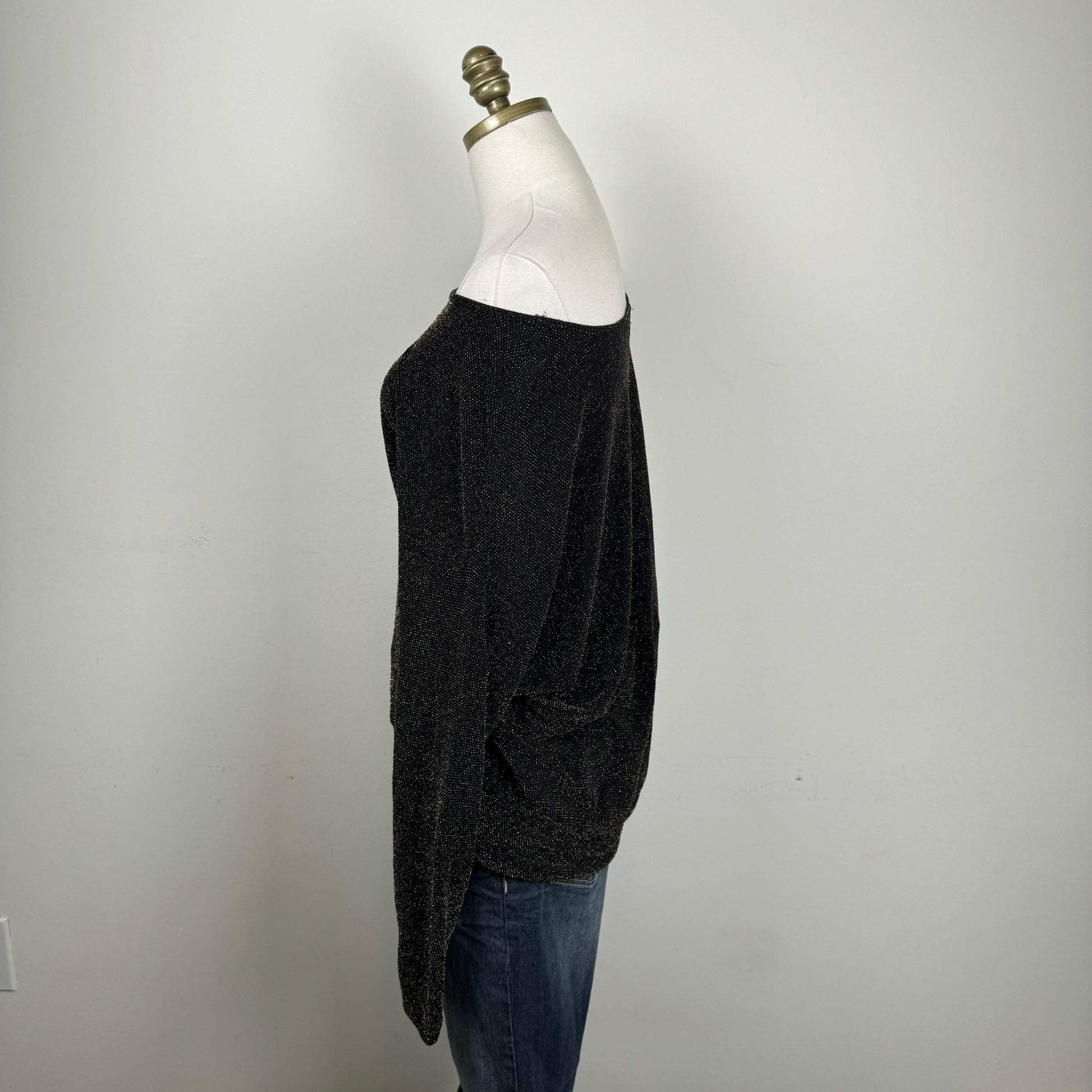 Details: Black and gold sparkly off-shoulder top with a draped design.