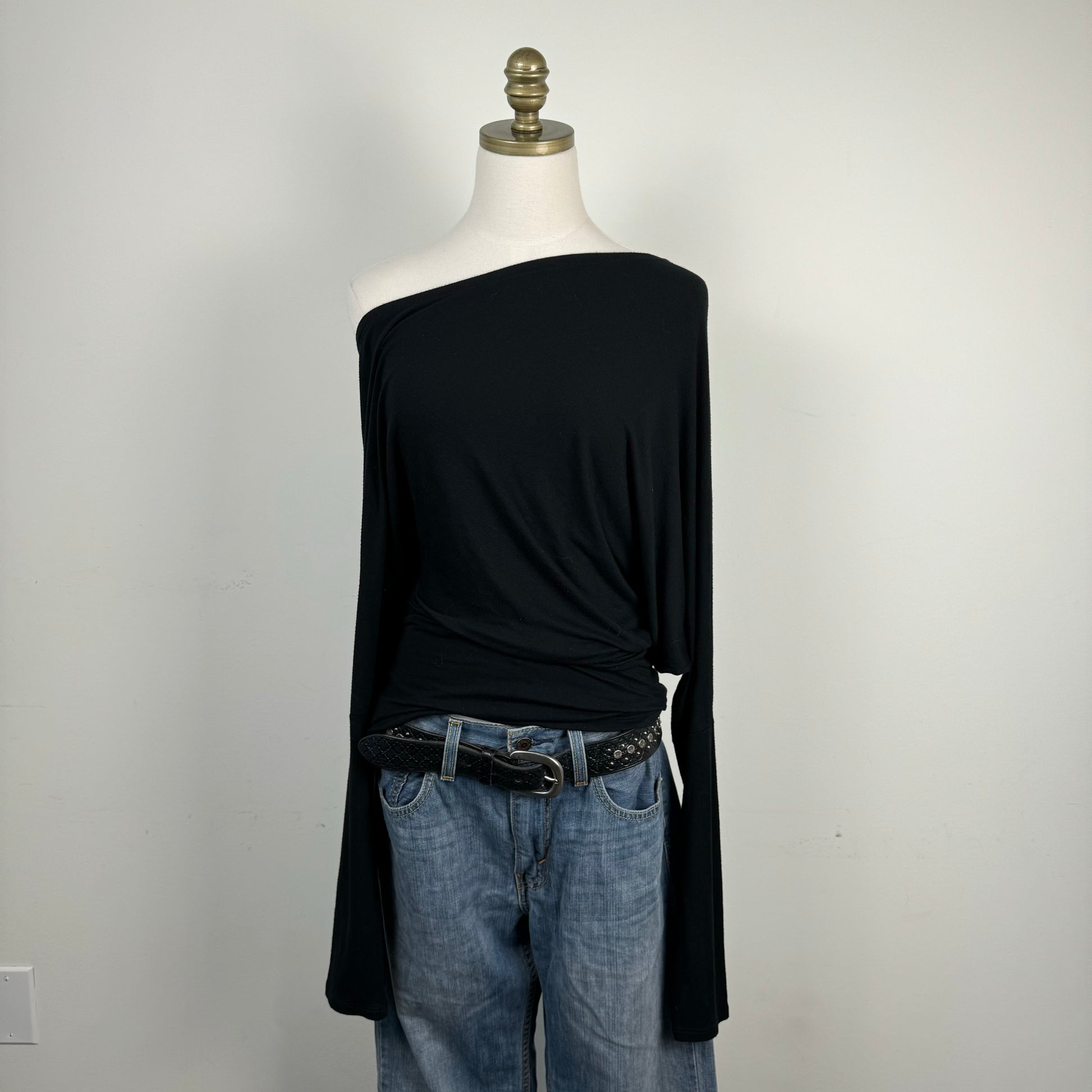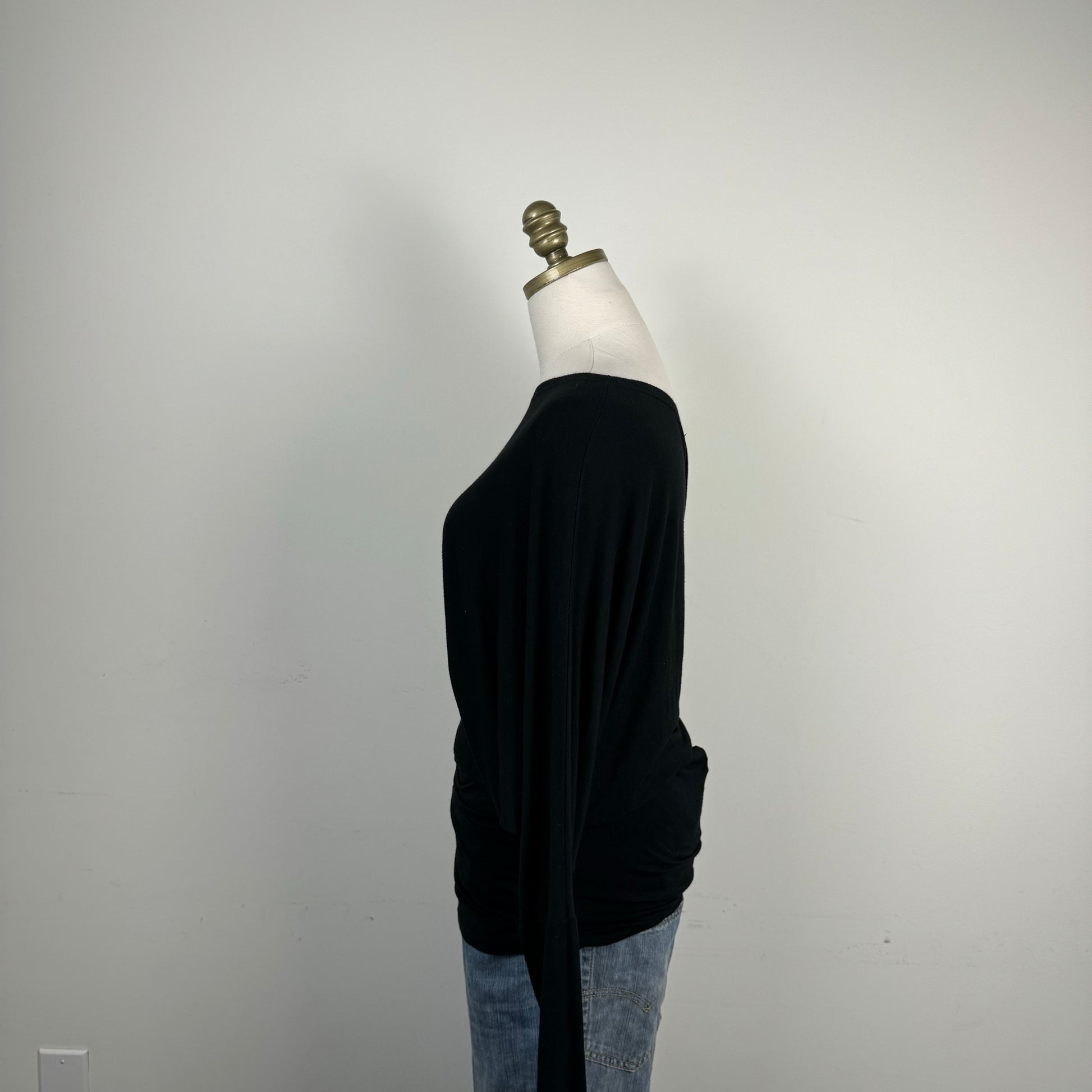 Black Asymmetric Draped Off Shoulder Long Sleeve Top