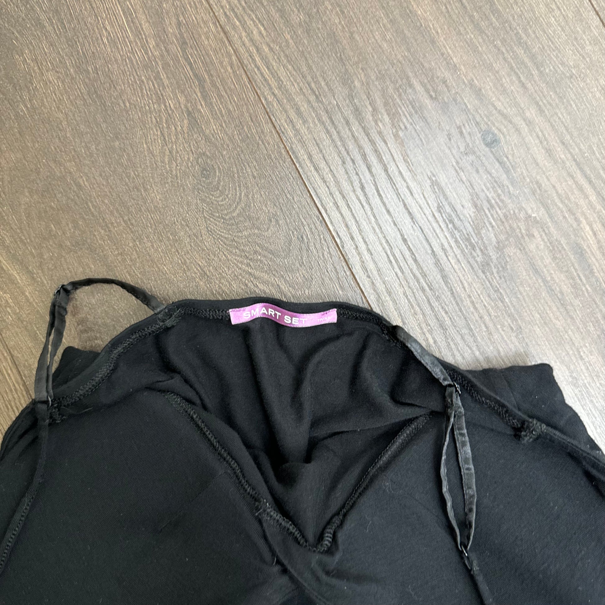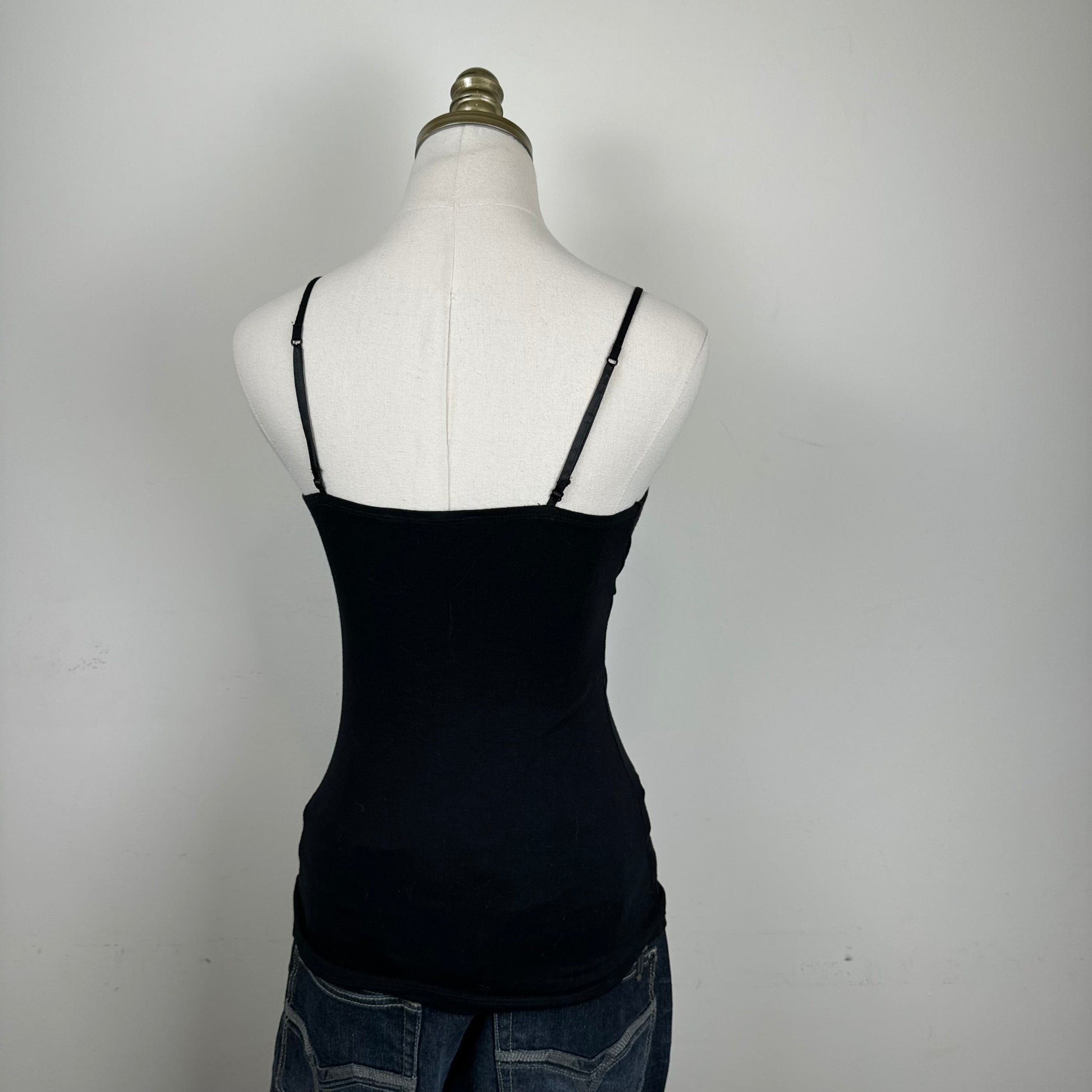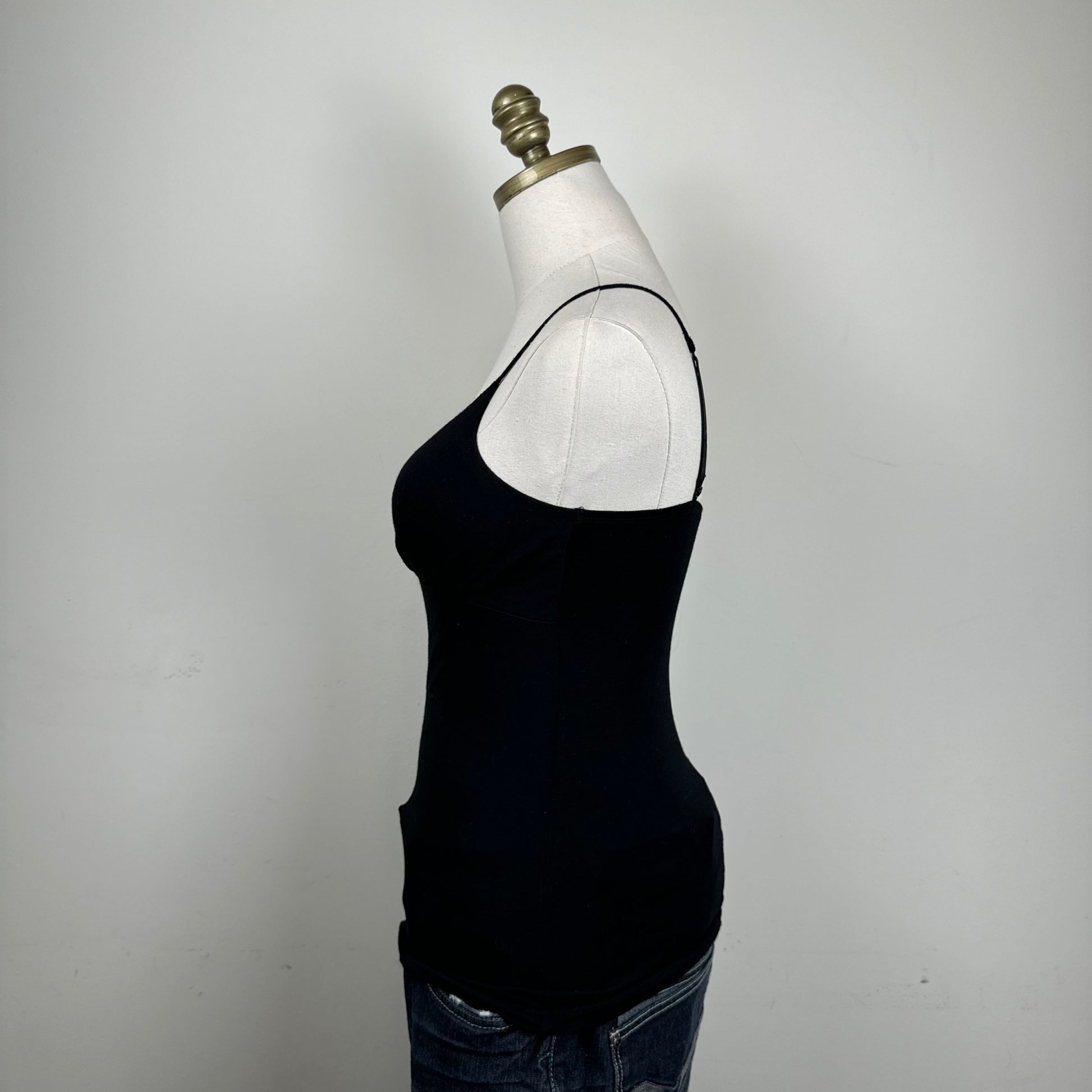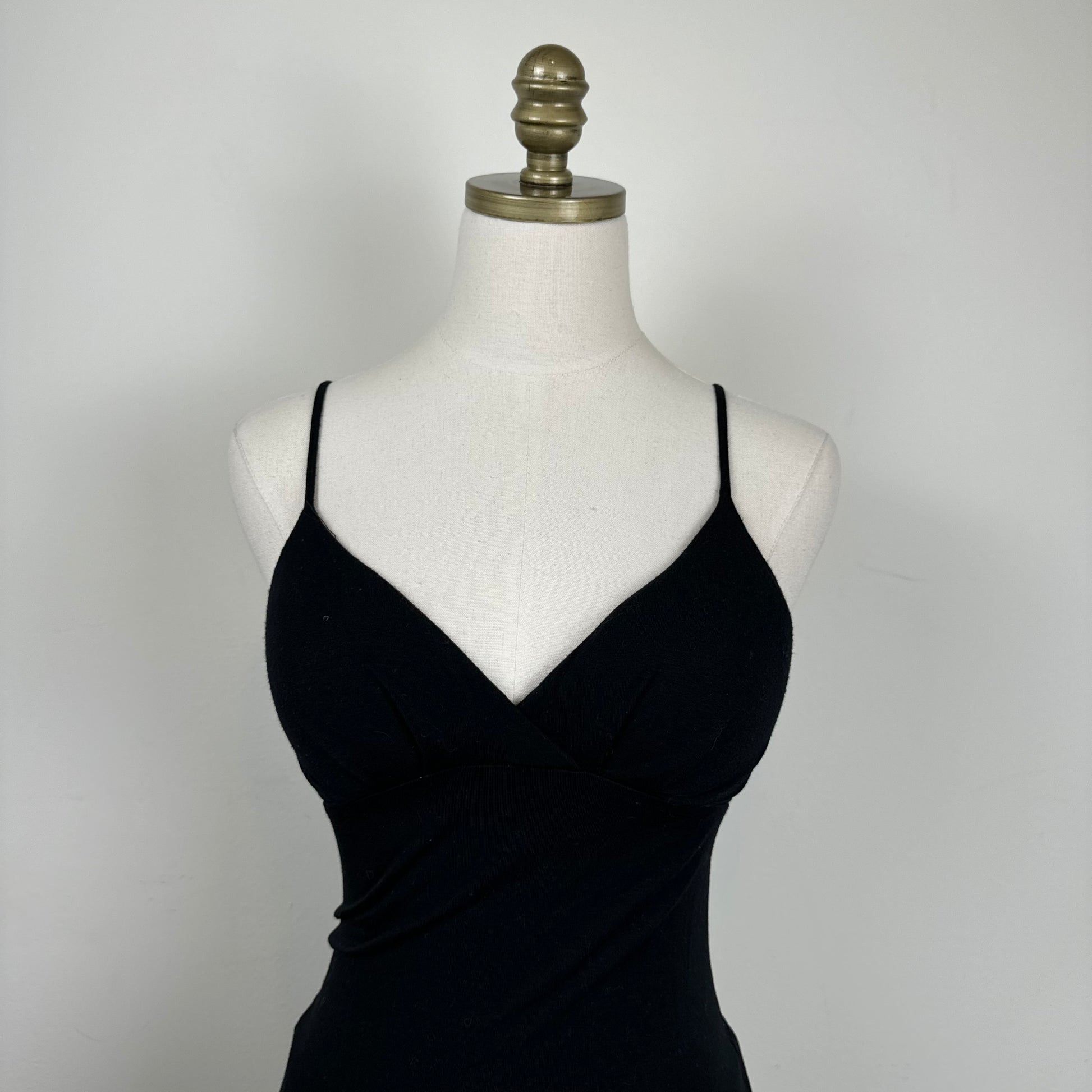 Details: Black fitted cami top in a babydoll style, with built-in bra cups.