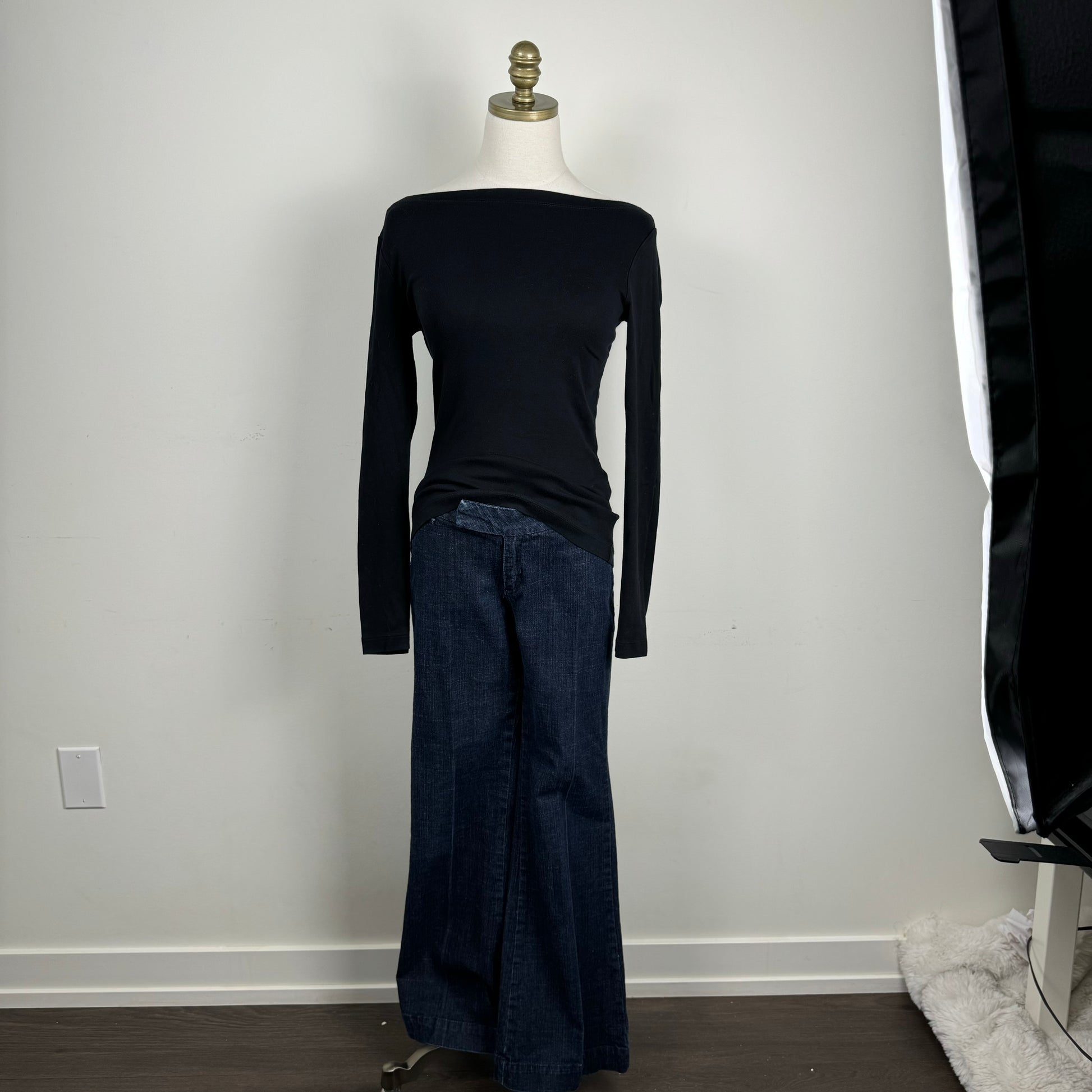 Details: Black fitted boat neck long sleeve cotton knit top.