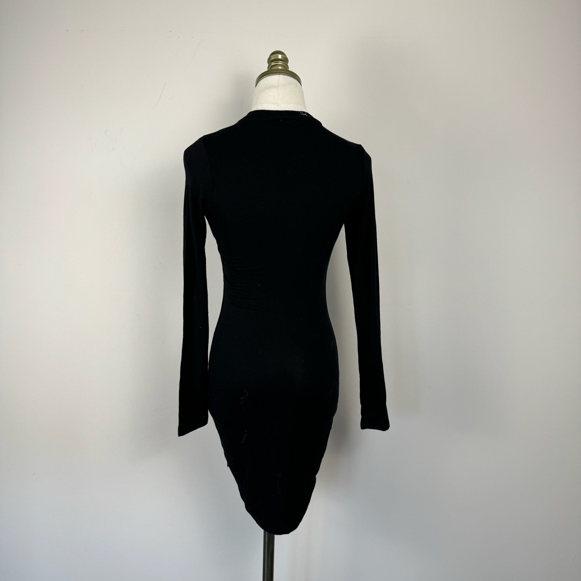 Details: Form-fitting black long sleeve mini dress with a flattering silhouette.