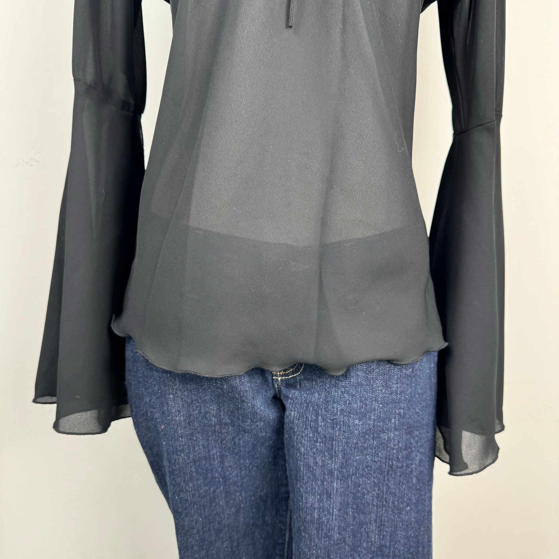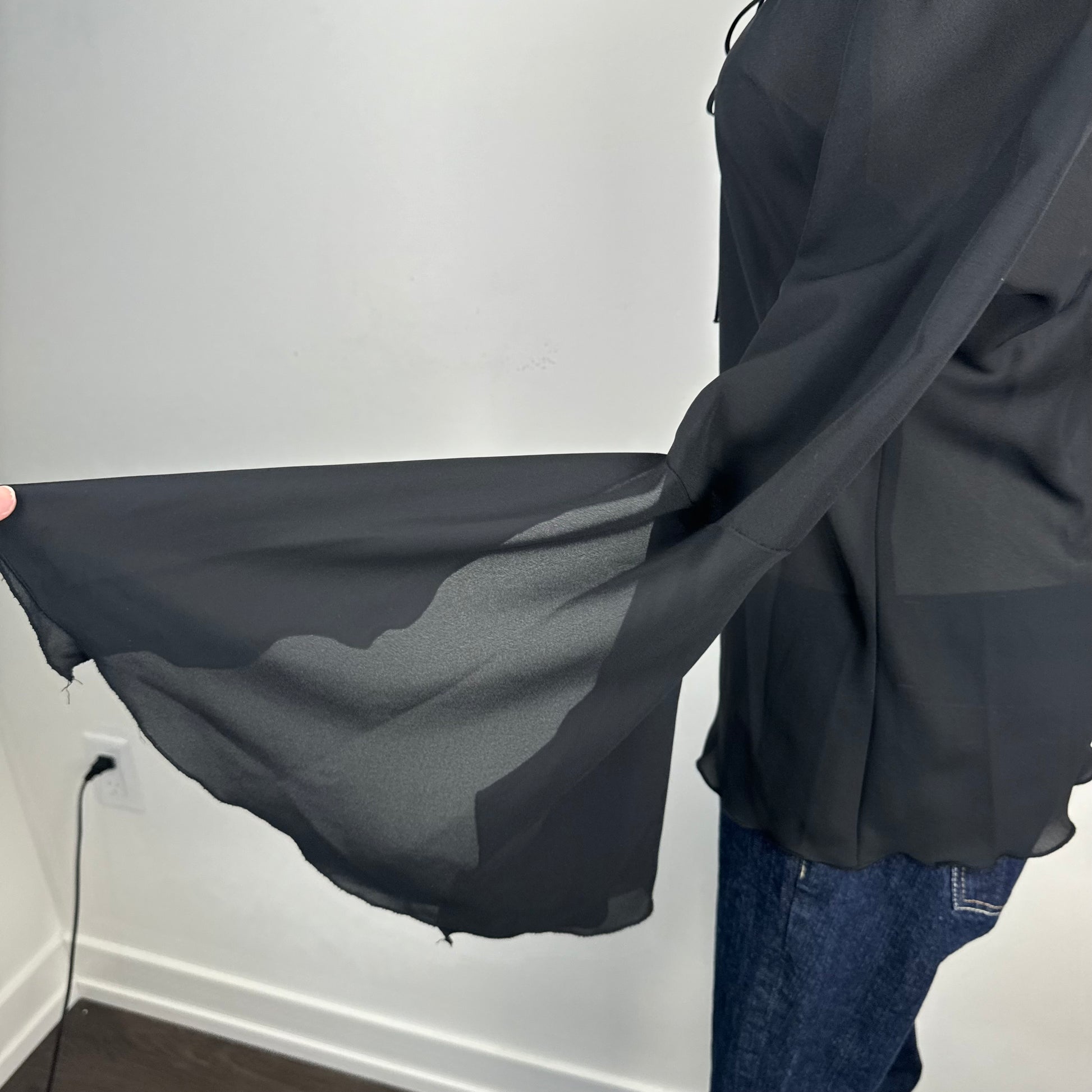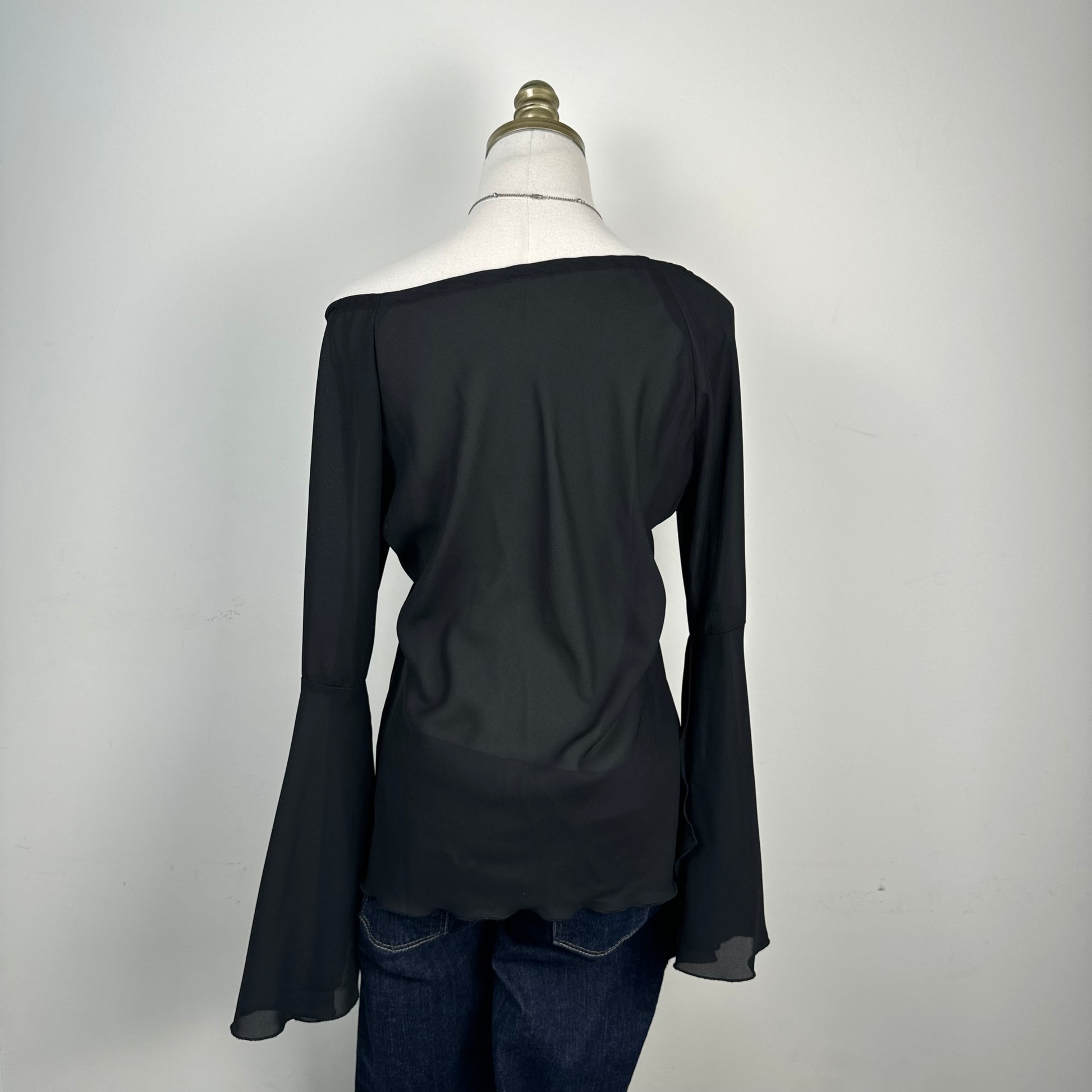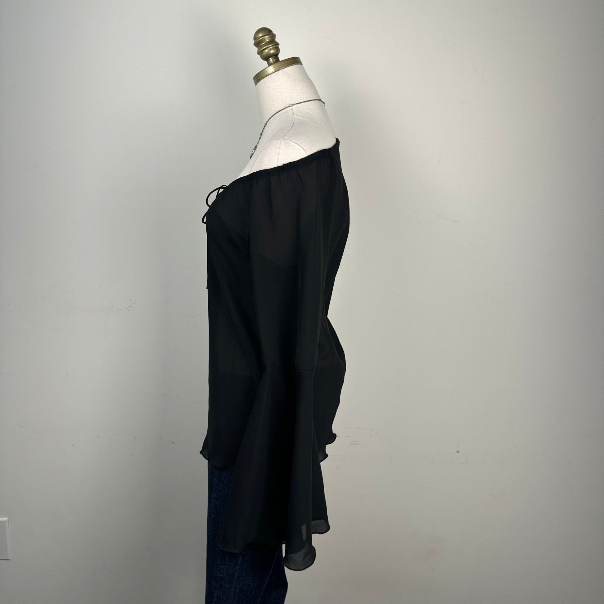 Details: Black chiffon off-shoulder top with bell sleeves and tie-up detail at the neckline.