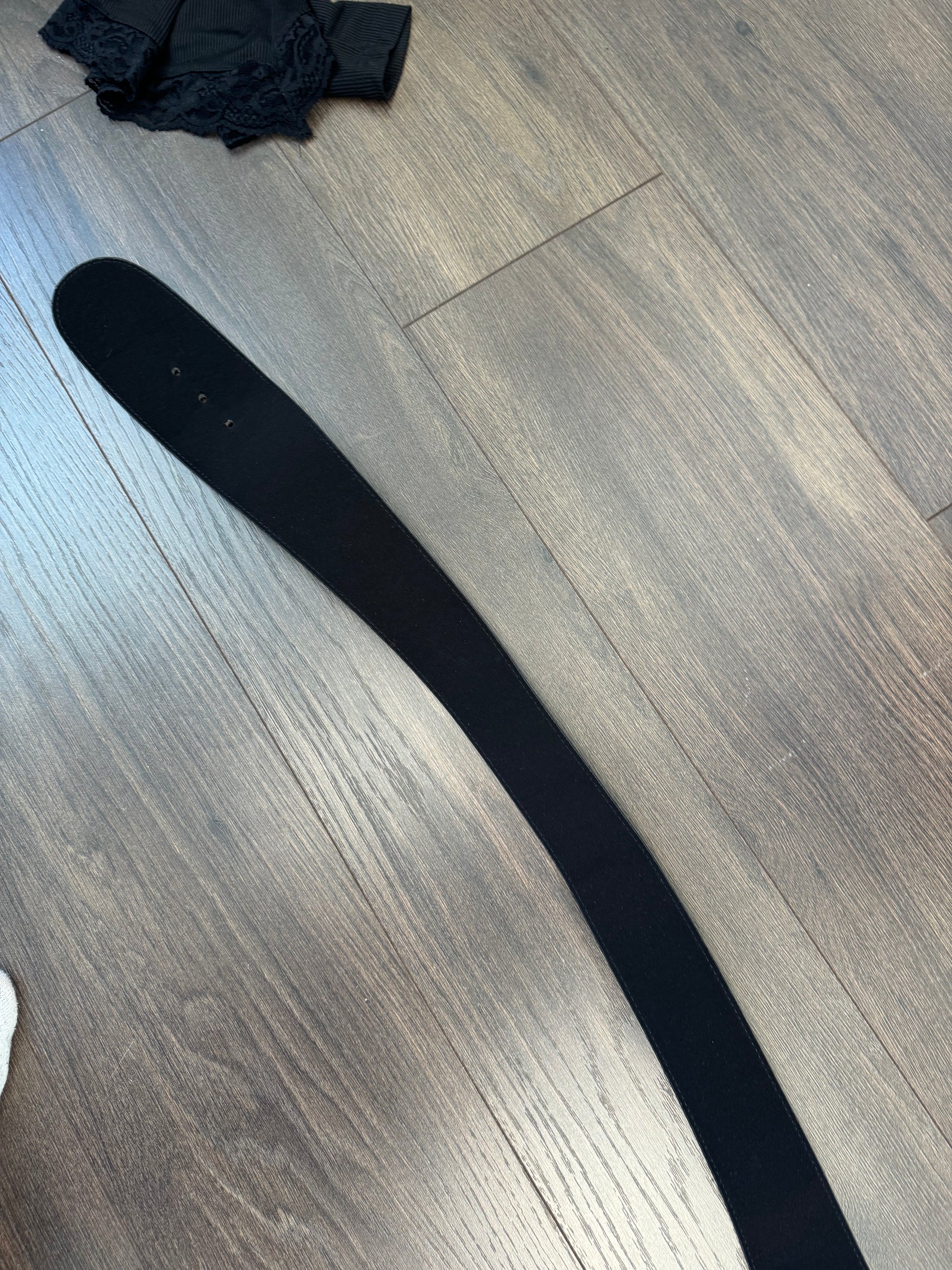 Details: Black chunky leather belt with a large round gold buckle, Paloma Wool style.