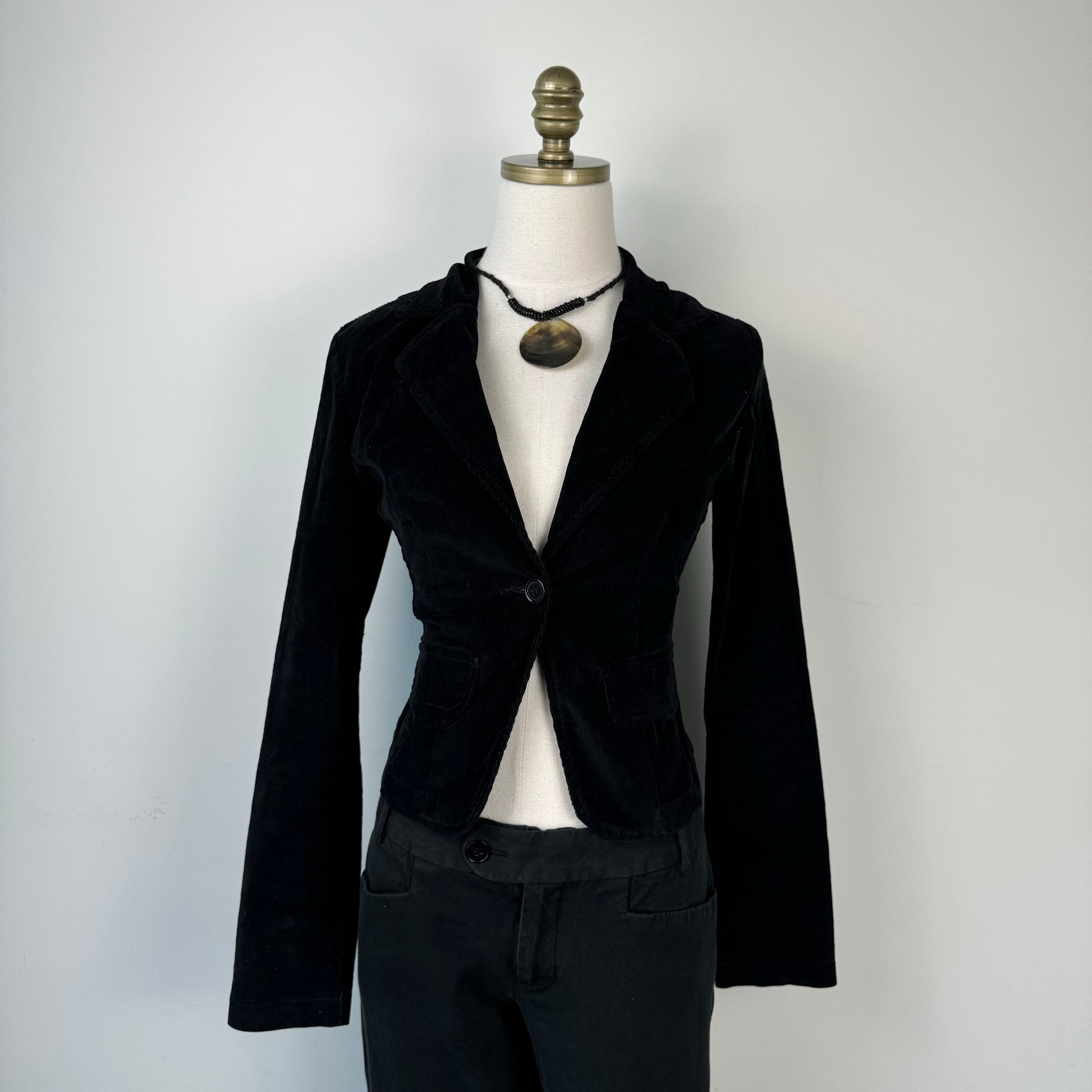Details: Black fitted blazer in corduroy fabric with a deep neckline and black buttons.