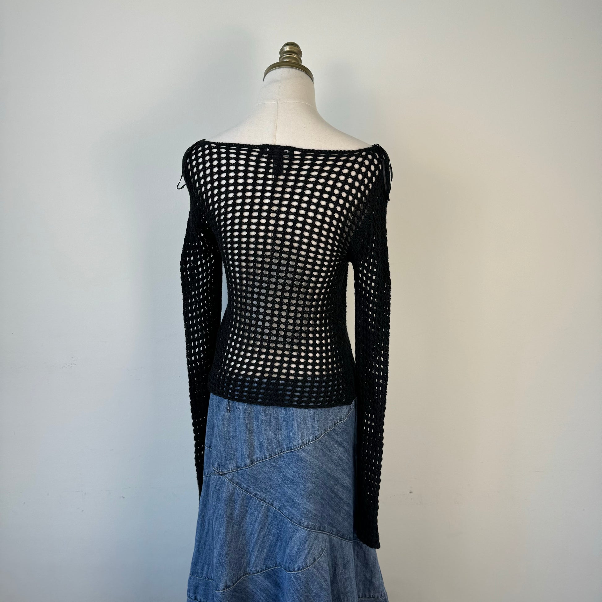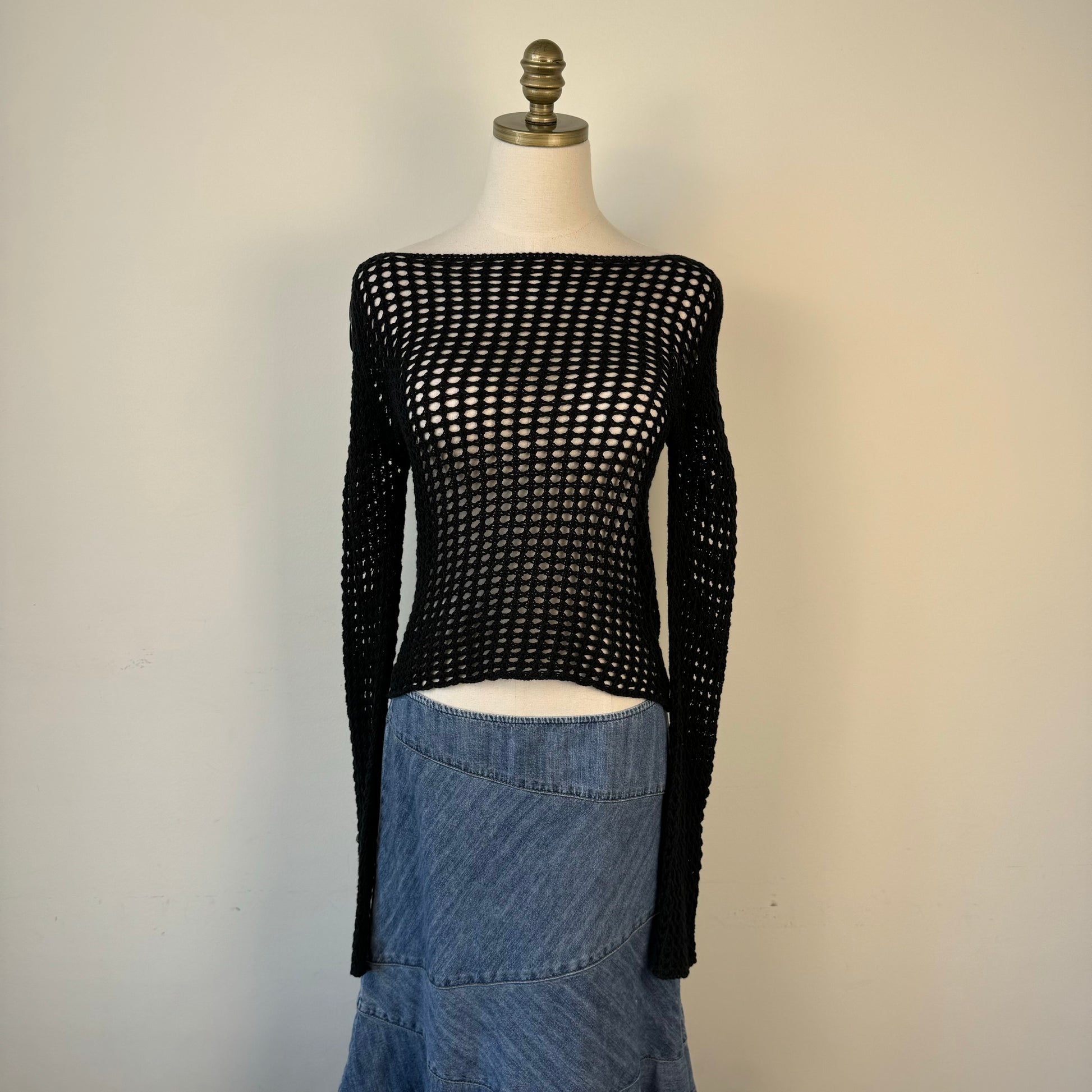 Details: Black long sleeve sweater with crochet open mesh knit design, boat neck style.