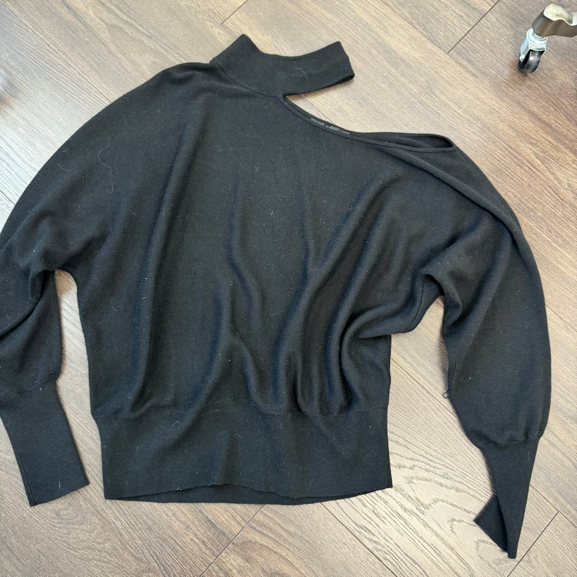 Details: Black knit dolman sweater with cut-out details.