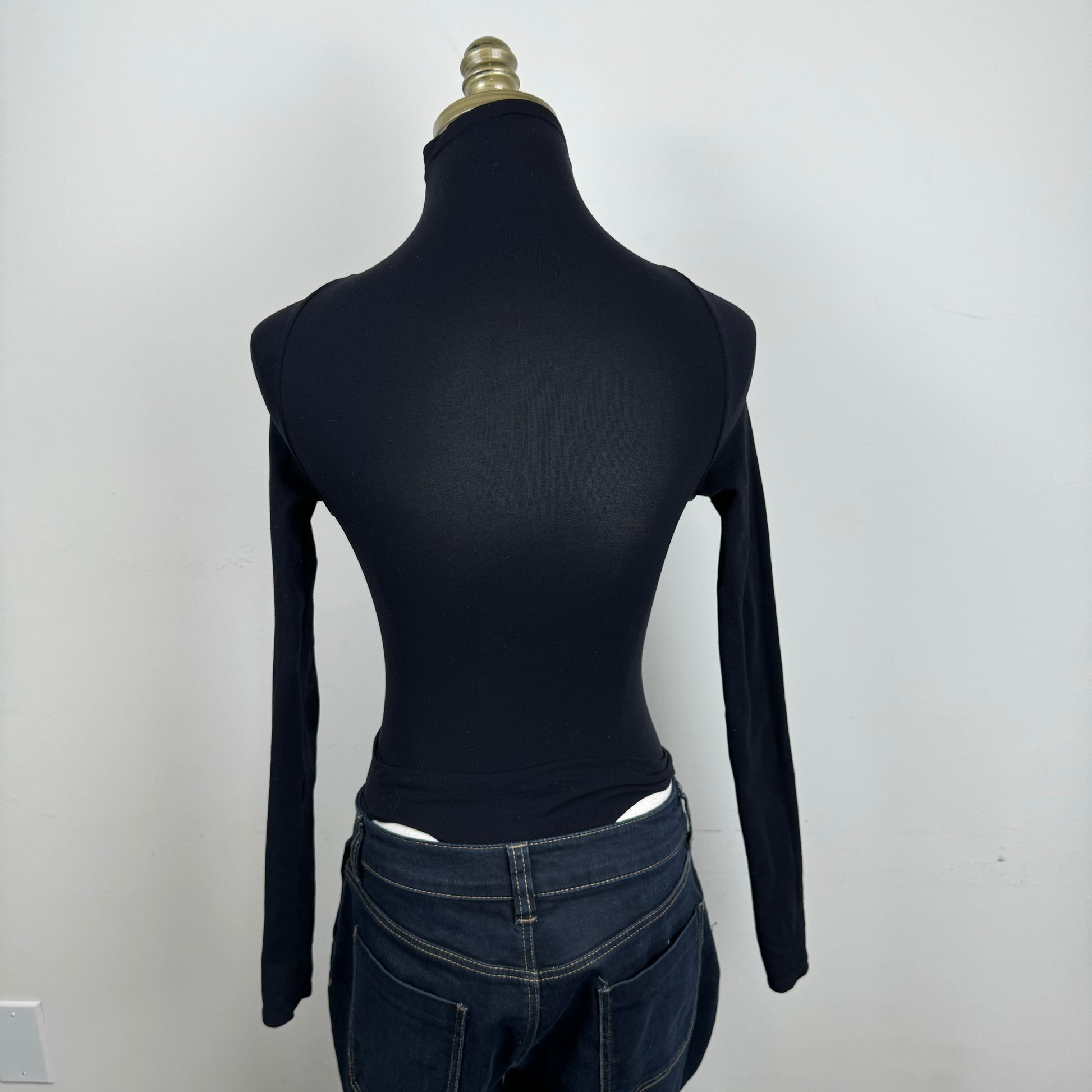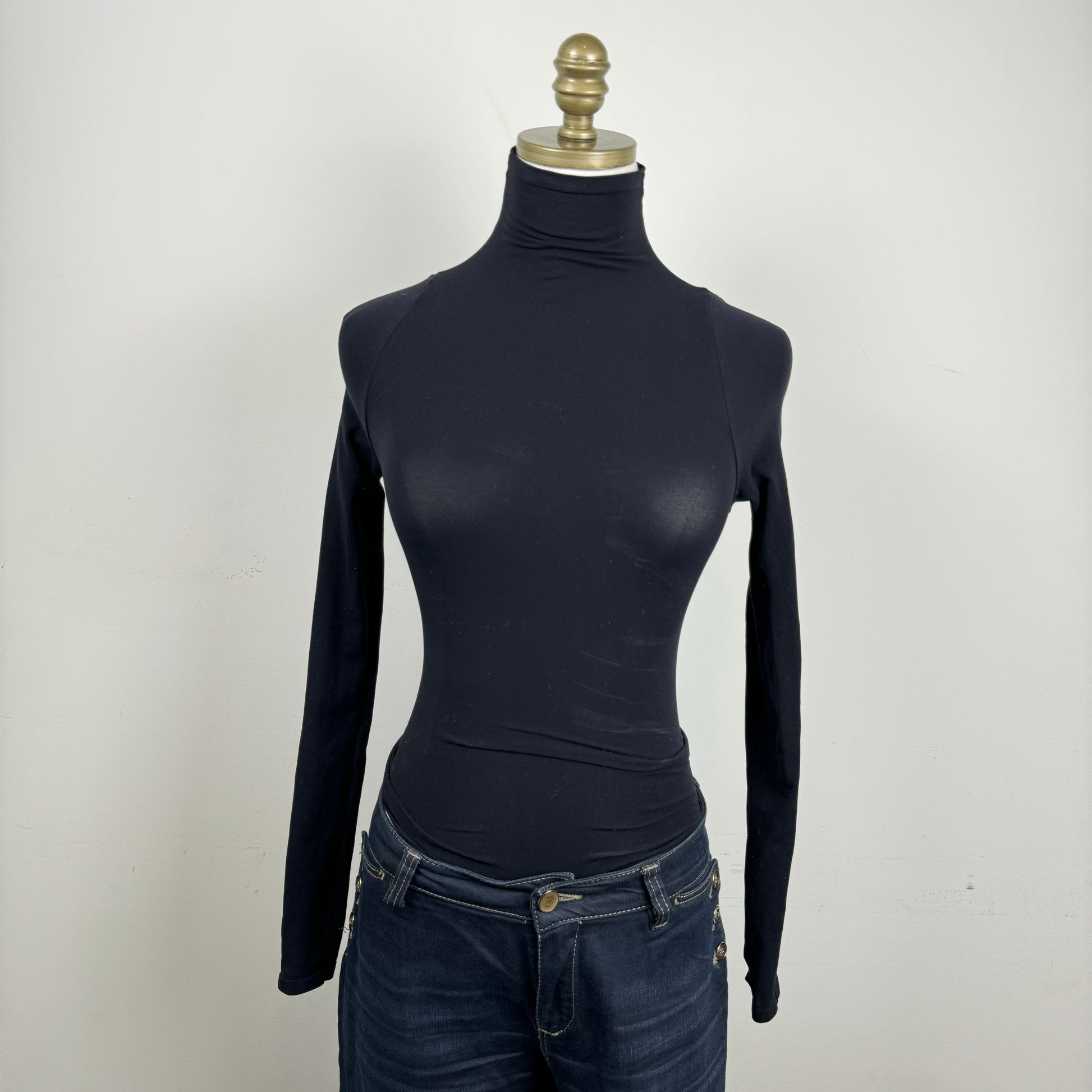 Details: Black fitted turtleneck bodysuit with long sleeves.