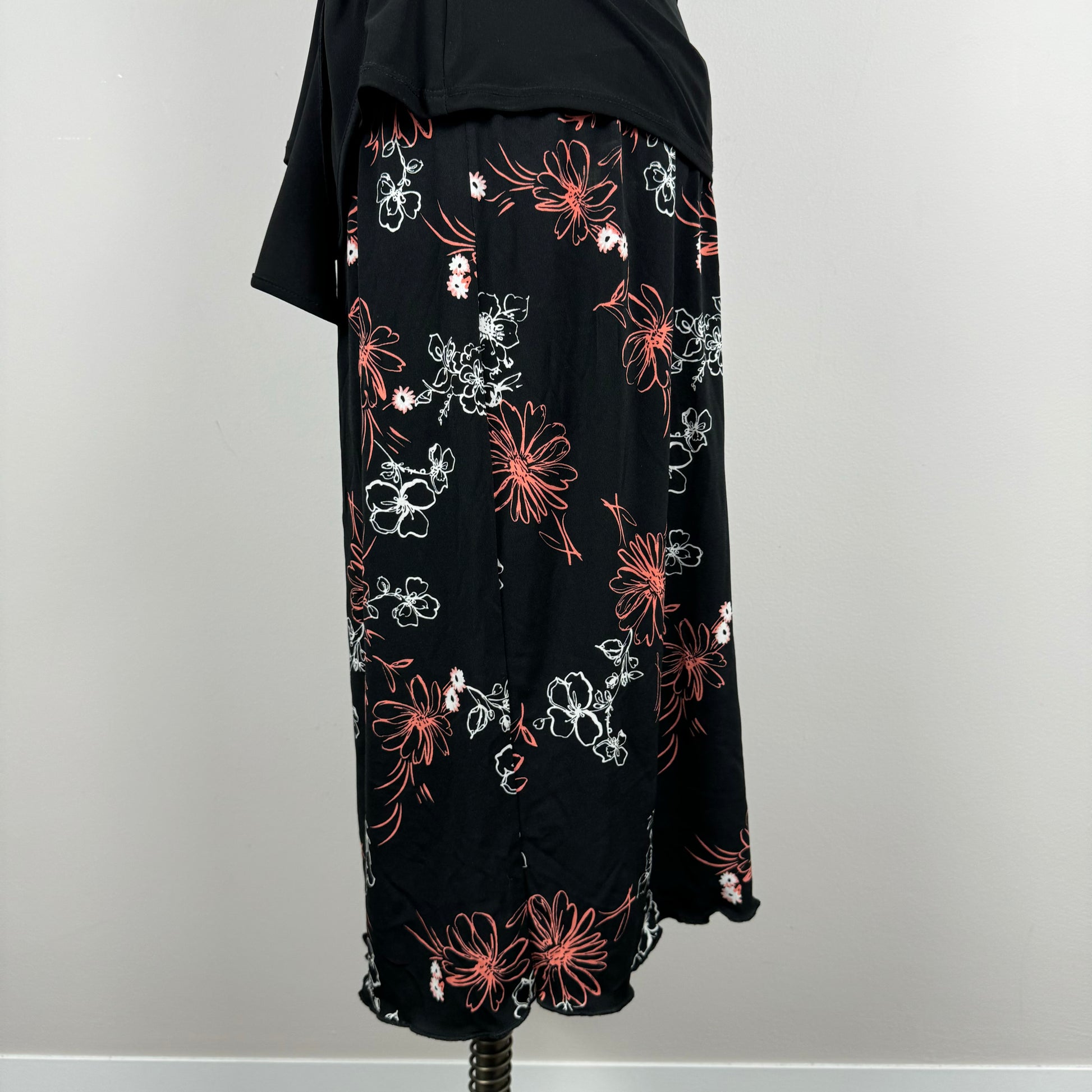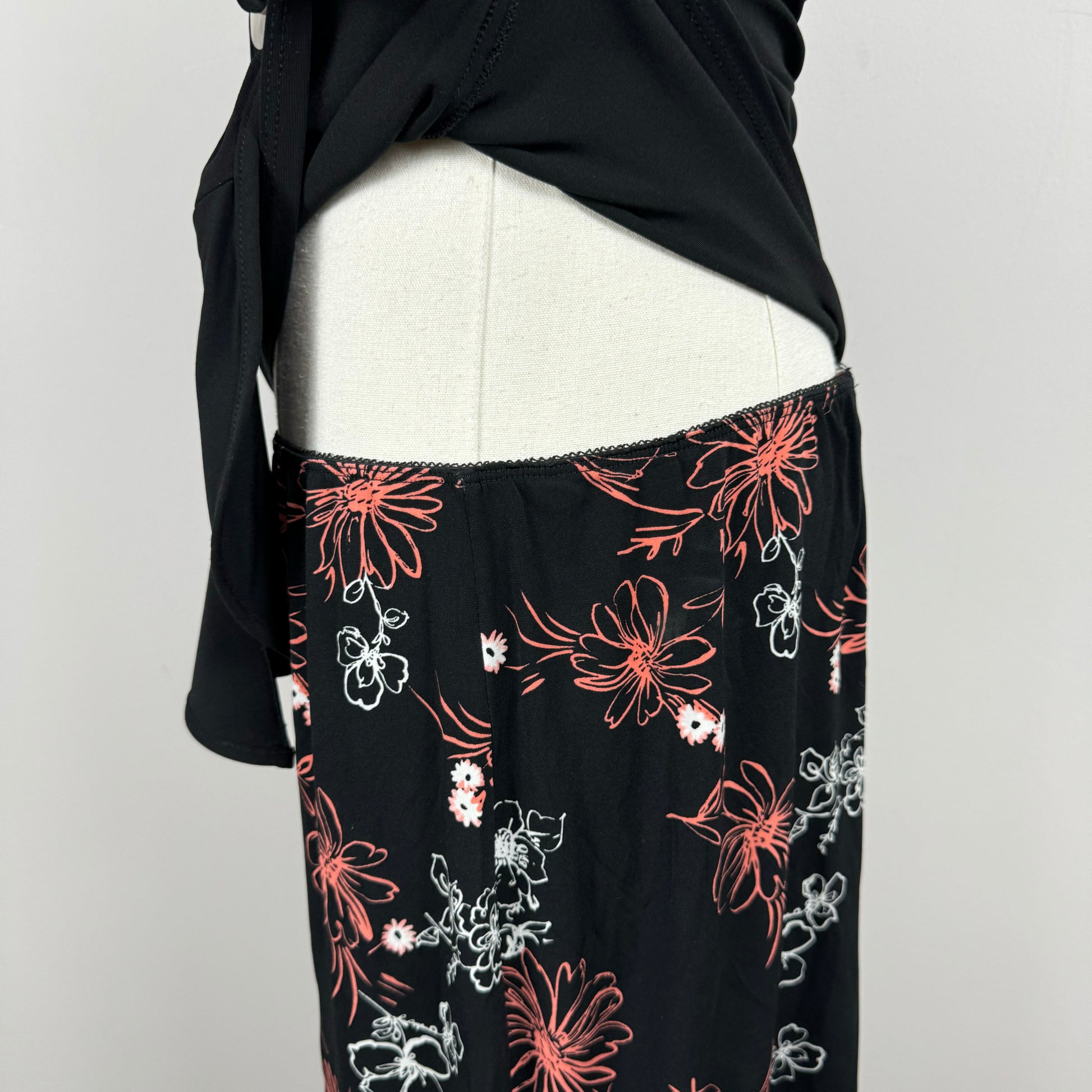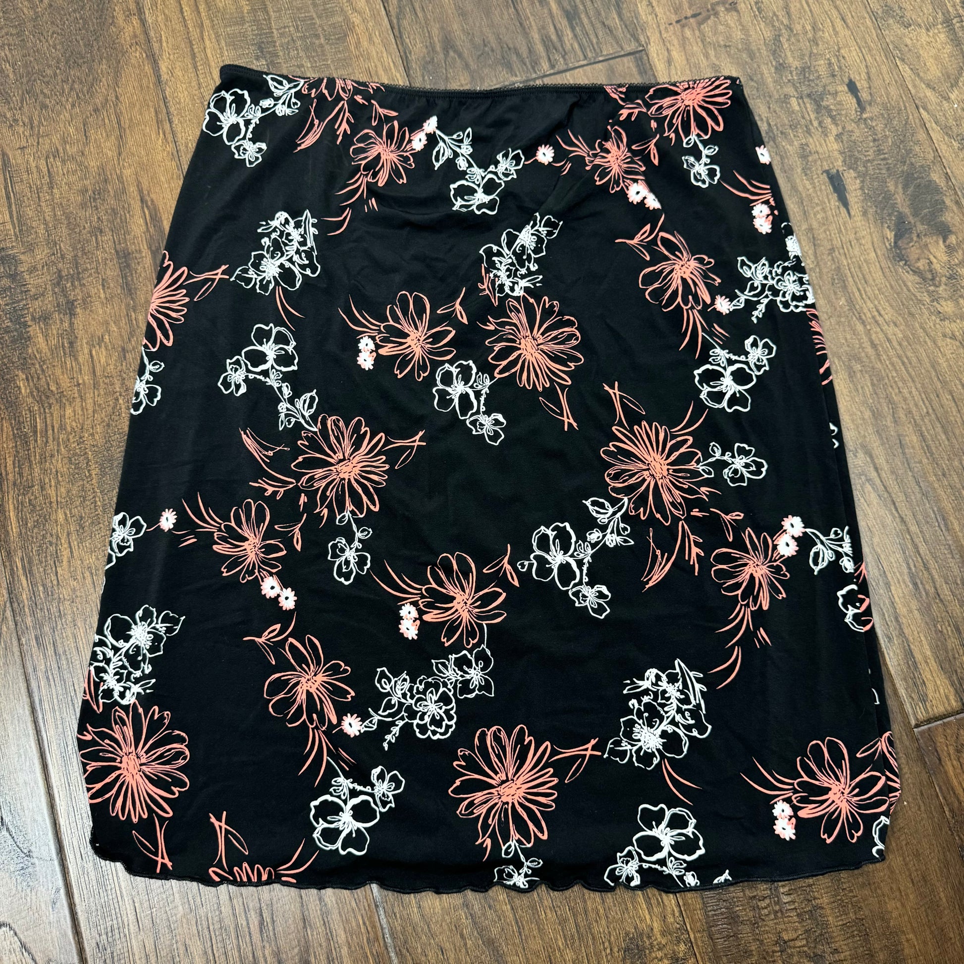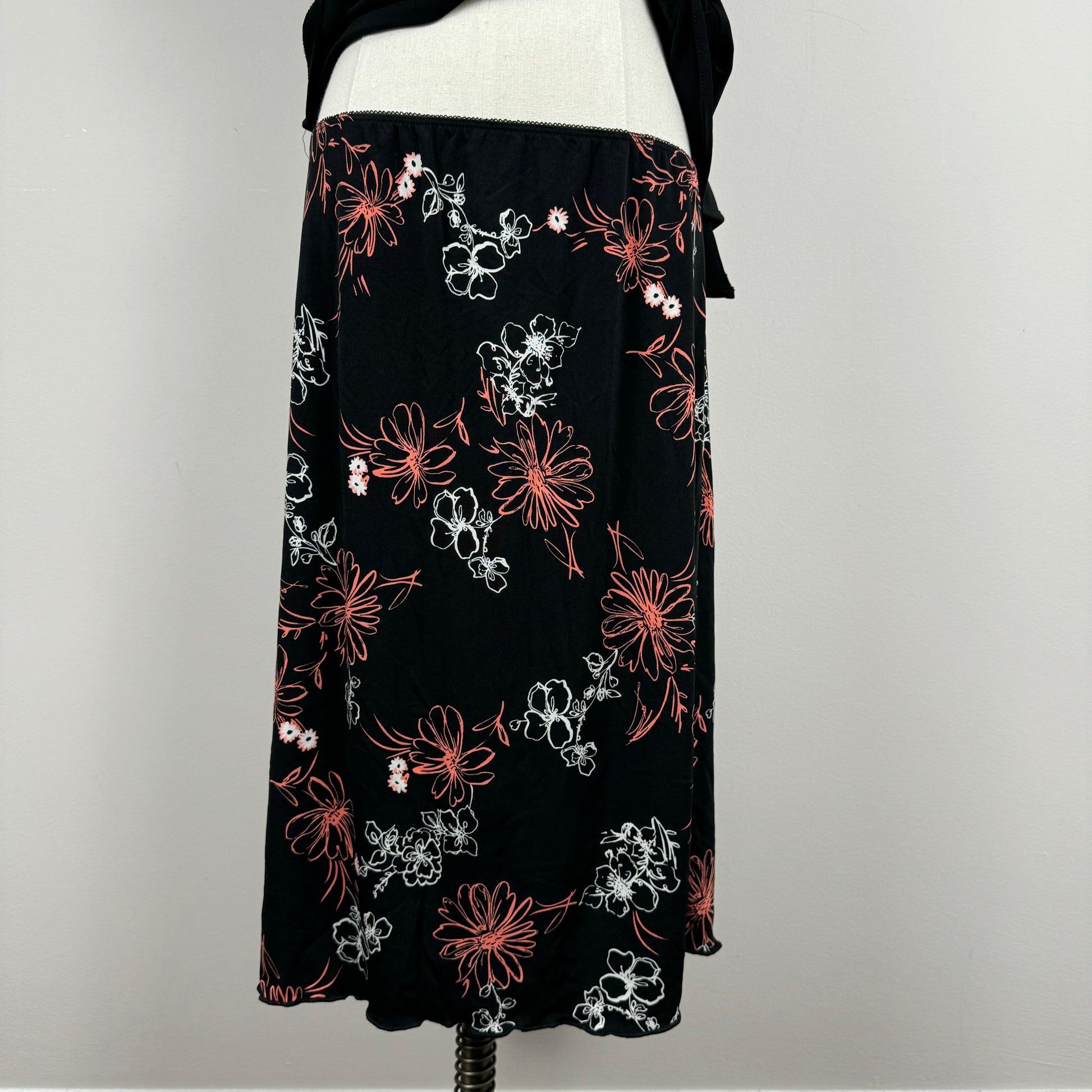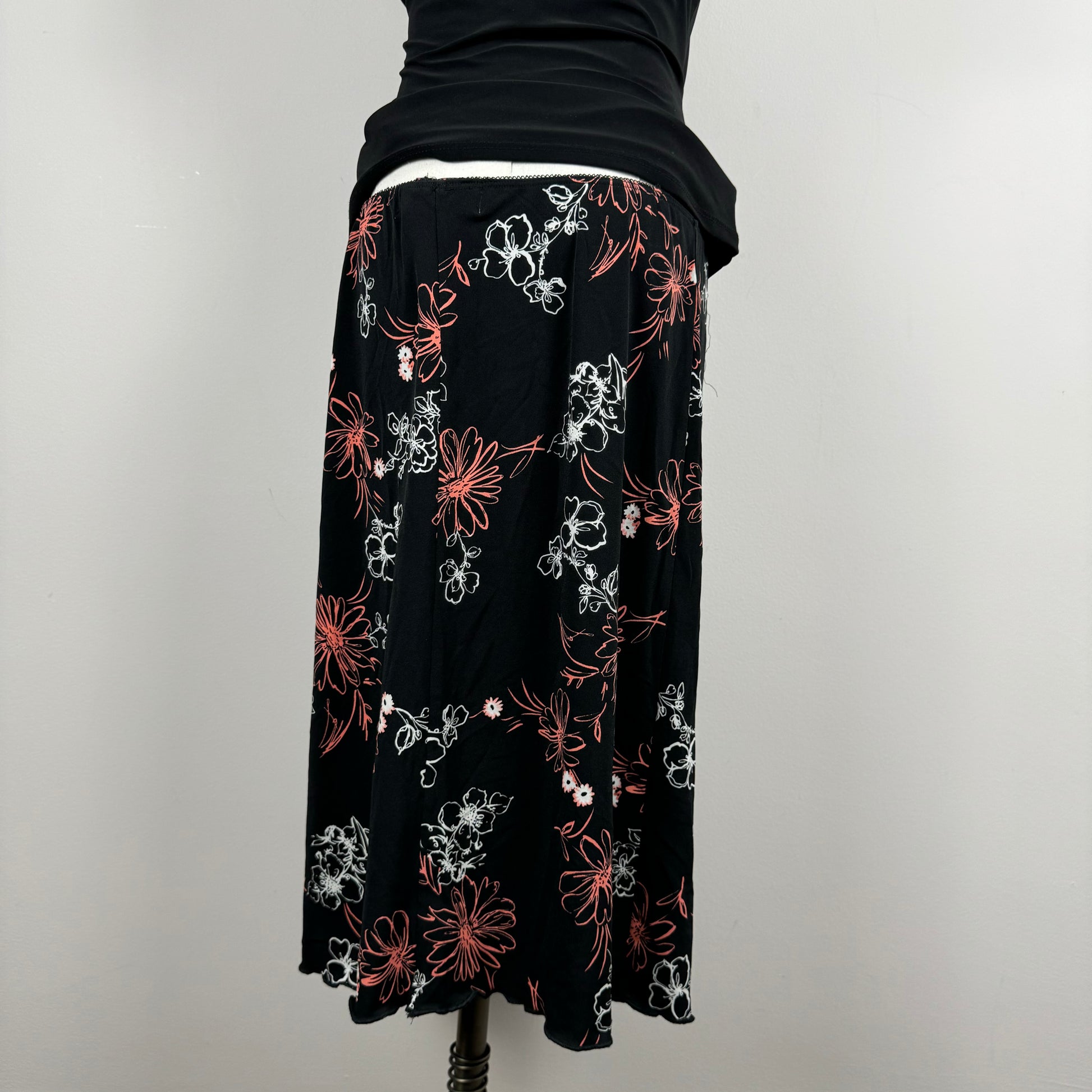 Details: Vintage midi skirt in black with floral print in pink and white colours.