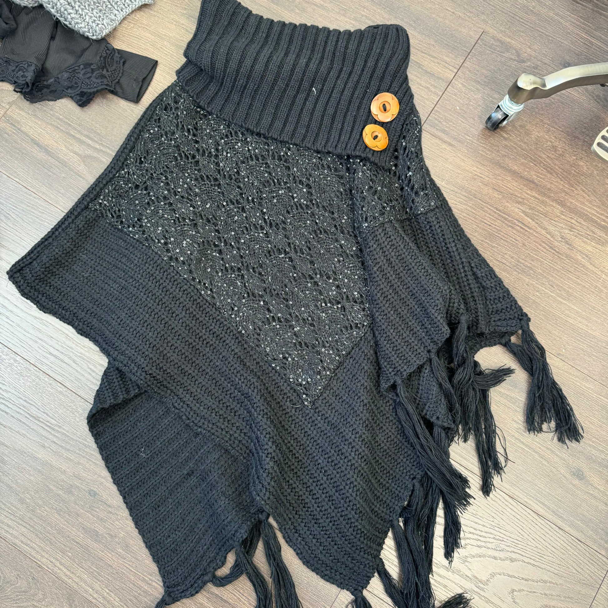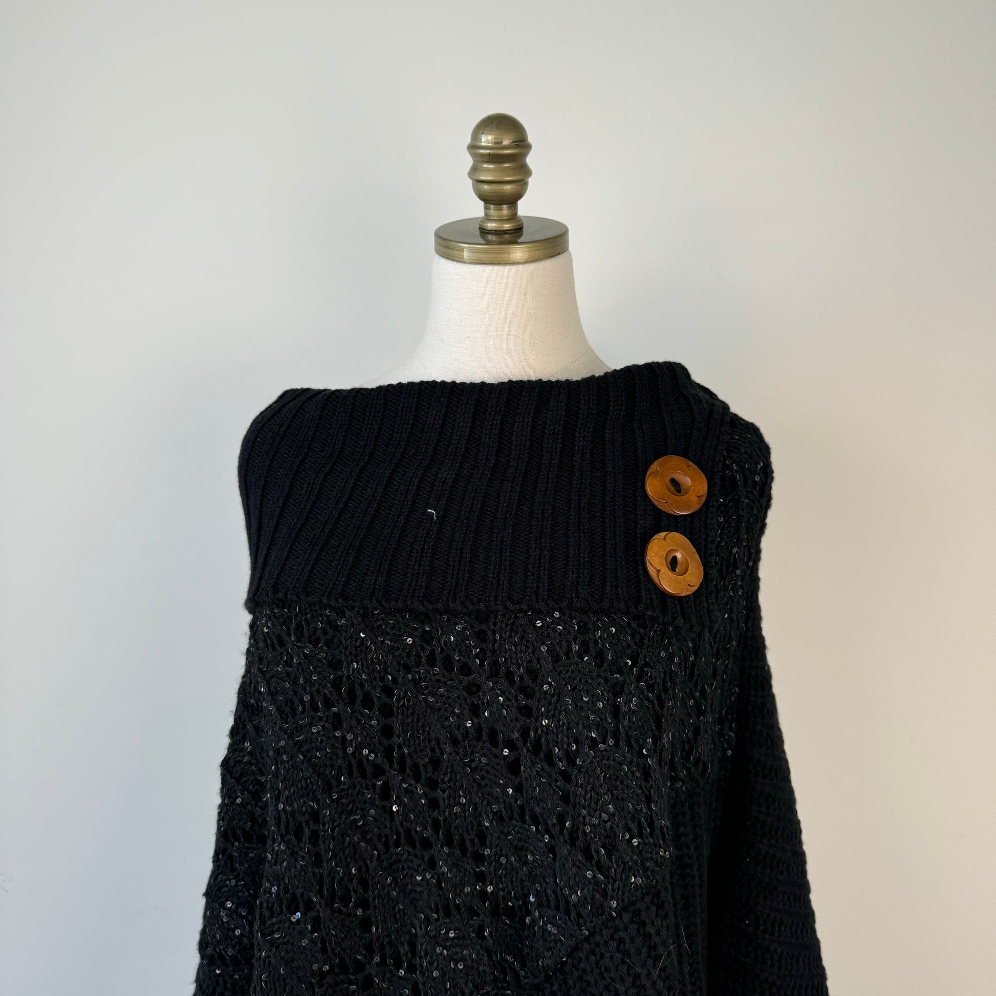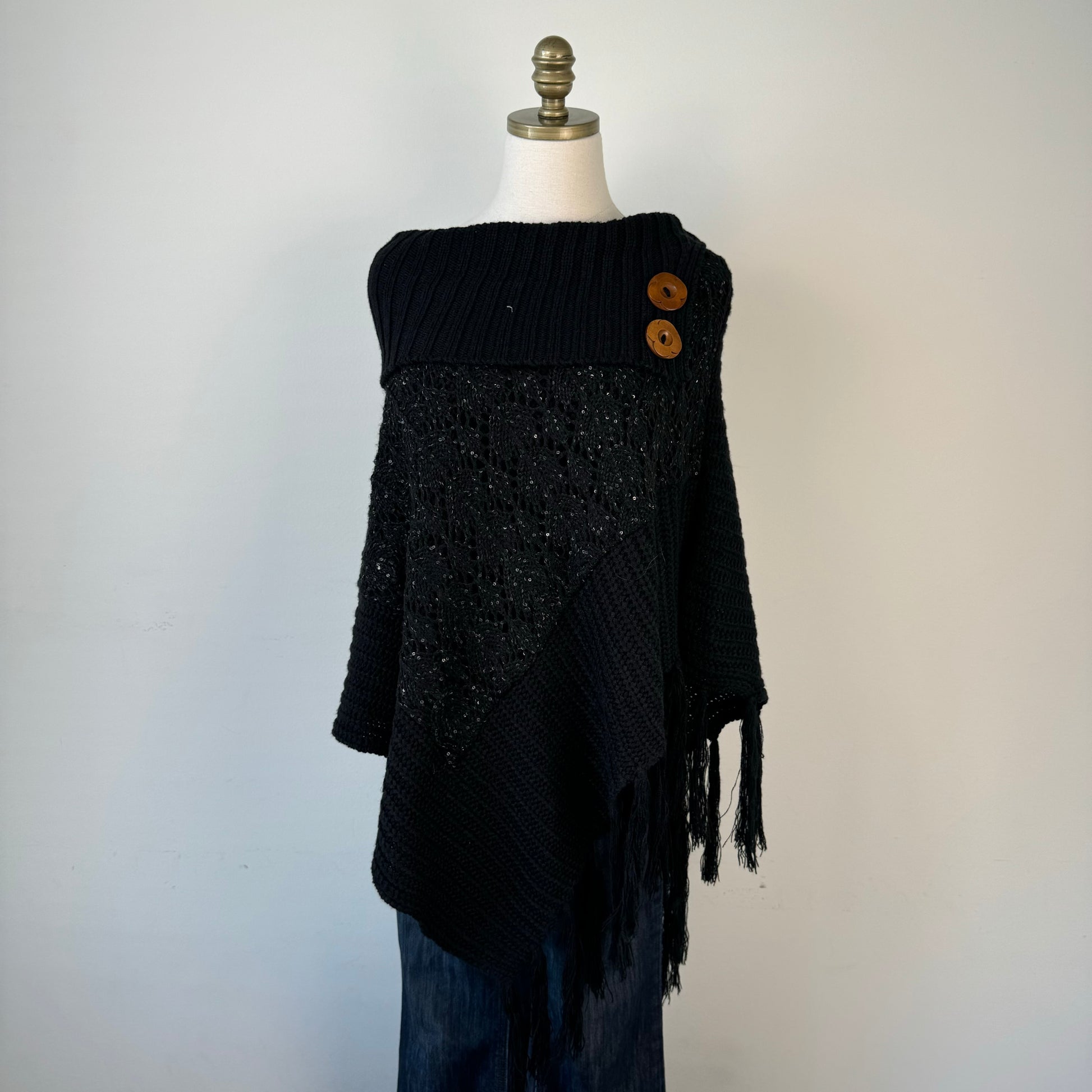 Details: Black vintage style knit poncho with fringe and big brown buttons.