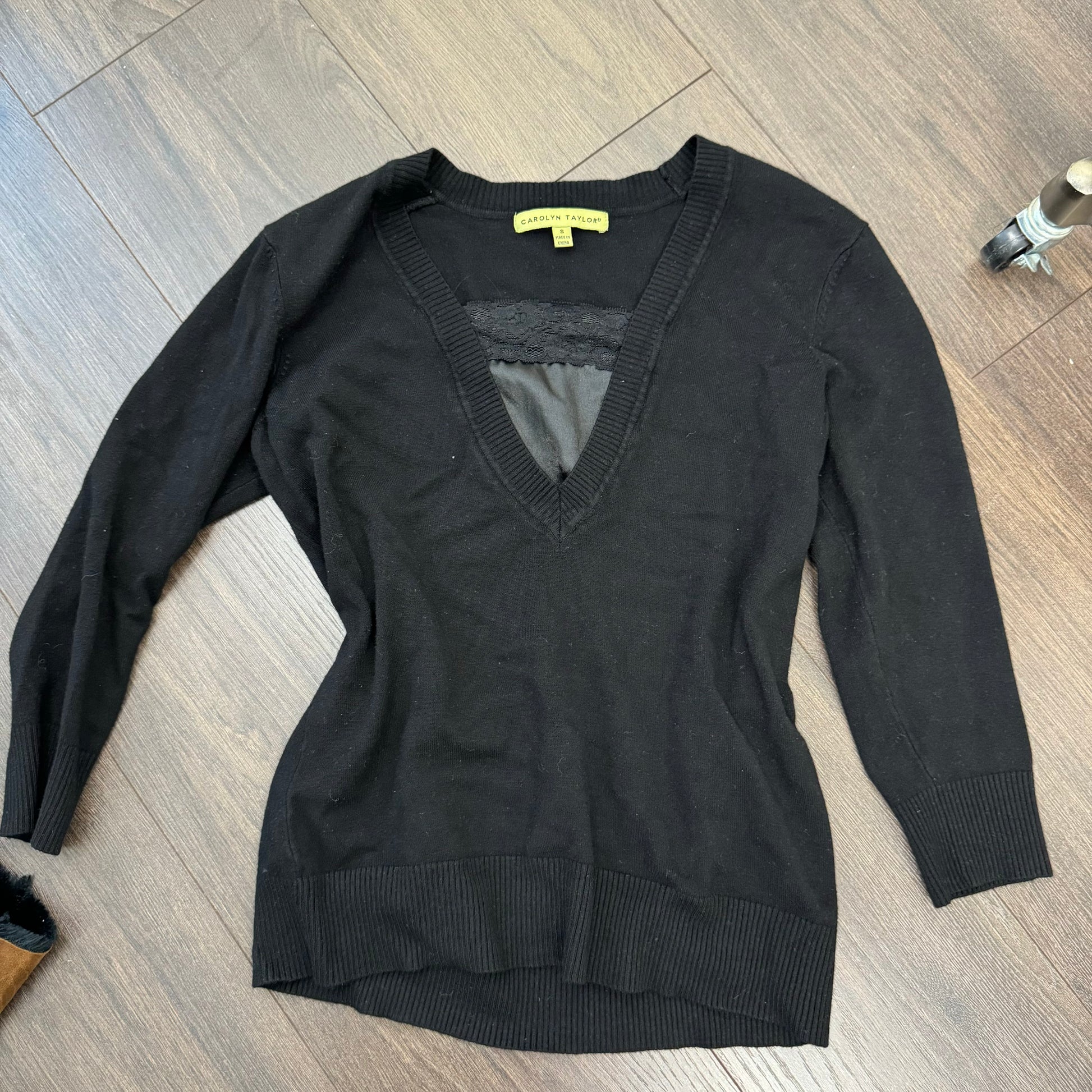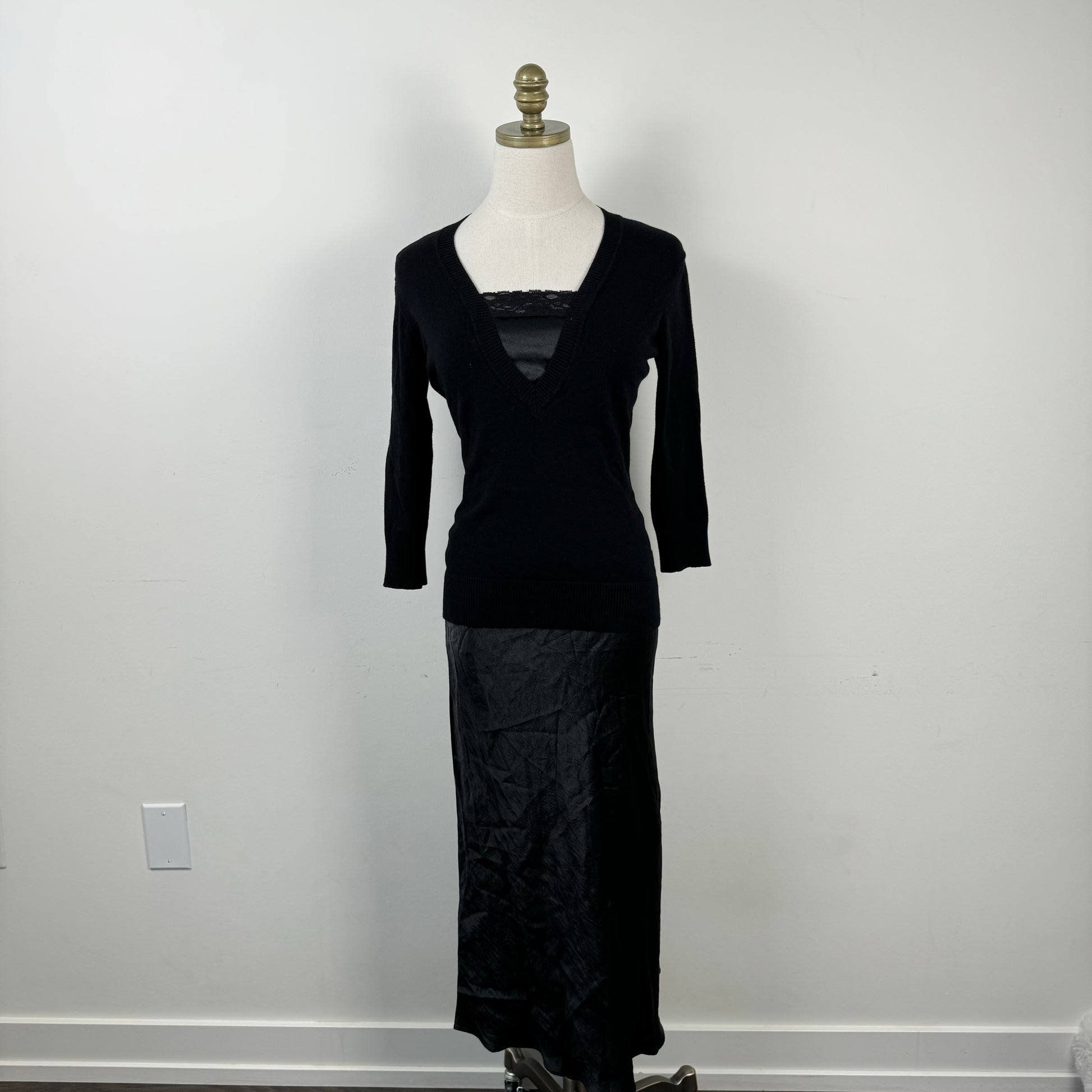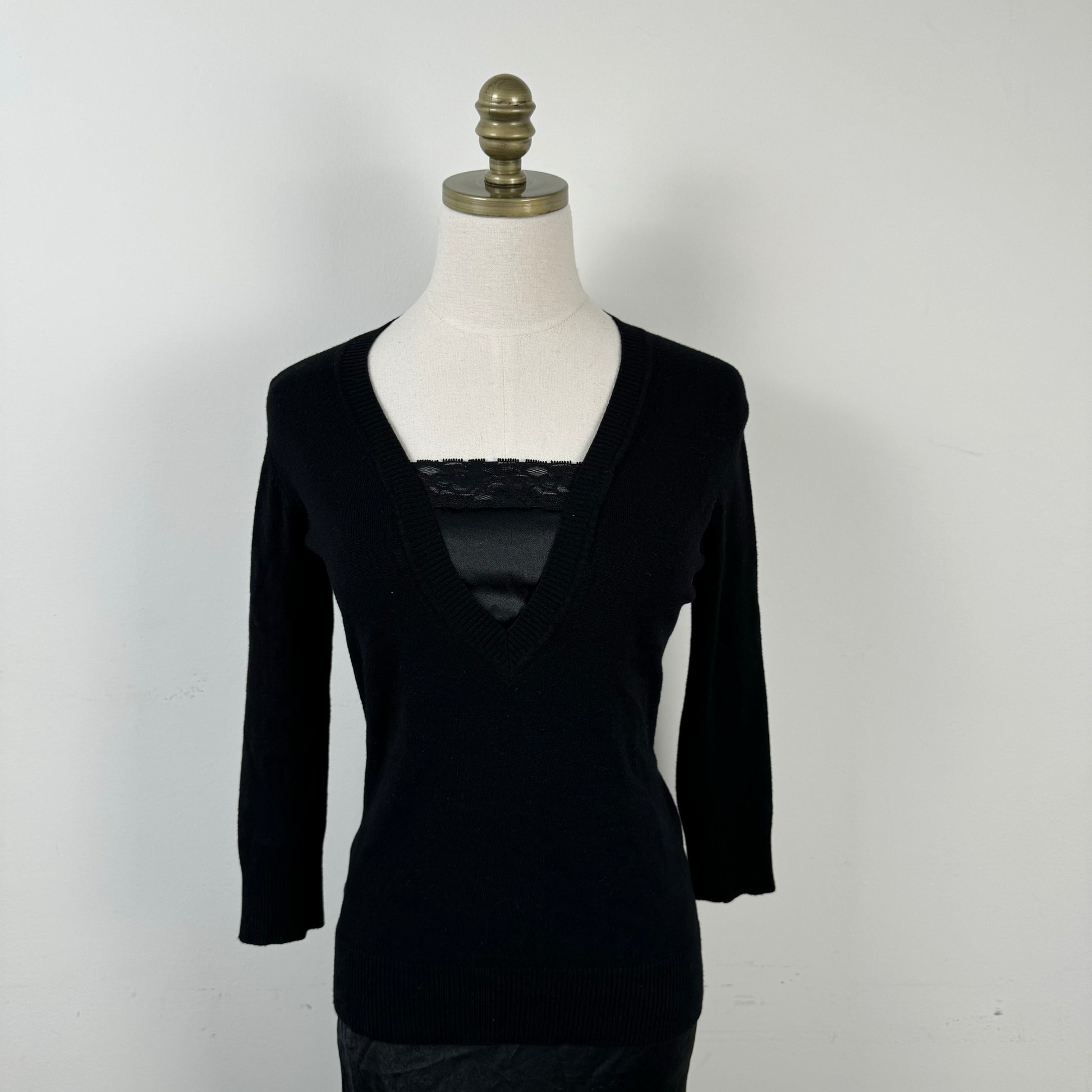 Details: Black knit top with silky lace trim layer underneath at the neckline and 3/4 sleeves.