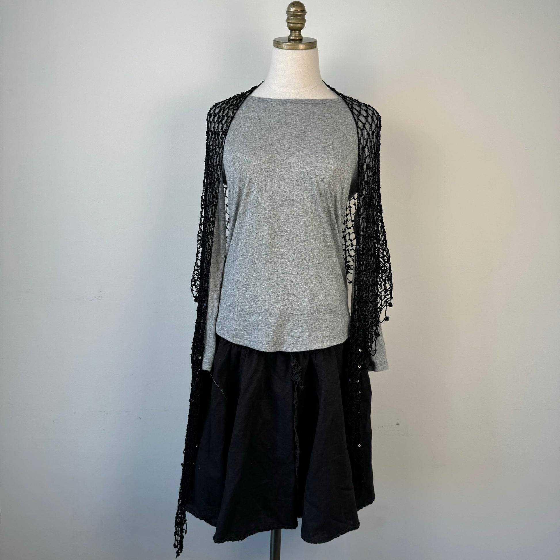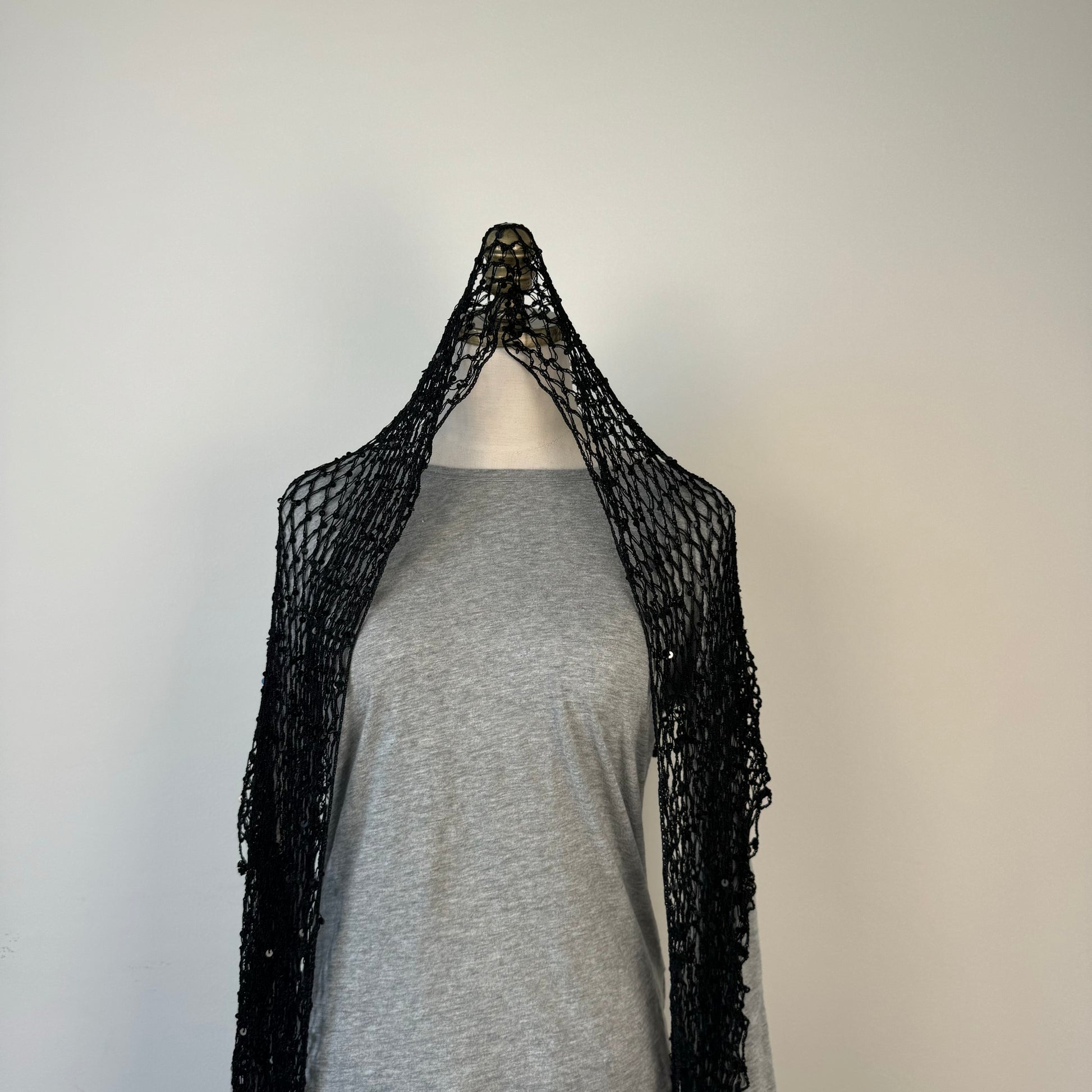 Details: Black skinny open mesh knit scarf with sequins, versatile styling as a top or coverup.