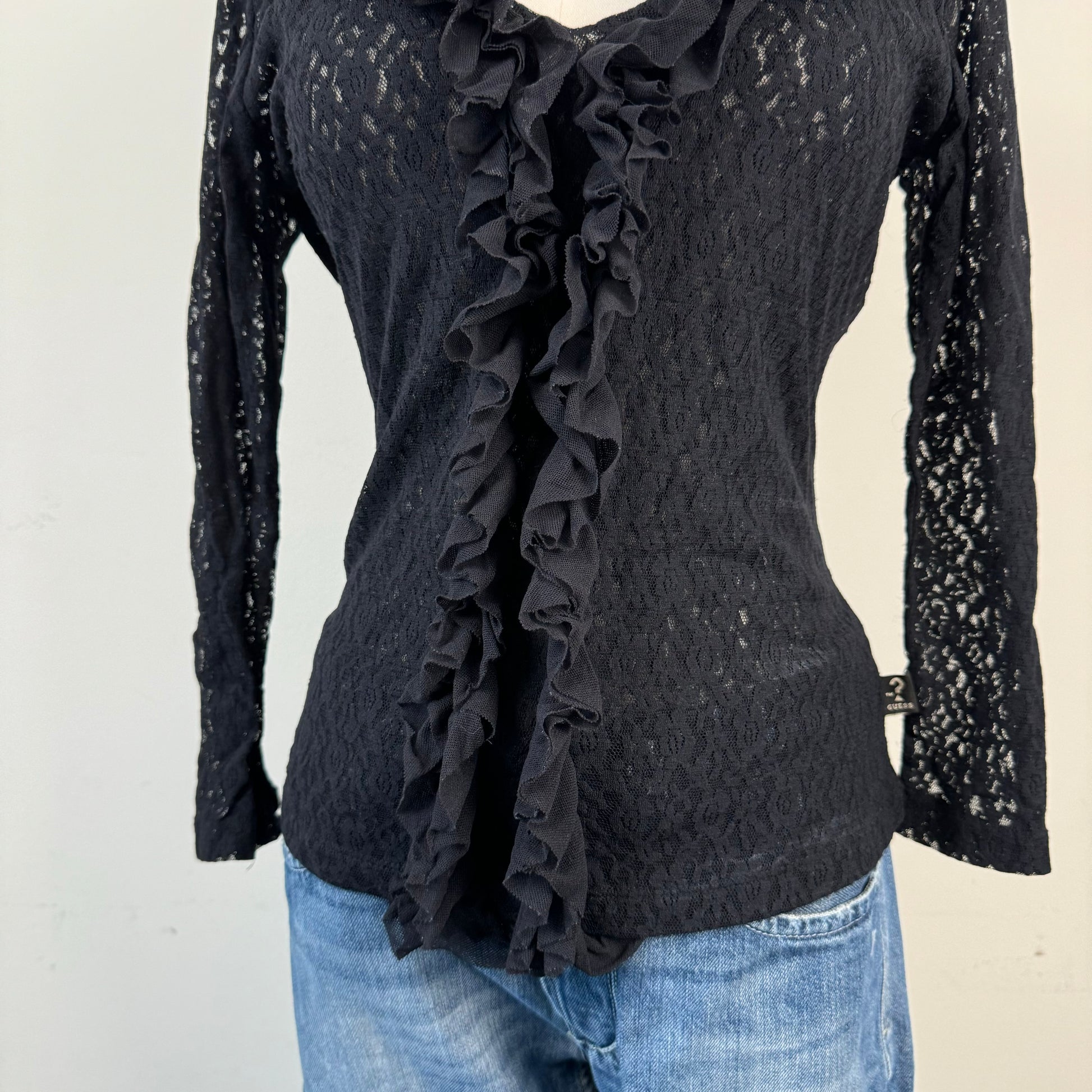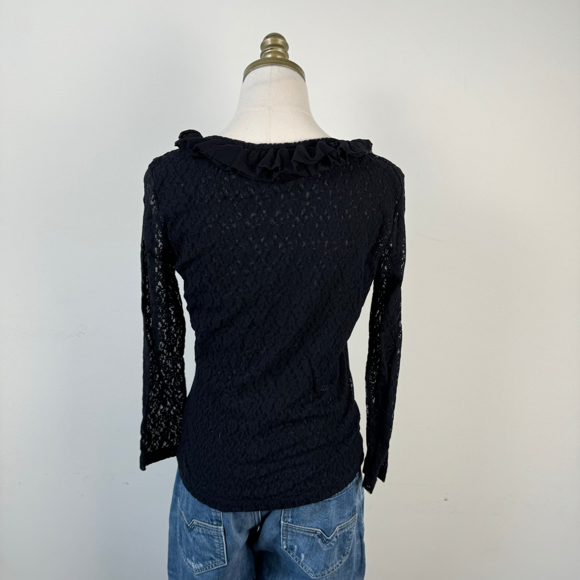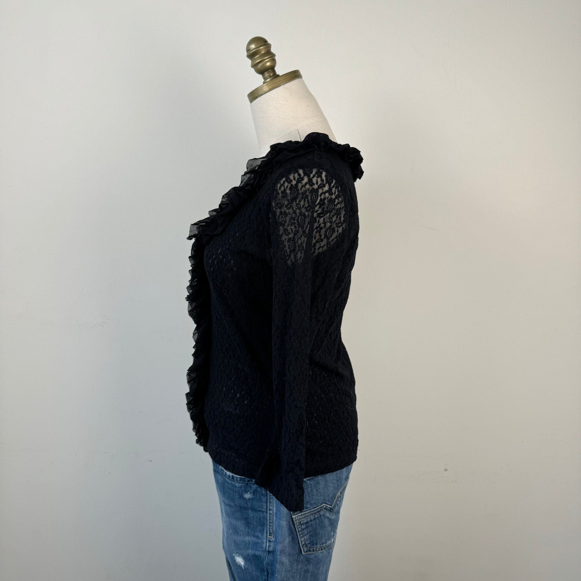 Details: Black long sleeve top with ruffled semi-sheer lace and lace trim.