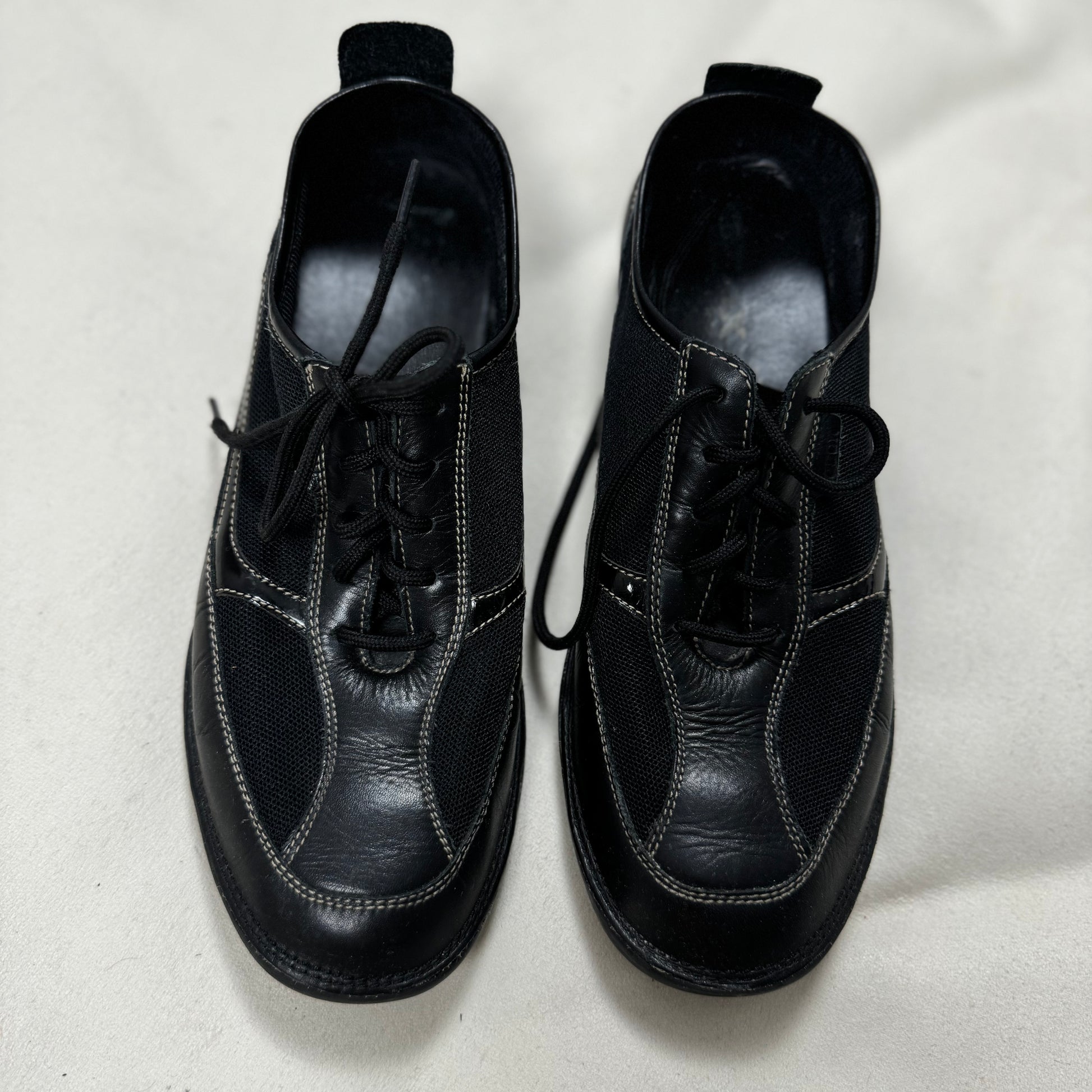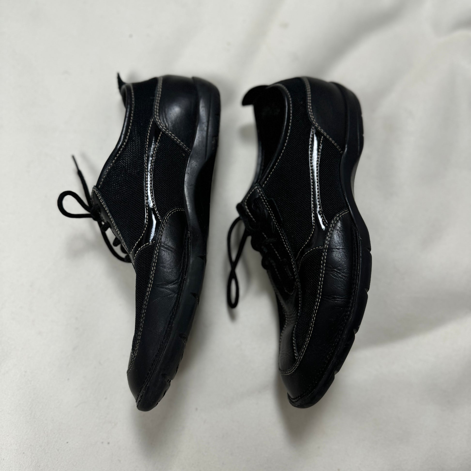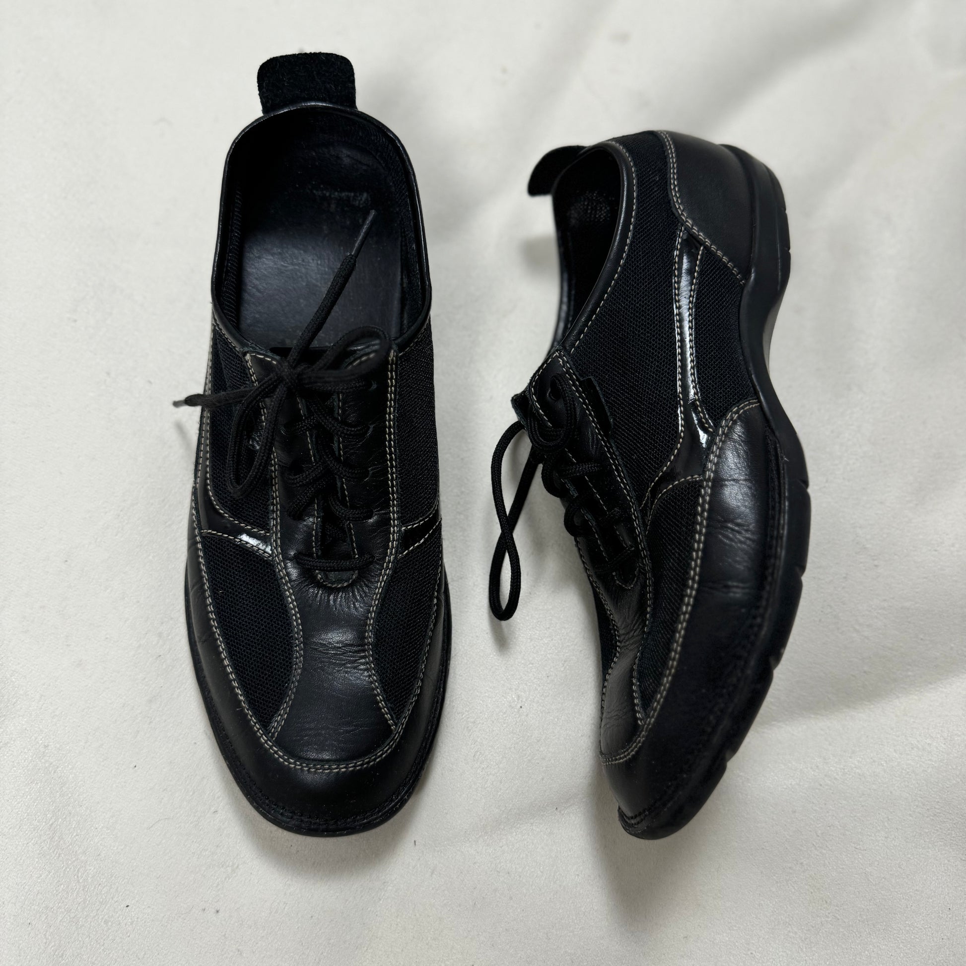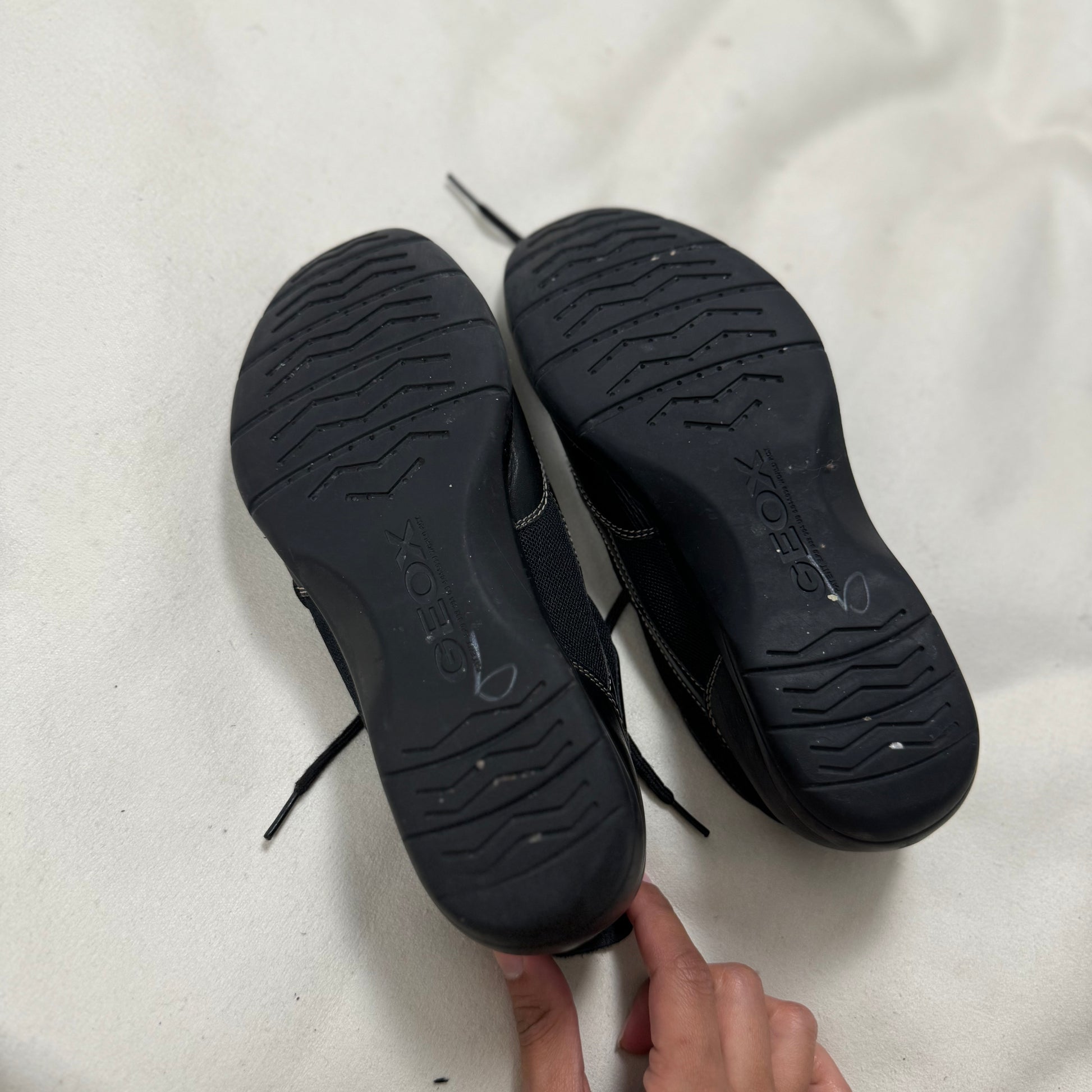 Details: Black skinny sneakers made of leather and mesh, super comfy.