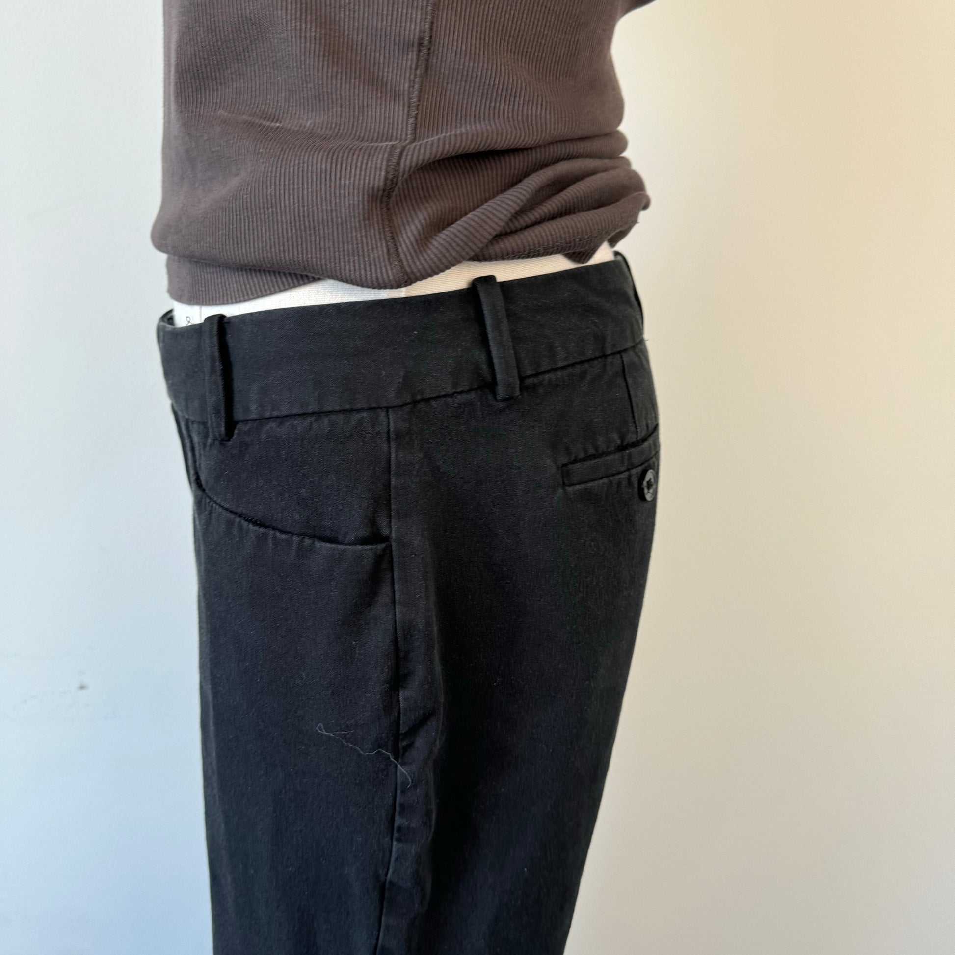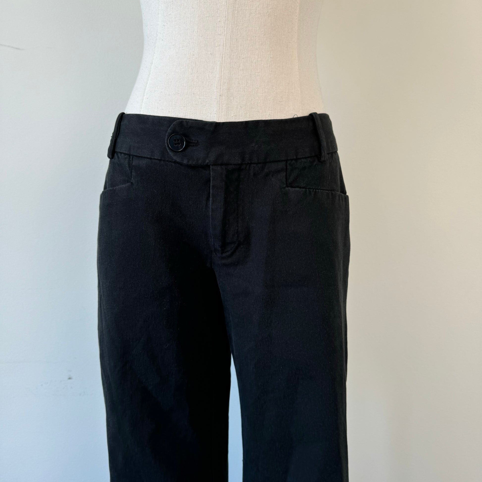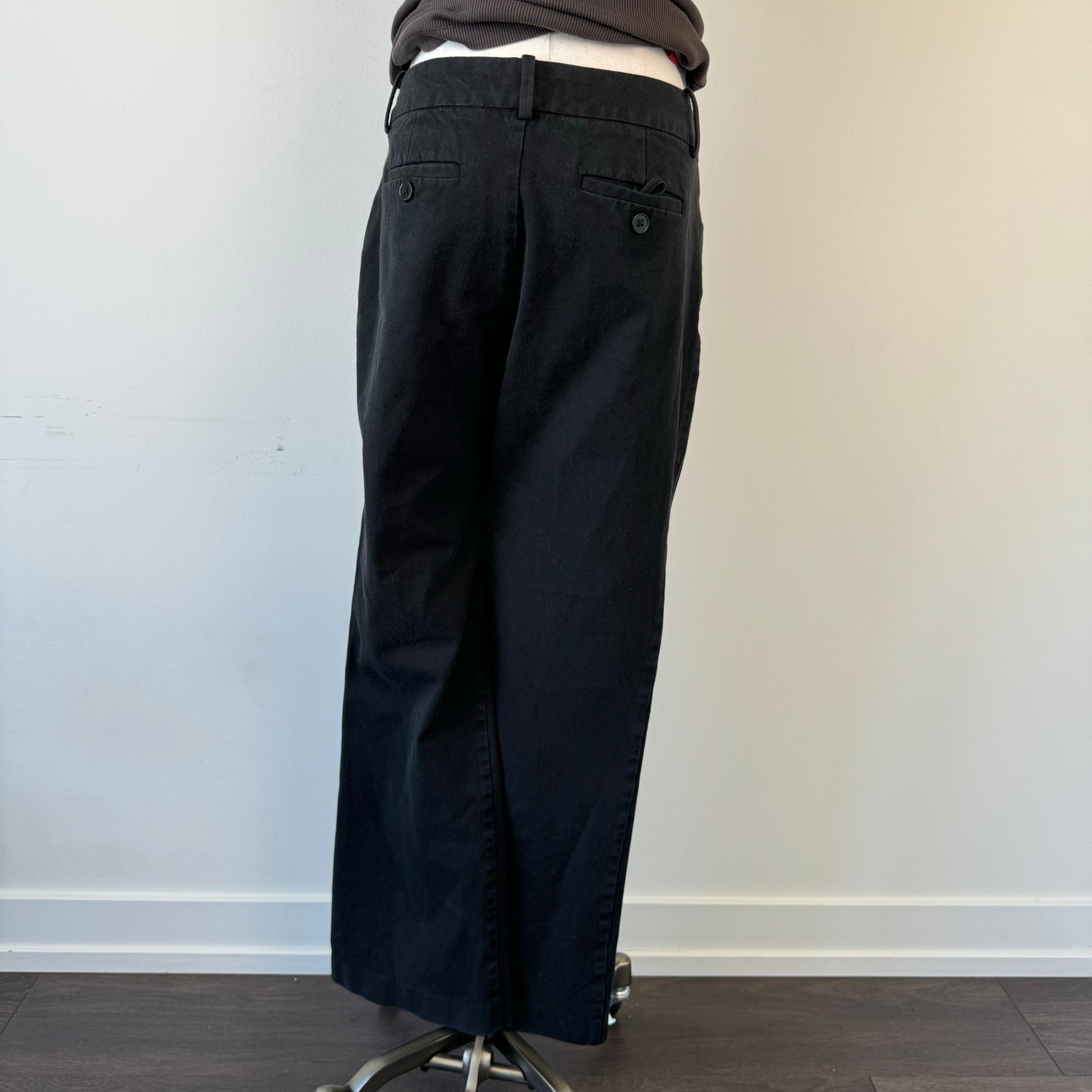 Details: Black office siren trousers with a low rise and asymmetric button closure.