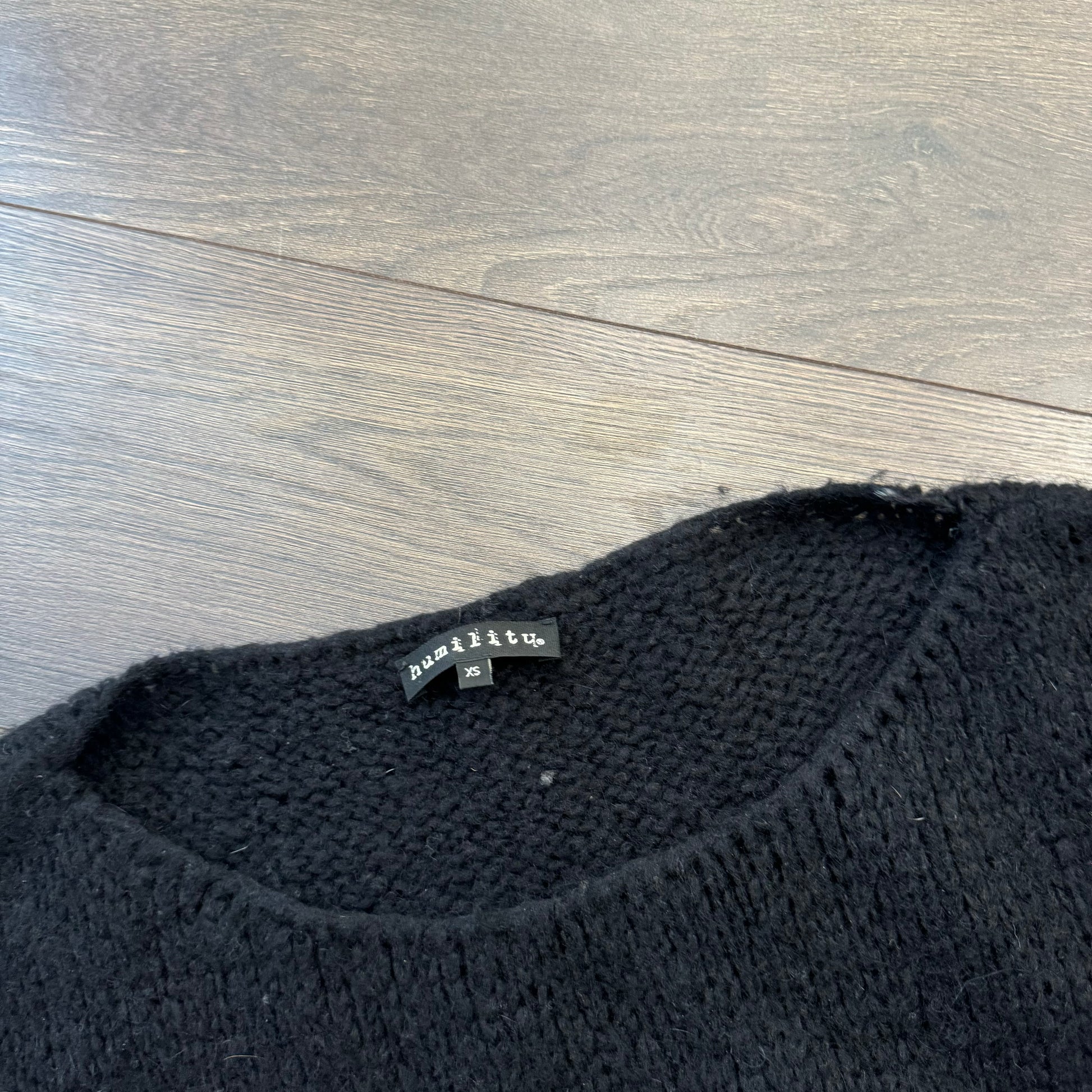 Details: Black off-shoulder sweater with a baggy fit. Not suitable for sensitive skin.