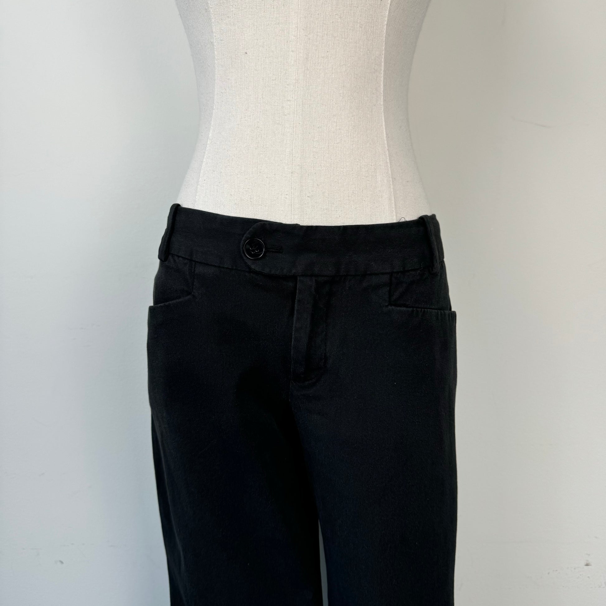 Details: Black office siren flared trousers with low rise, featuring an asymmetric button detail.