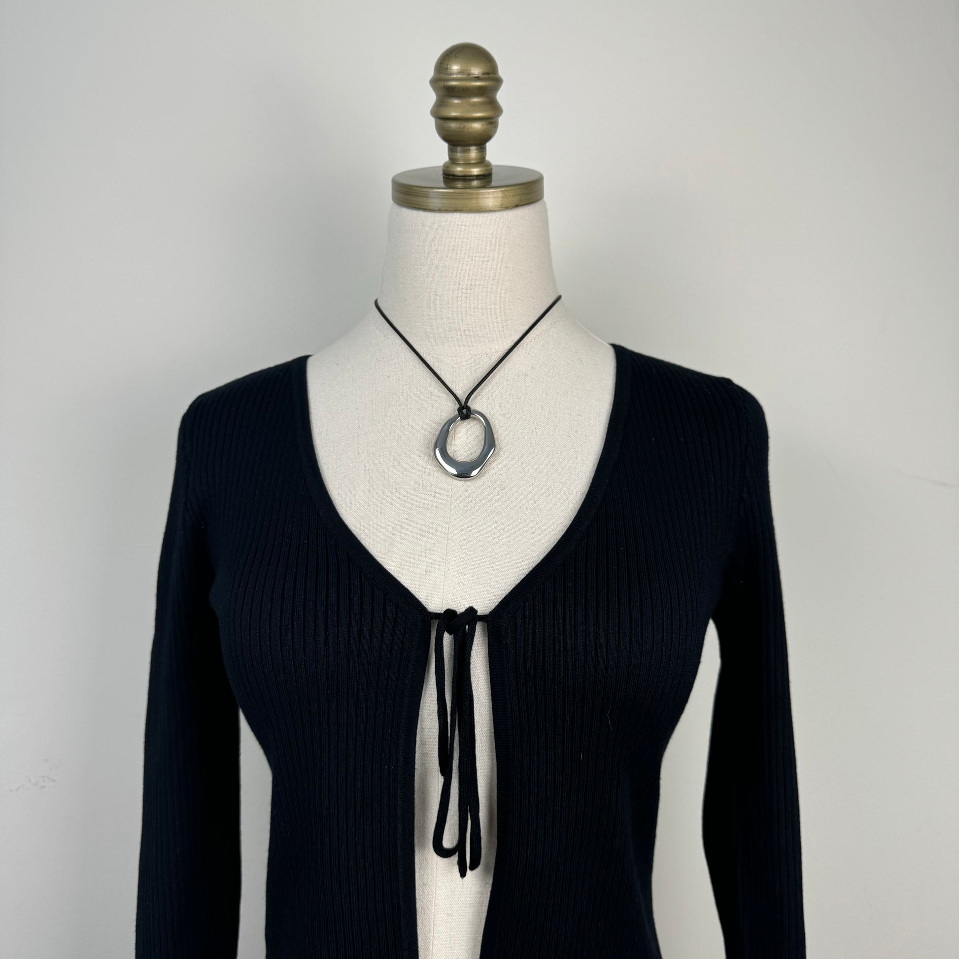 Details: Black open front tie-up fitted cardigan.