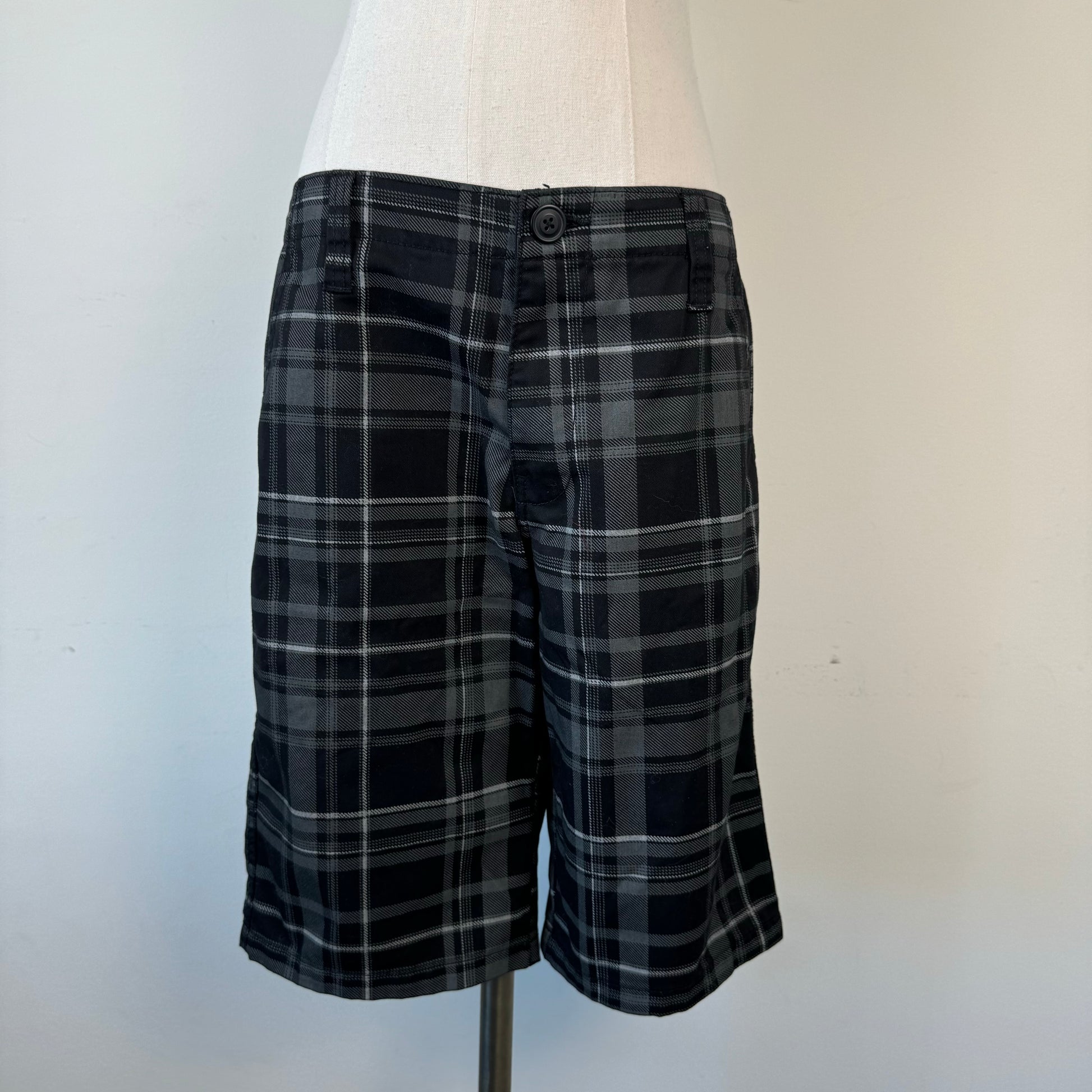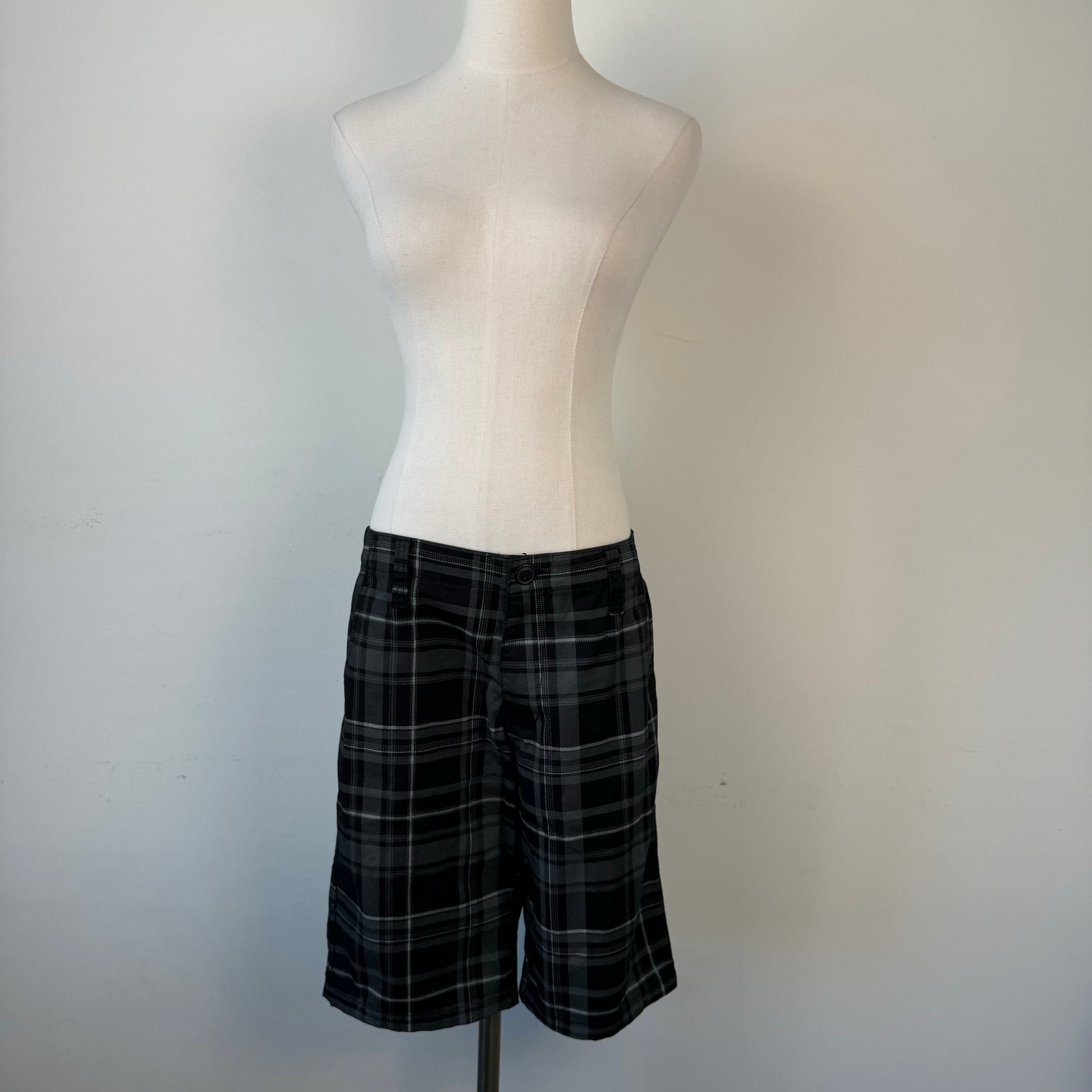Details: Black and grey plaid Bermuda shorts.