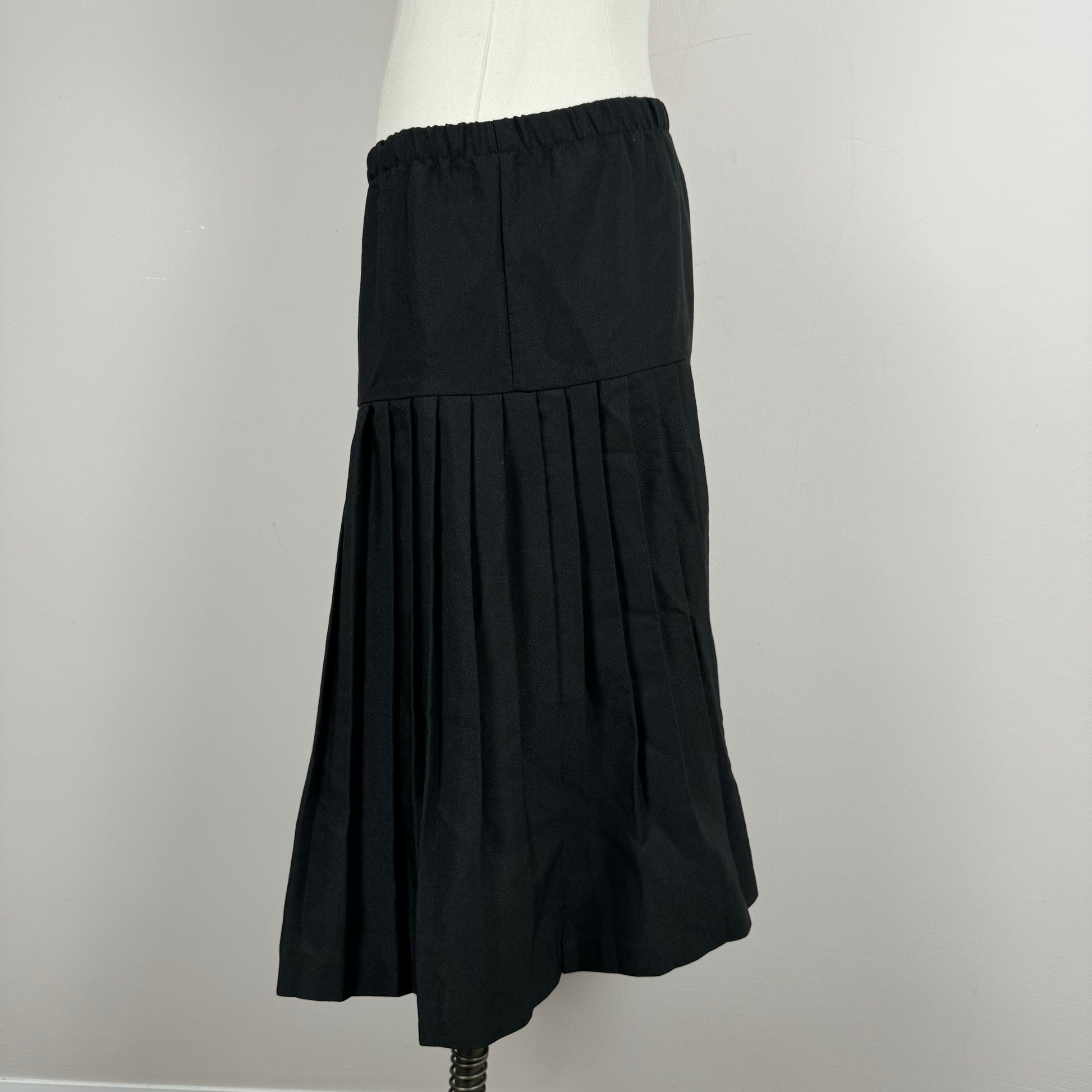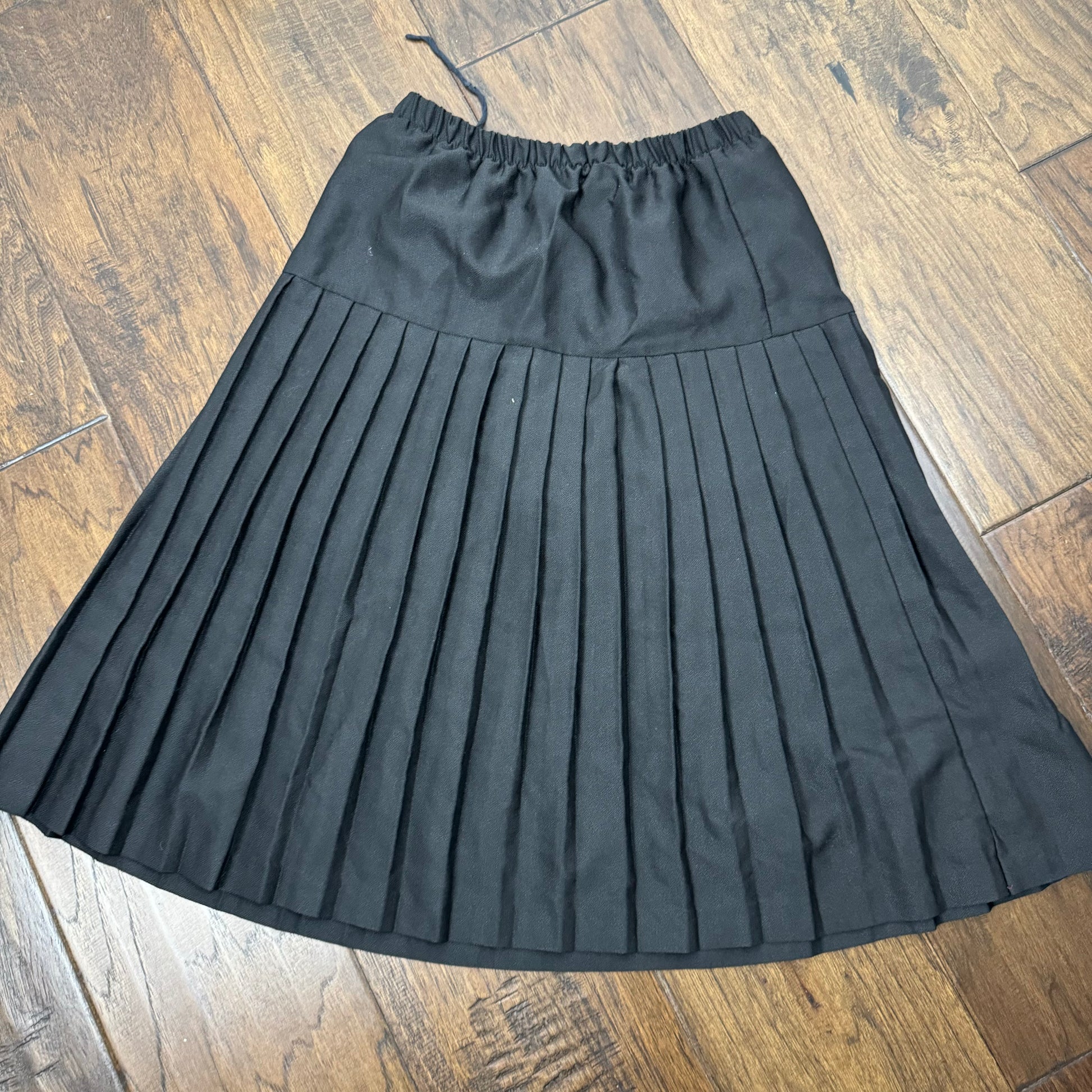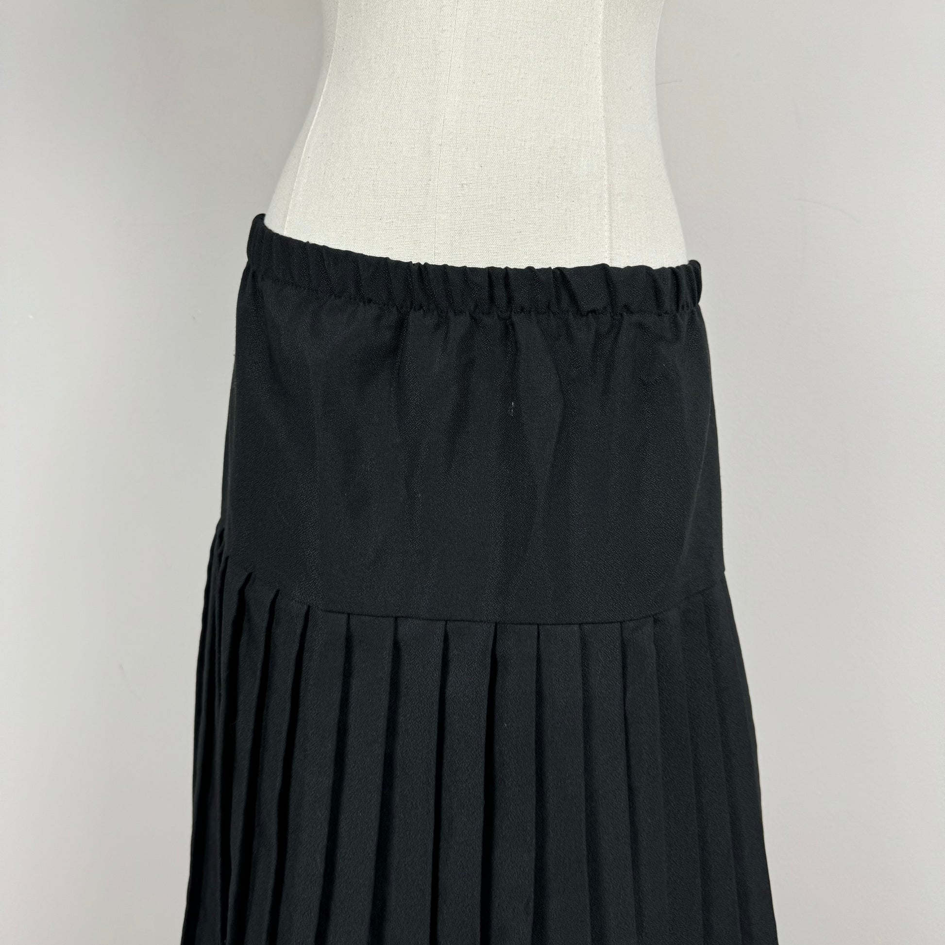 Details: Vintage black pleated midi skirt with a drop waist design.