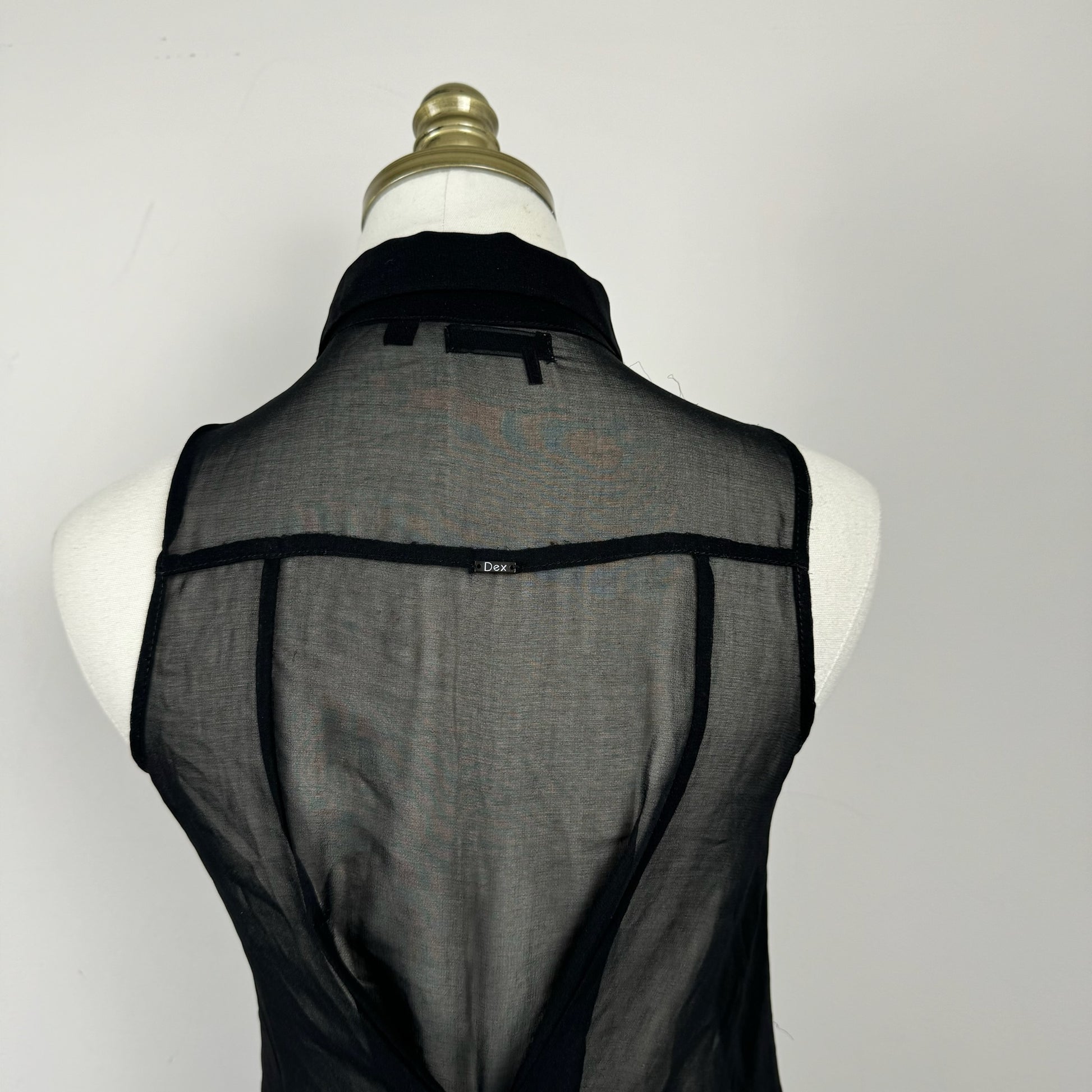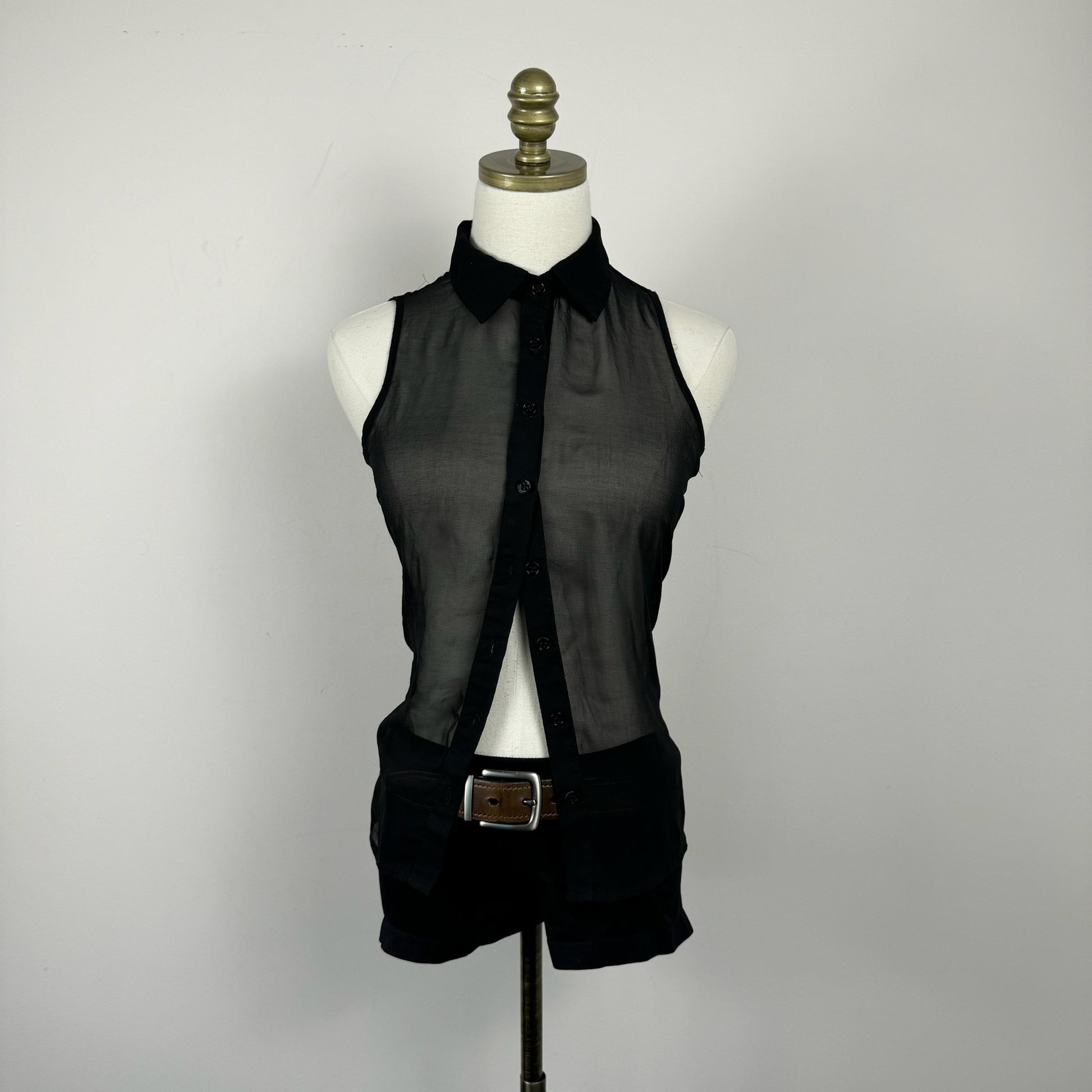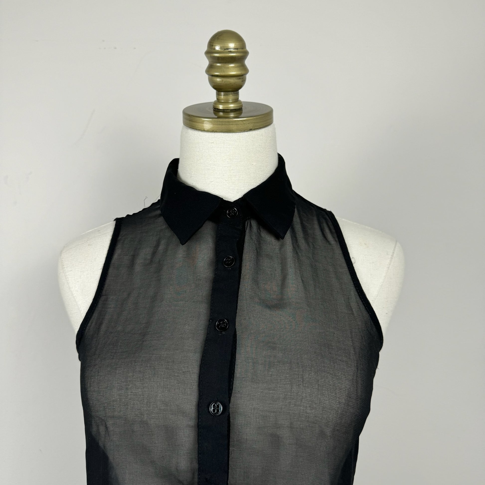 Details: Elegant black sheer sleeveless button-up shirt with a high neck collar, perfect for layering.