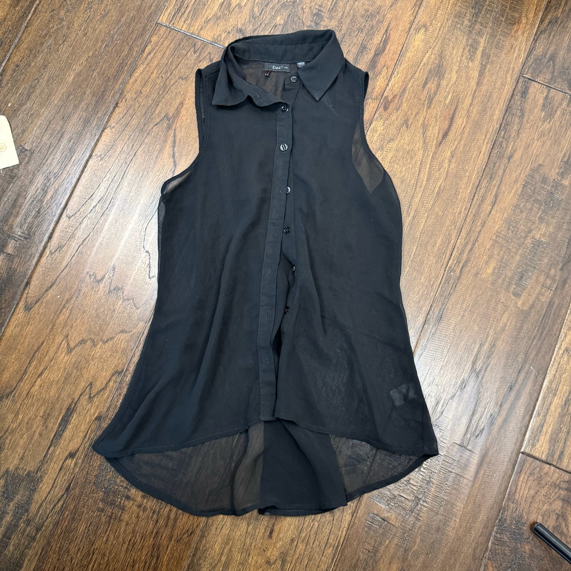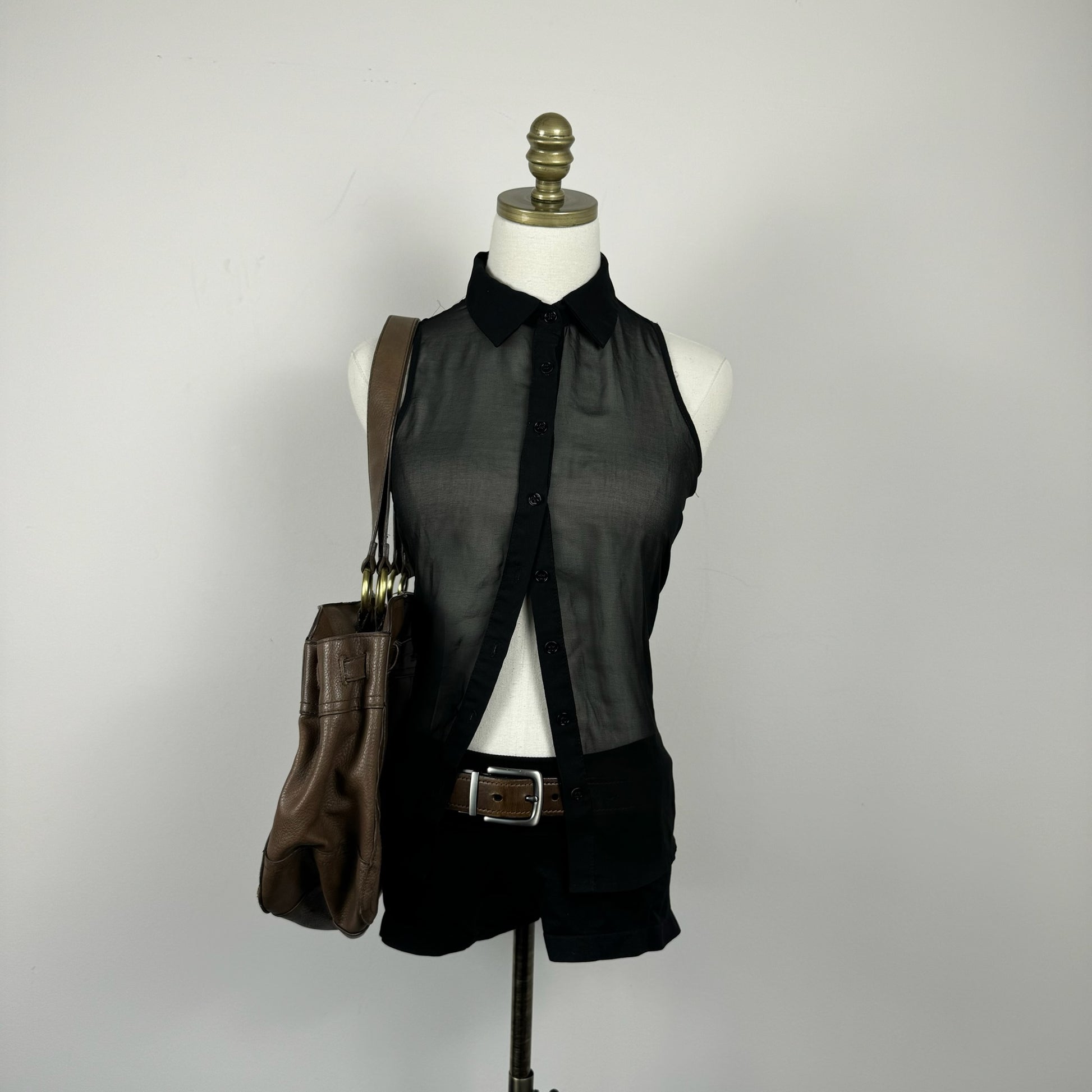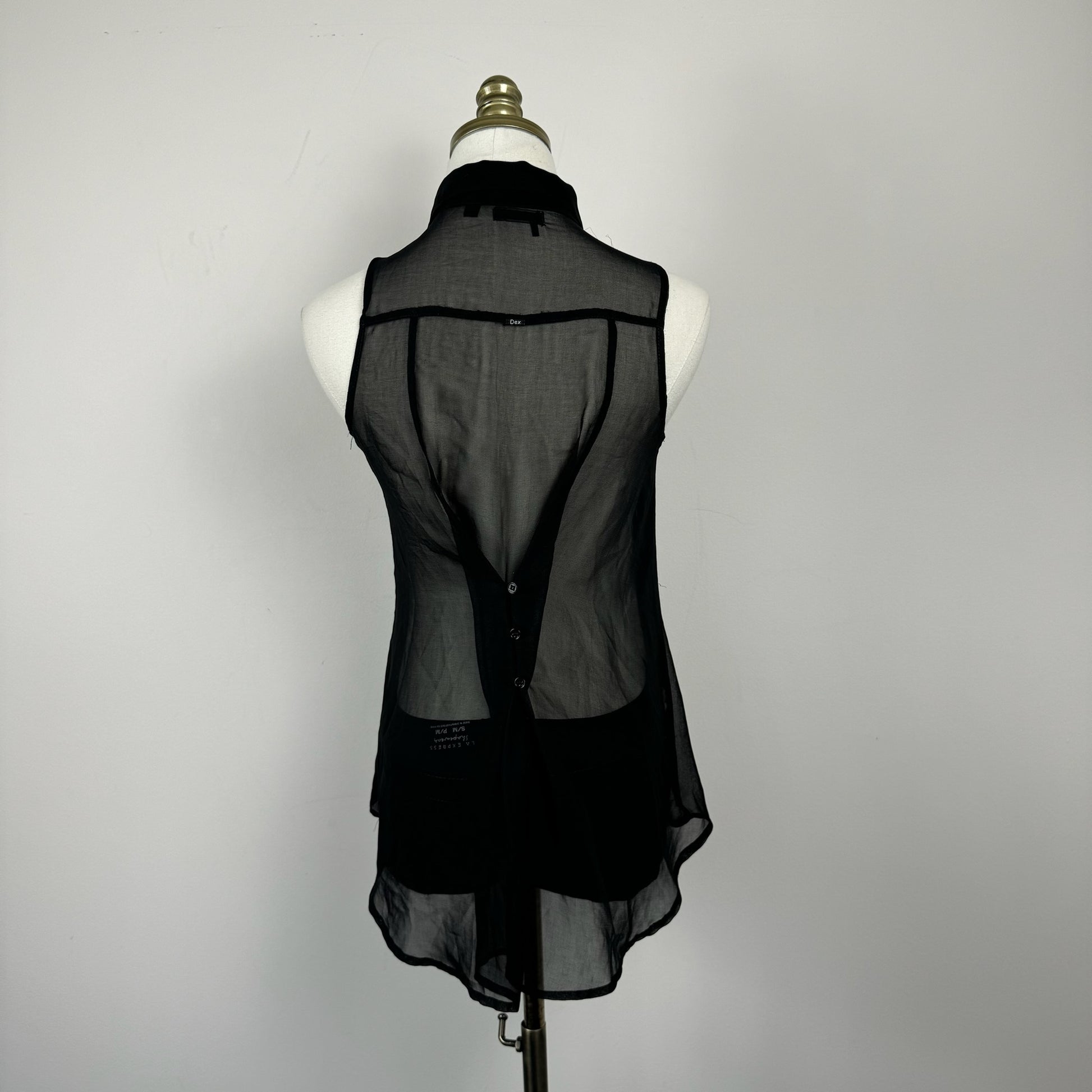 Details: Elegant black sheer sleeveless button-up shirt with a high neck collar, perfect for layering.
