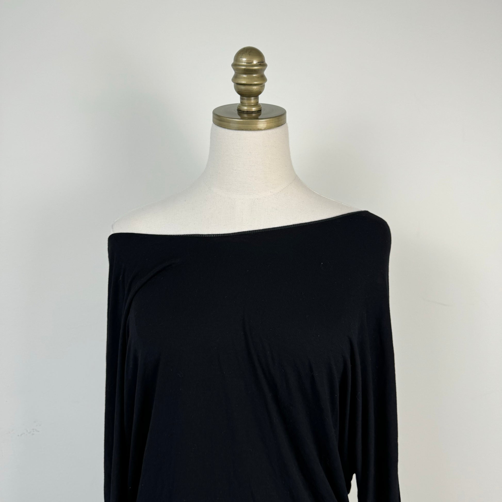 Details: Black off-shoulder slinky flowy top in a dolman style.