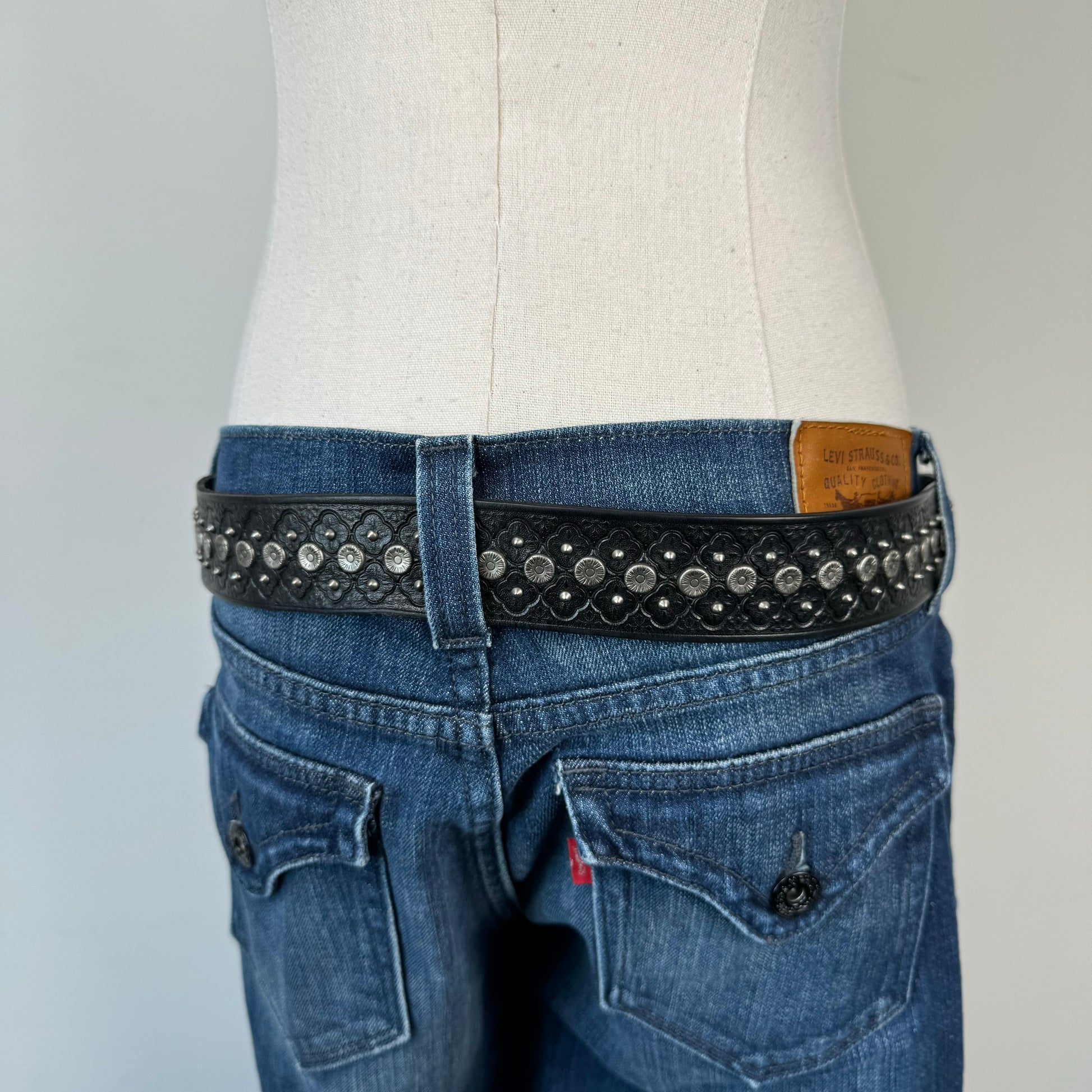 Details: Black genuine leather studded belt with a chunky silver buckle, low rise.