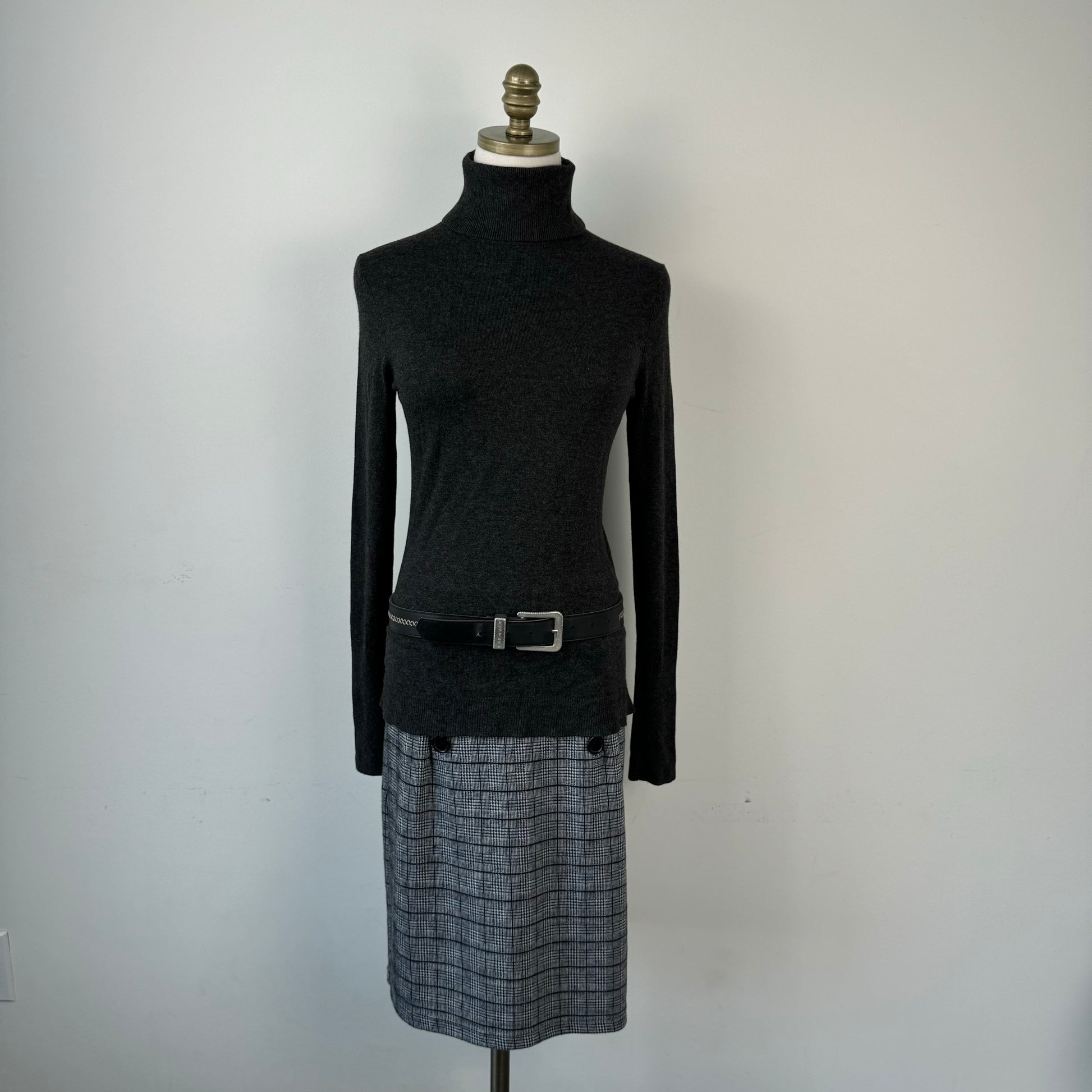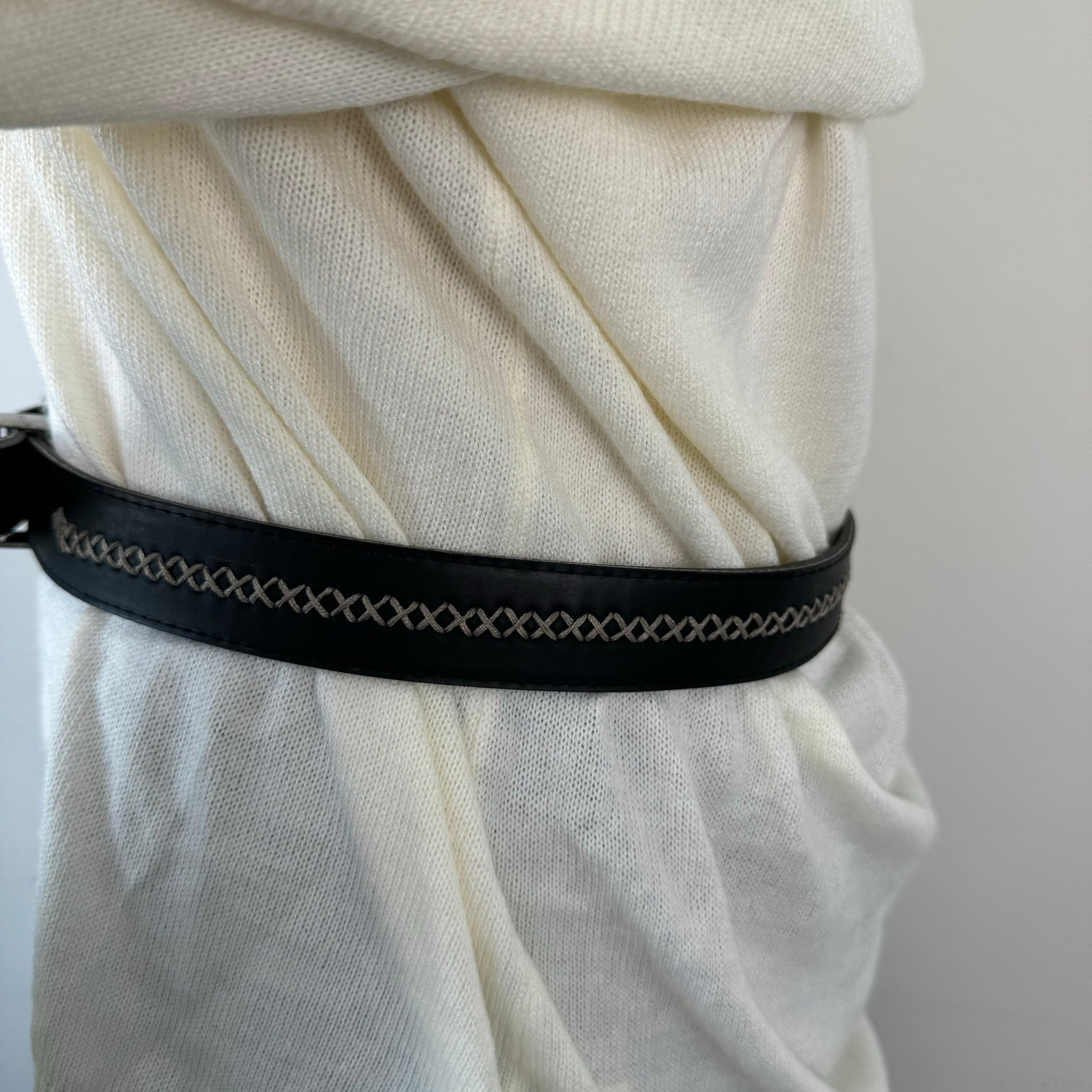 Details: Charcoal black western leather belt with a silver buckle and contrast stitch details.