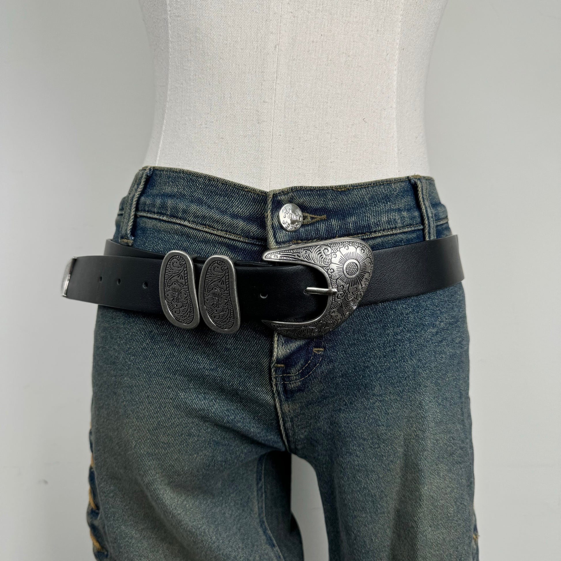 Black Western Silver Buckle Leather Belt
