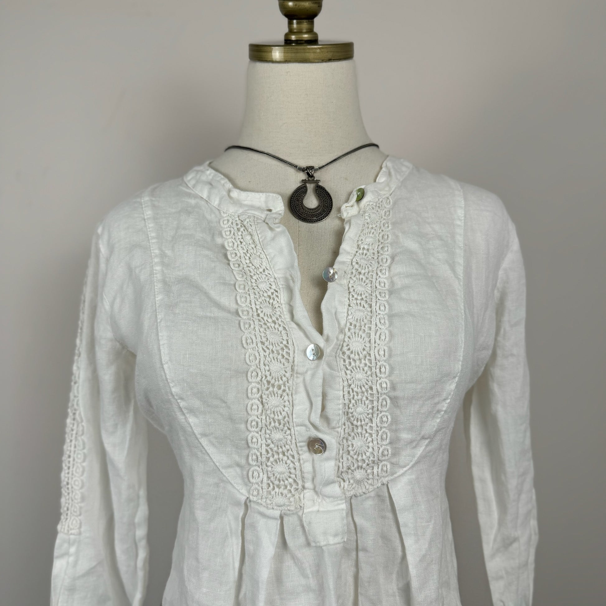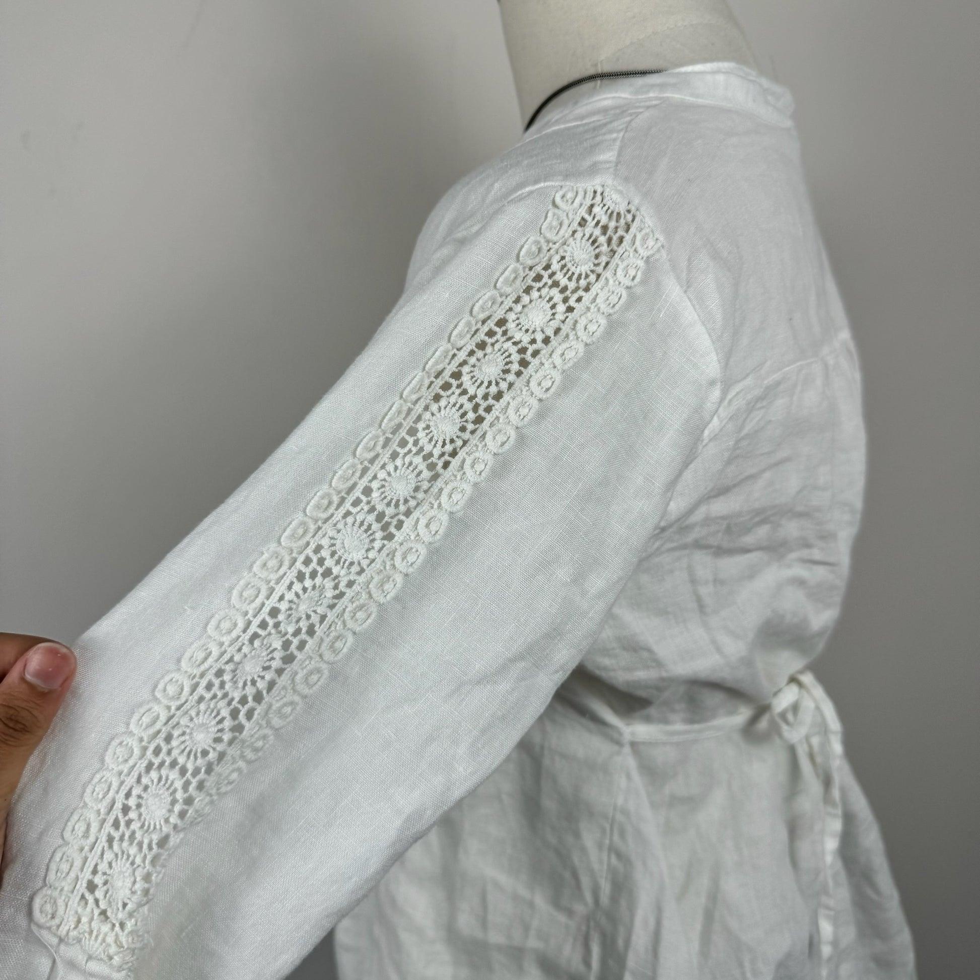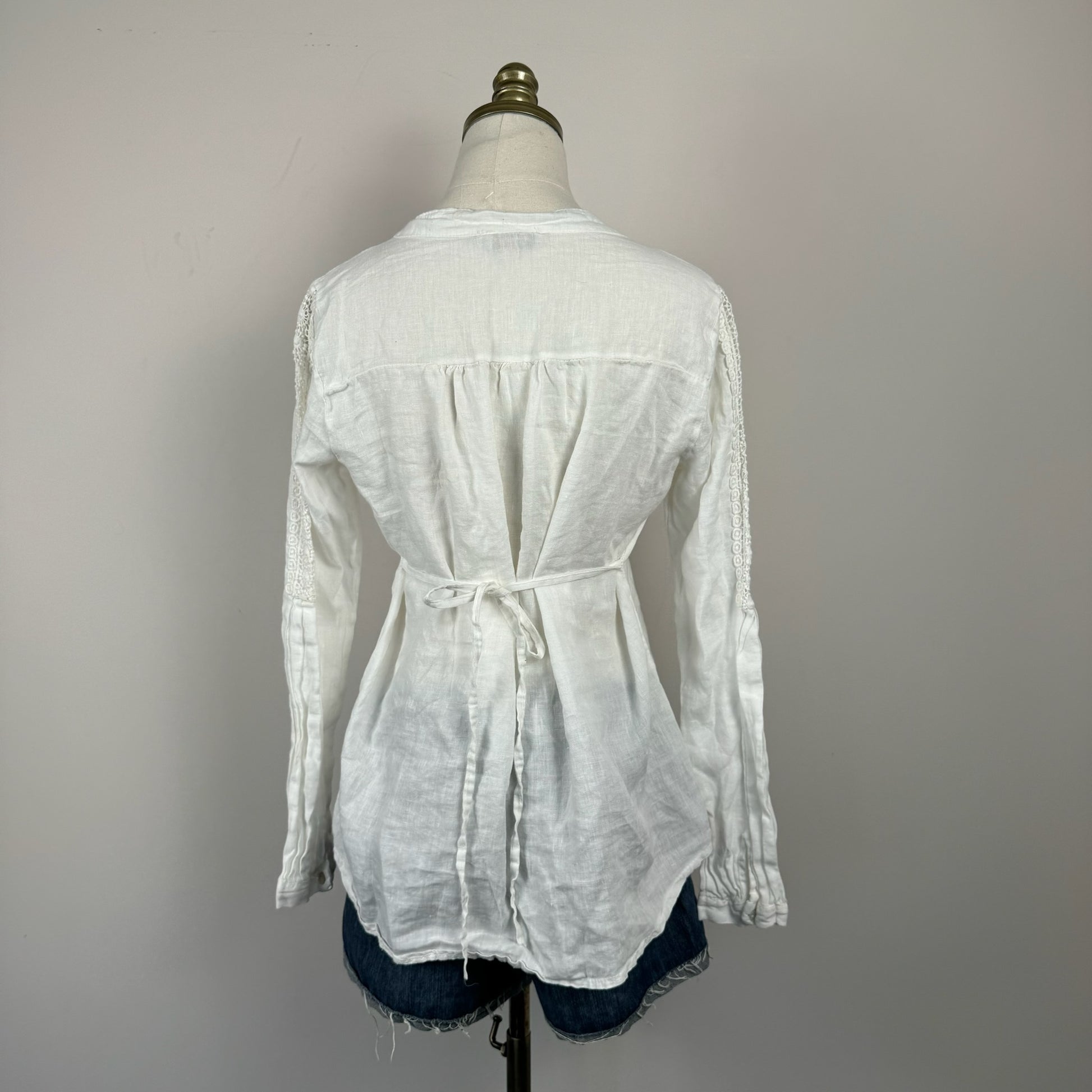 Details: White linen boho top with straps to cinch in the waist for a flattering fit.