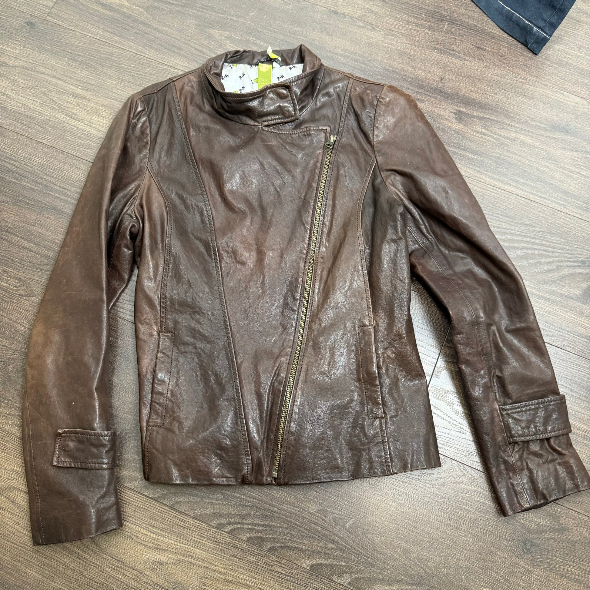 Details: Brown fitted moto jacket in genuine leather, featuring a funnel neck and brass gold hardware details.