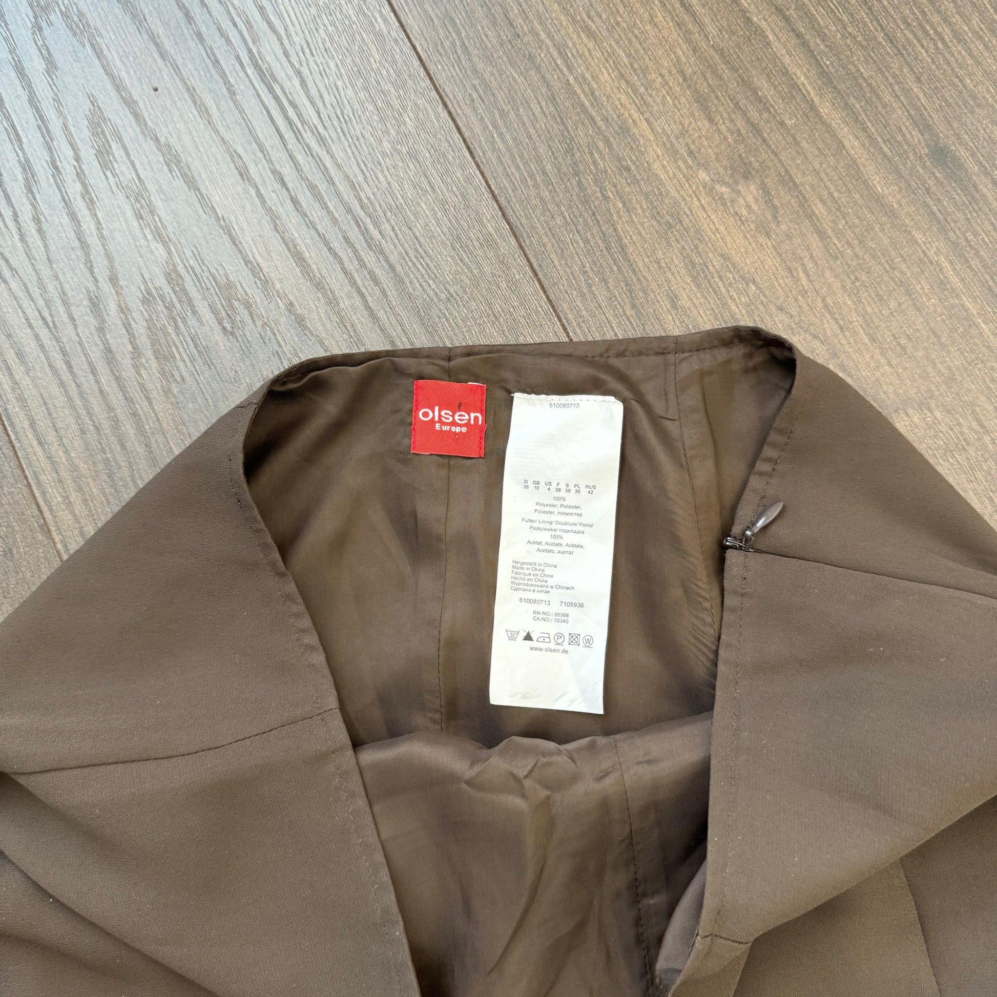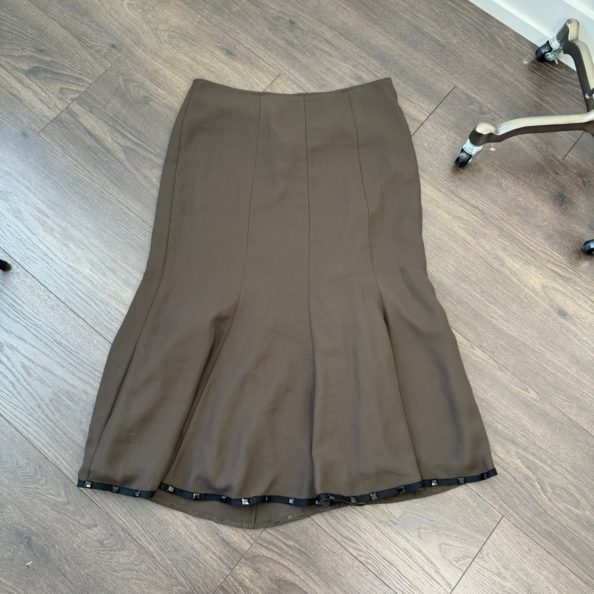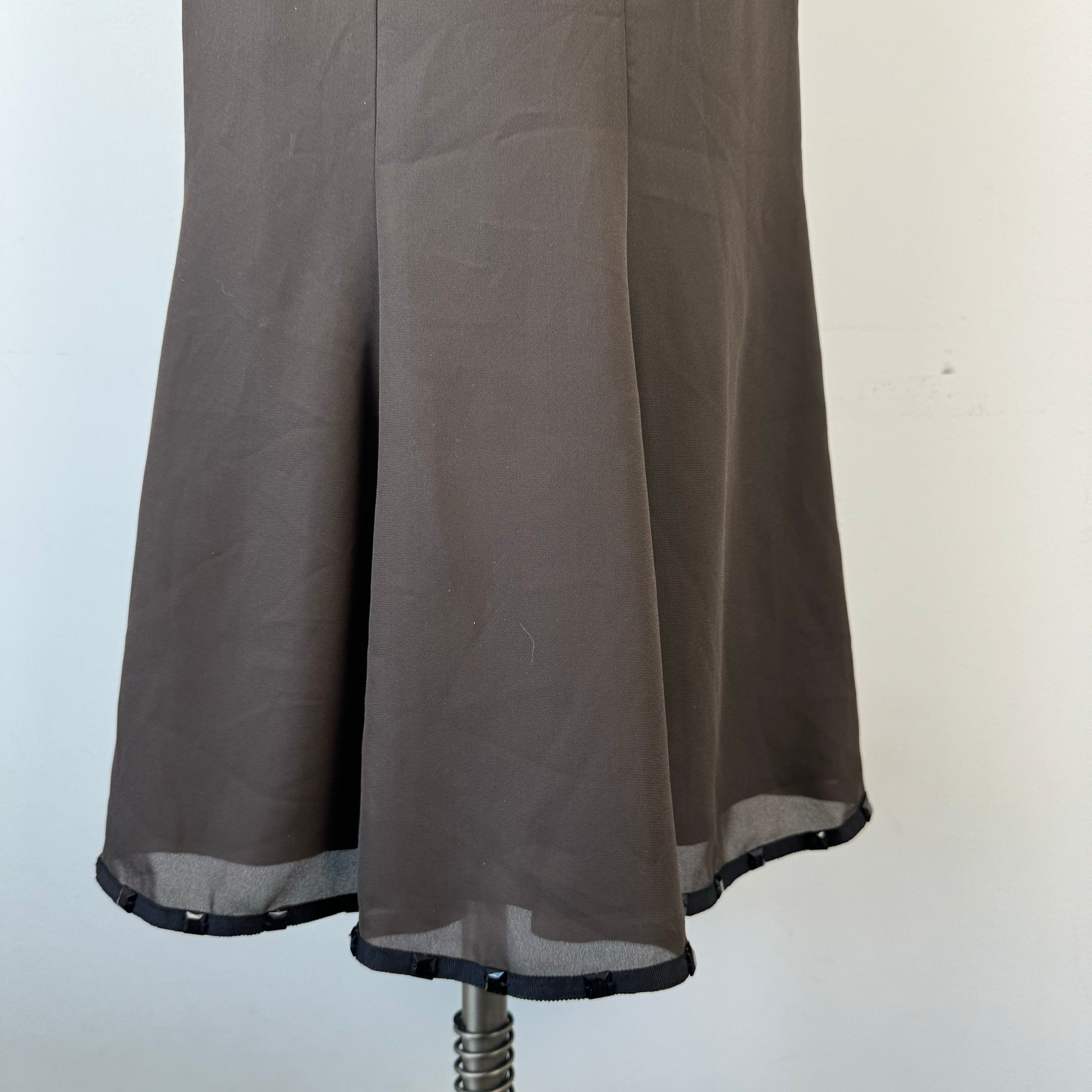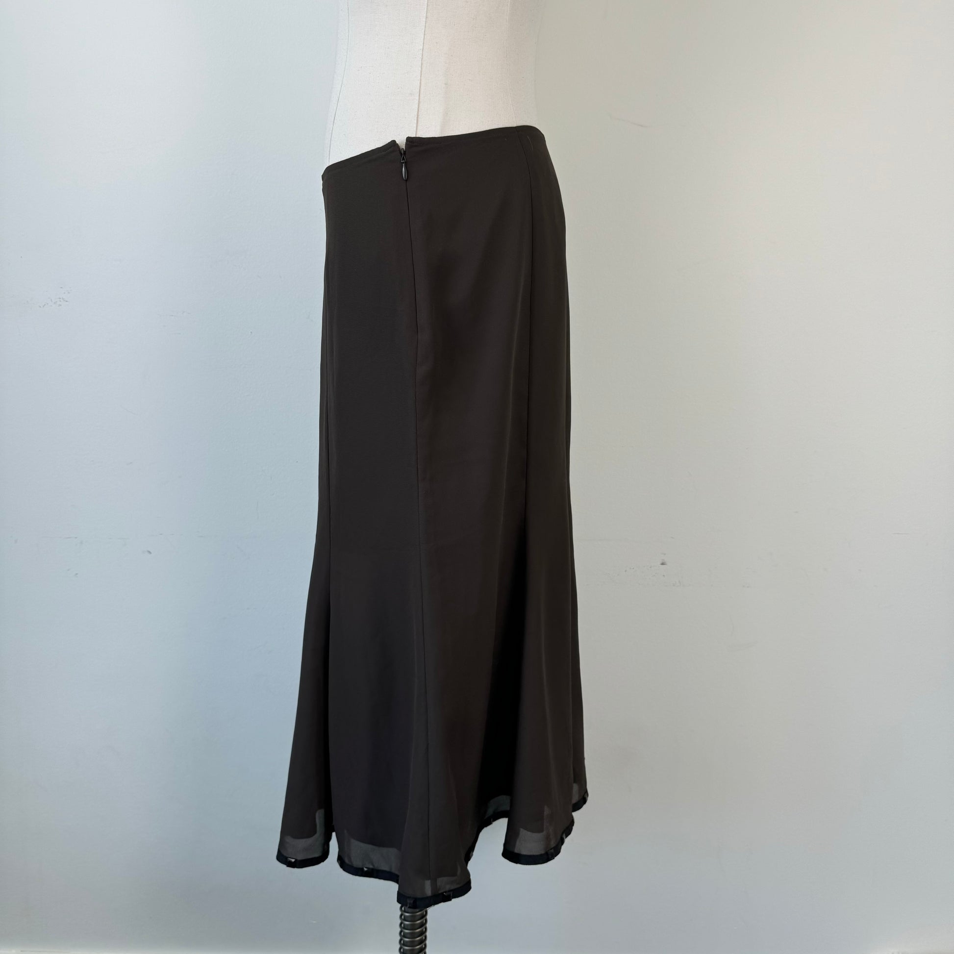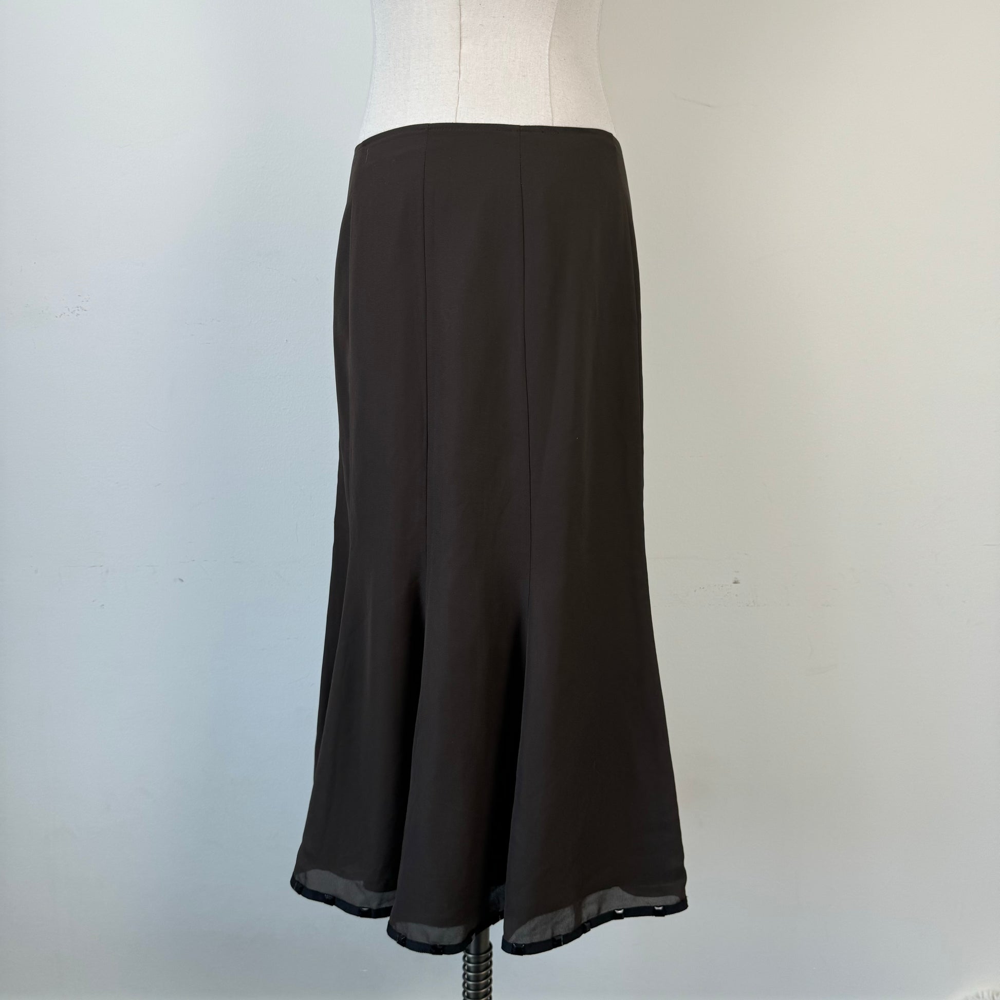 Details: Brown midi skirt with chiffon mesh overlay and black trim at the bottom hem.