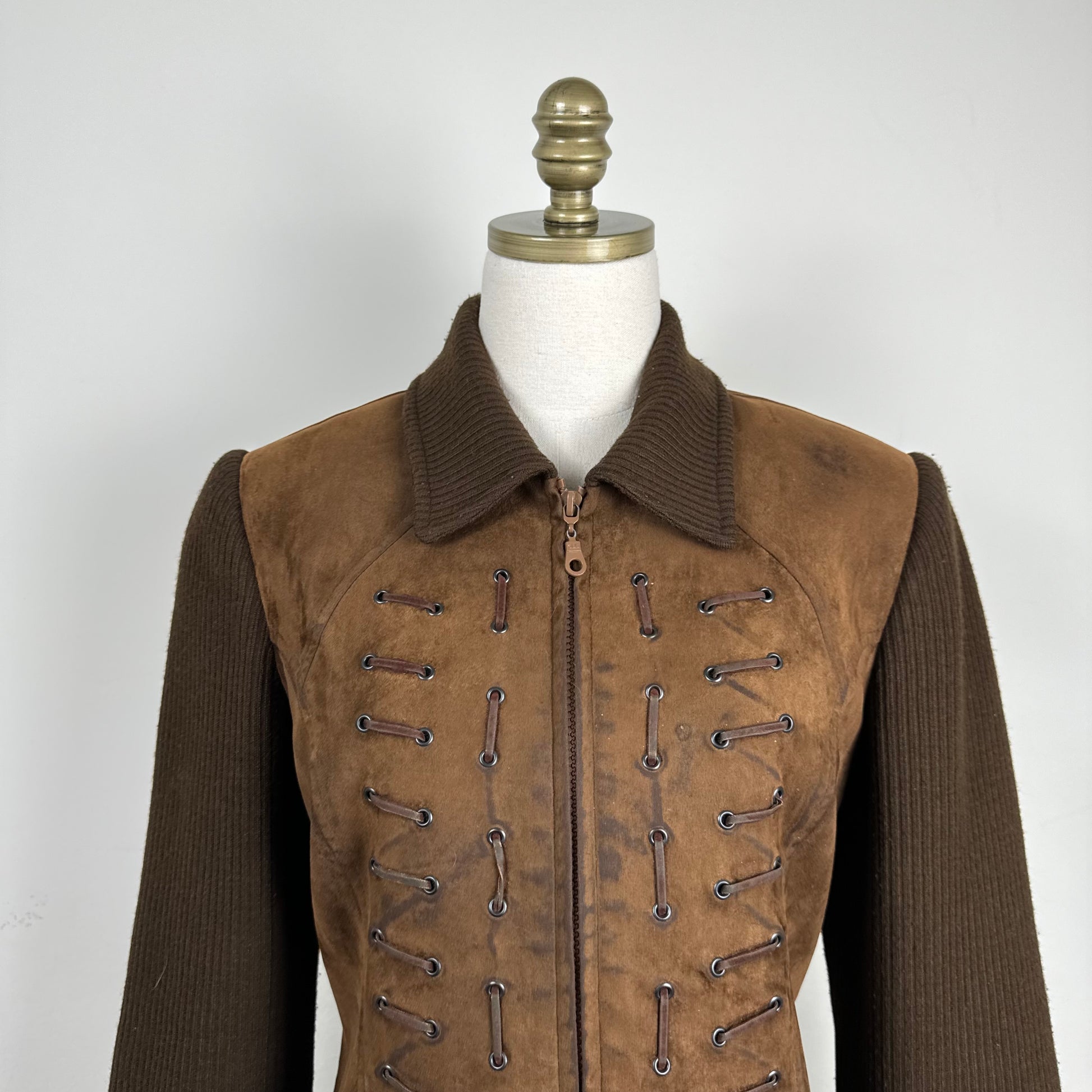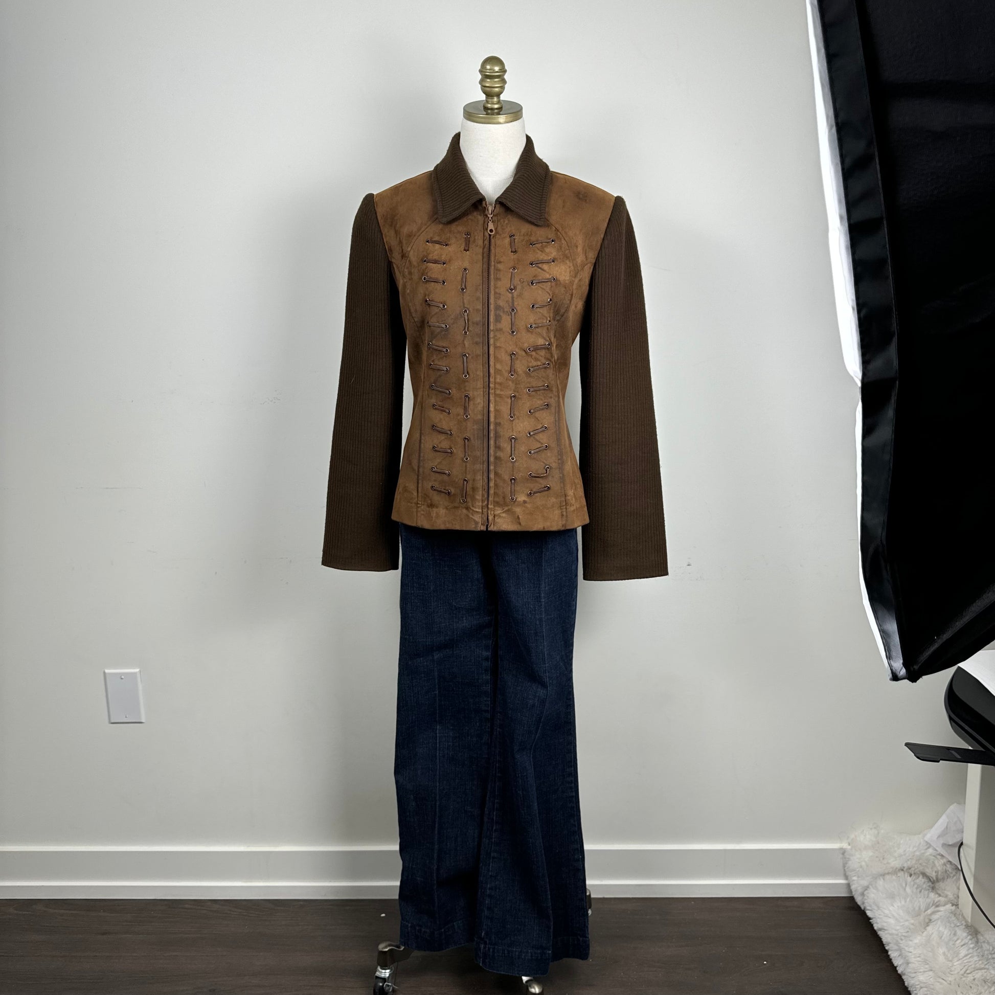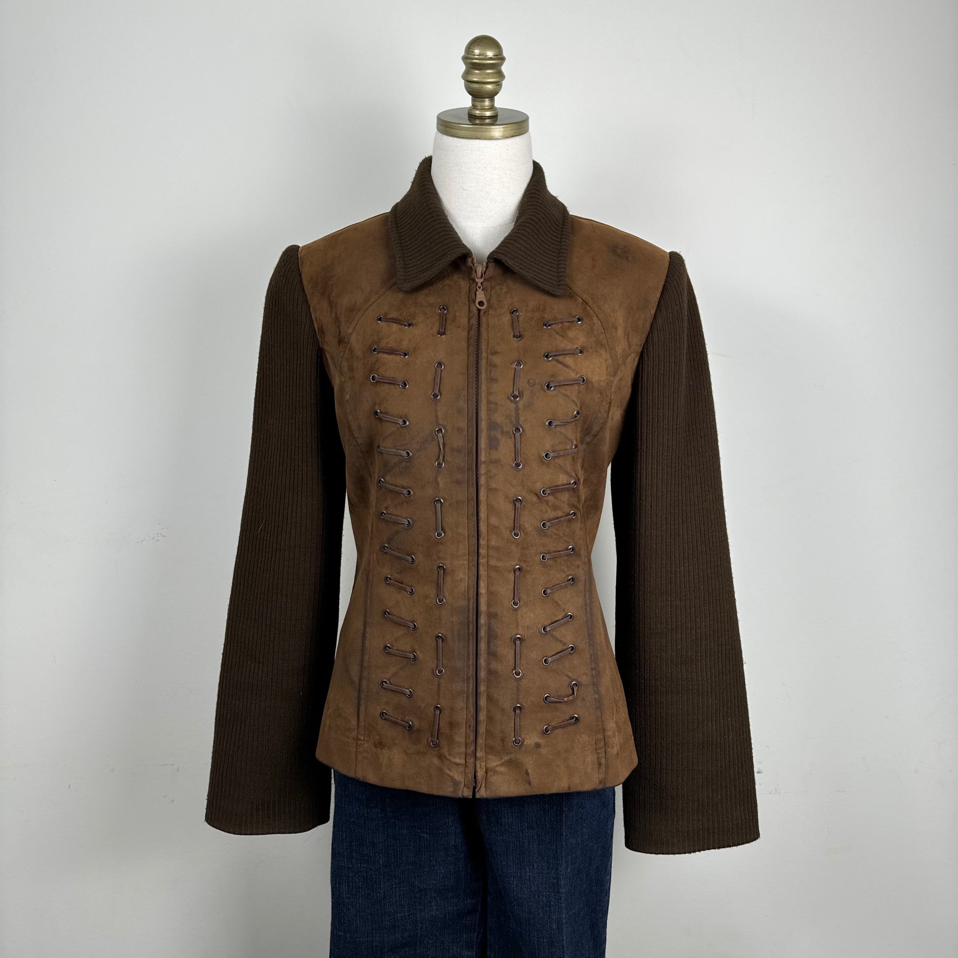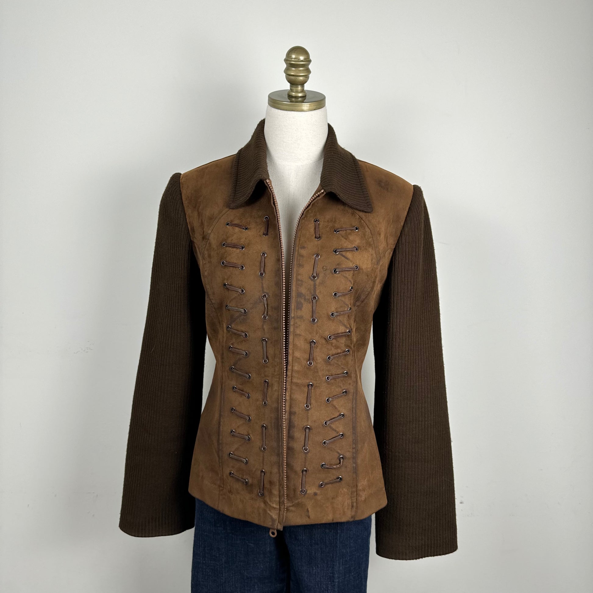 Details: Chocolate brown faux suede jacket with lace-up and zip-up closure, featuring a knit collar and sleeves, and lace details at the front.