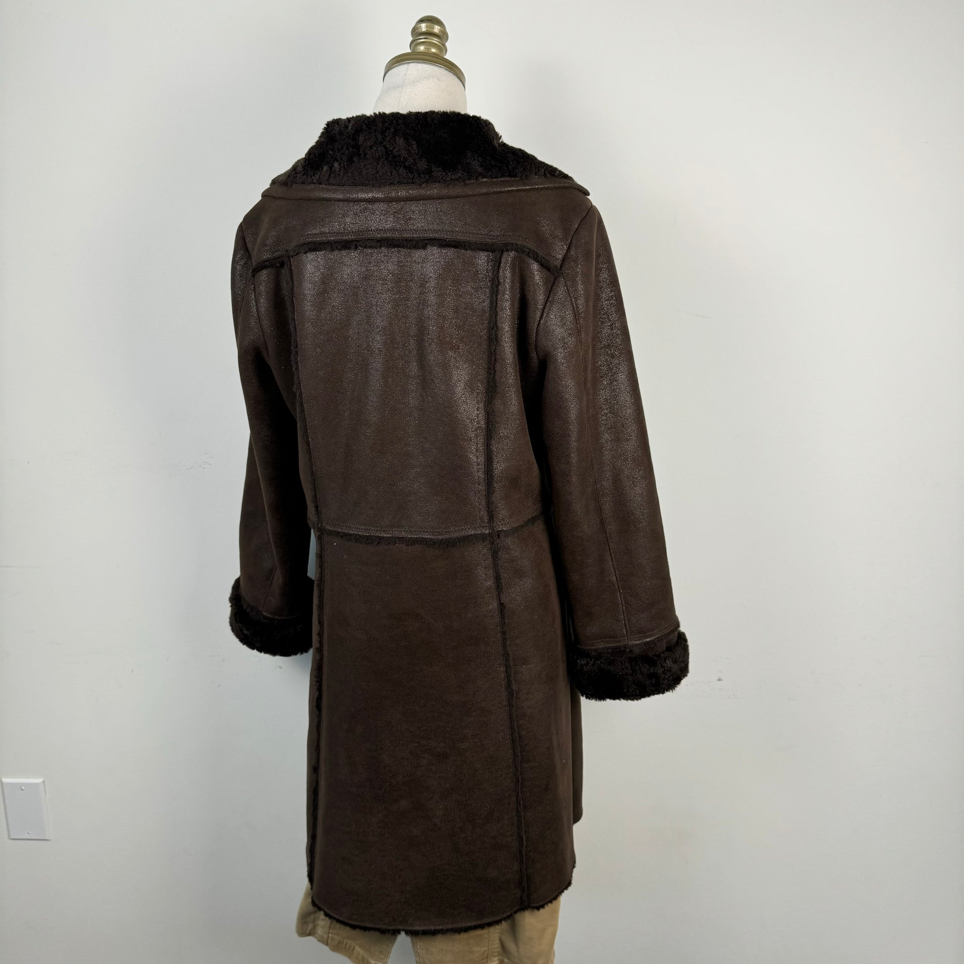 Details: Chocolate brown faux suede fur trim coat in a Penny Lane style, with fur trim and lining.