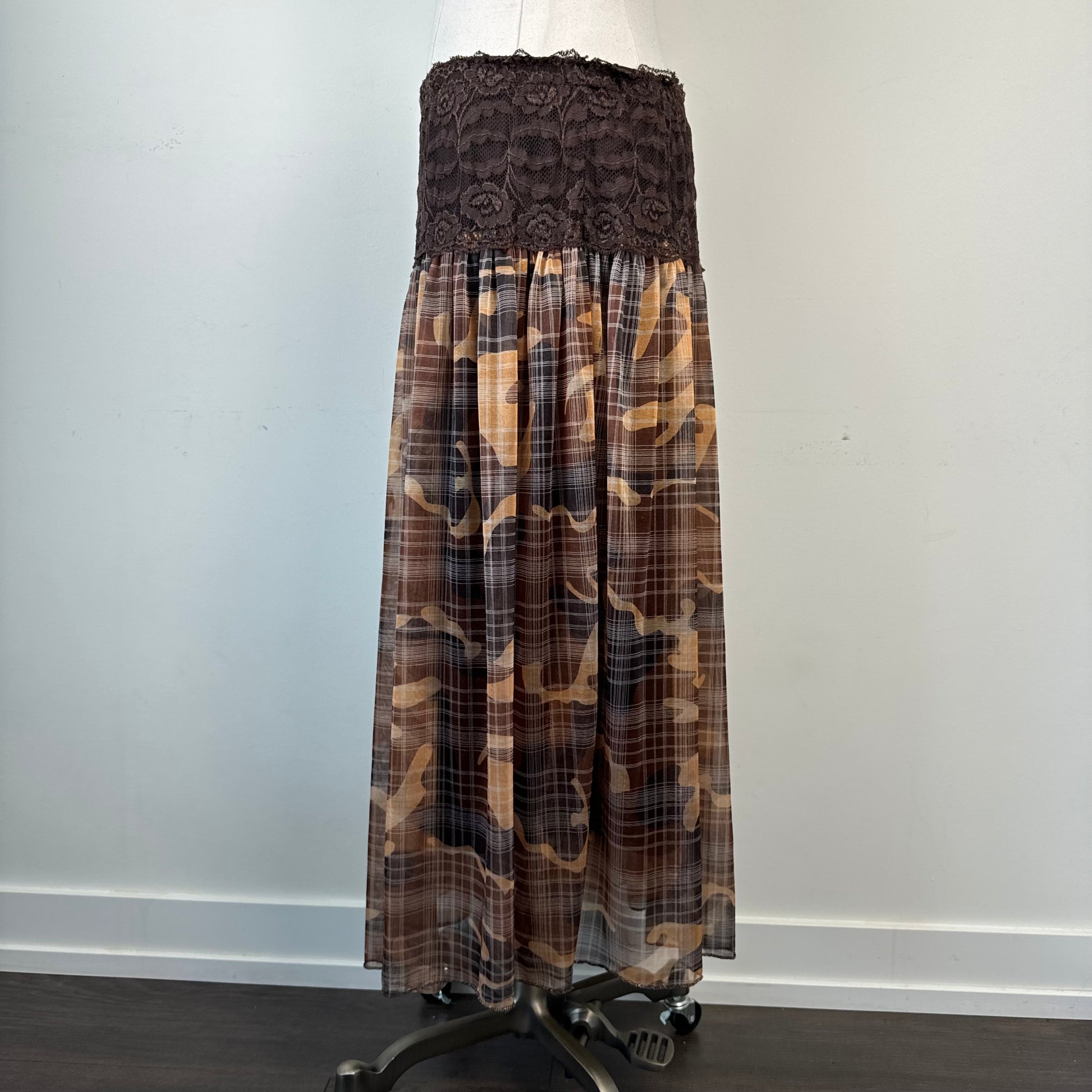 Details: Brown maxi skirt with lace chiffon plaid mesh overlay, featuring a lace waistband and drop waist style.