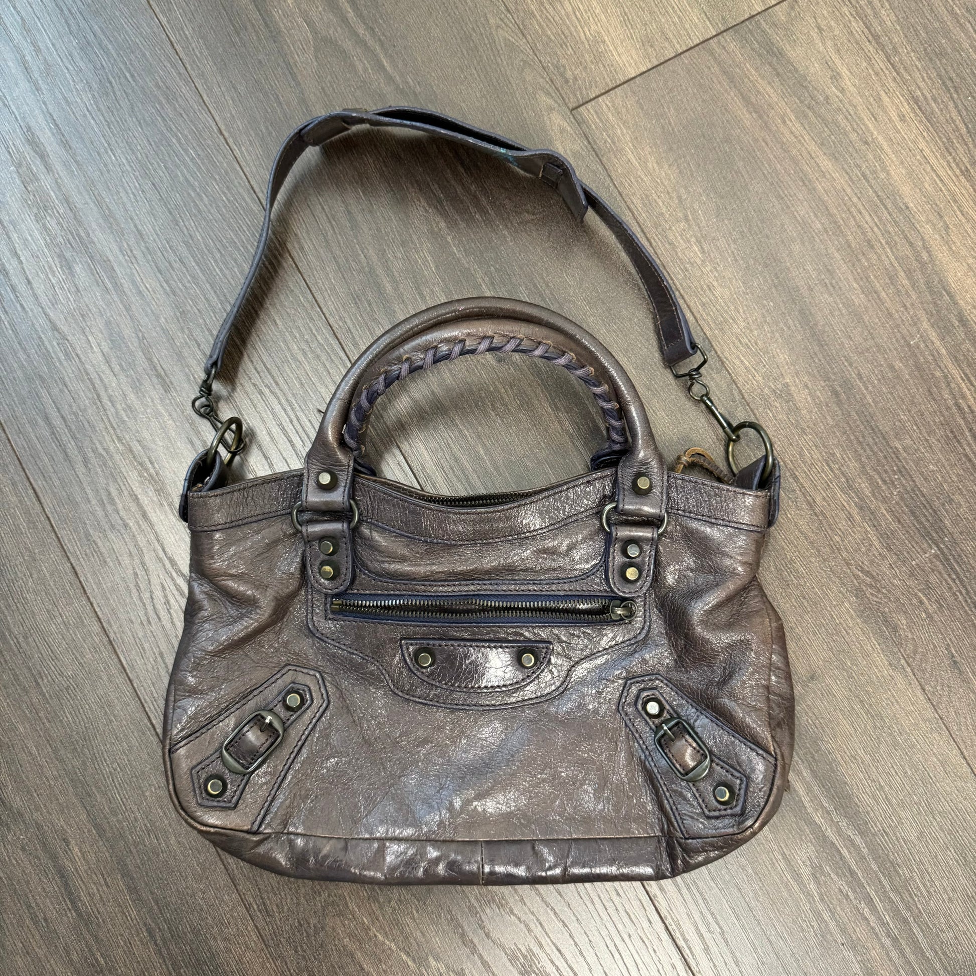 Details: Faded brown/purple genuine leather bag similar to Balenciaga City bag, with brass hardware details, long strap, and short strap.
