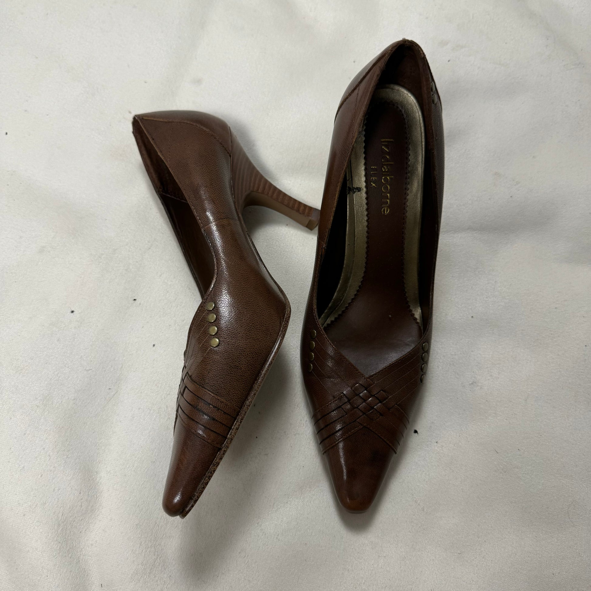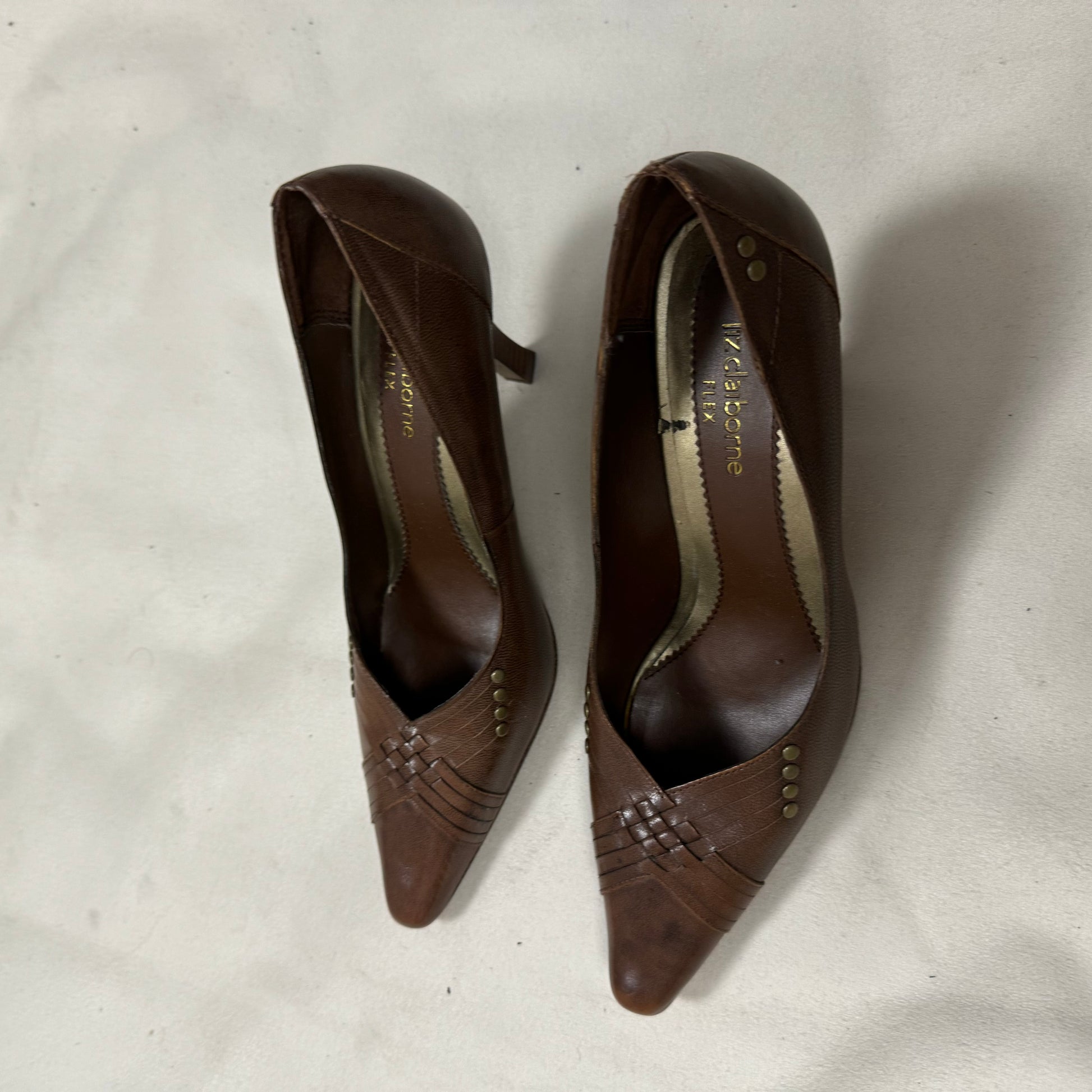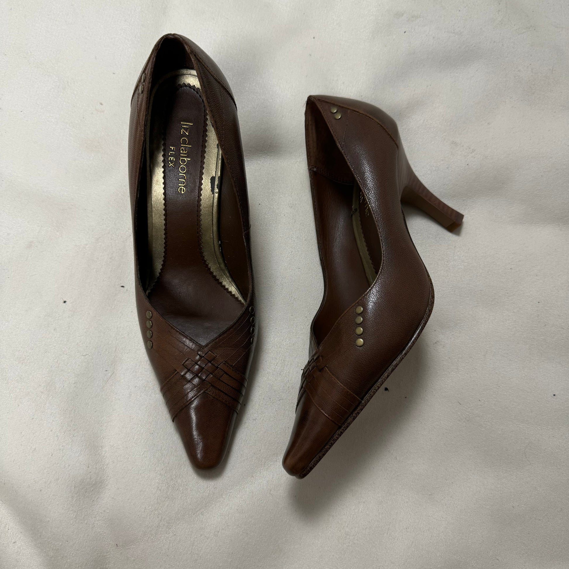 Details: Brown pointed toe kitten heels with gold studs and a gorgeous design.