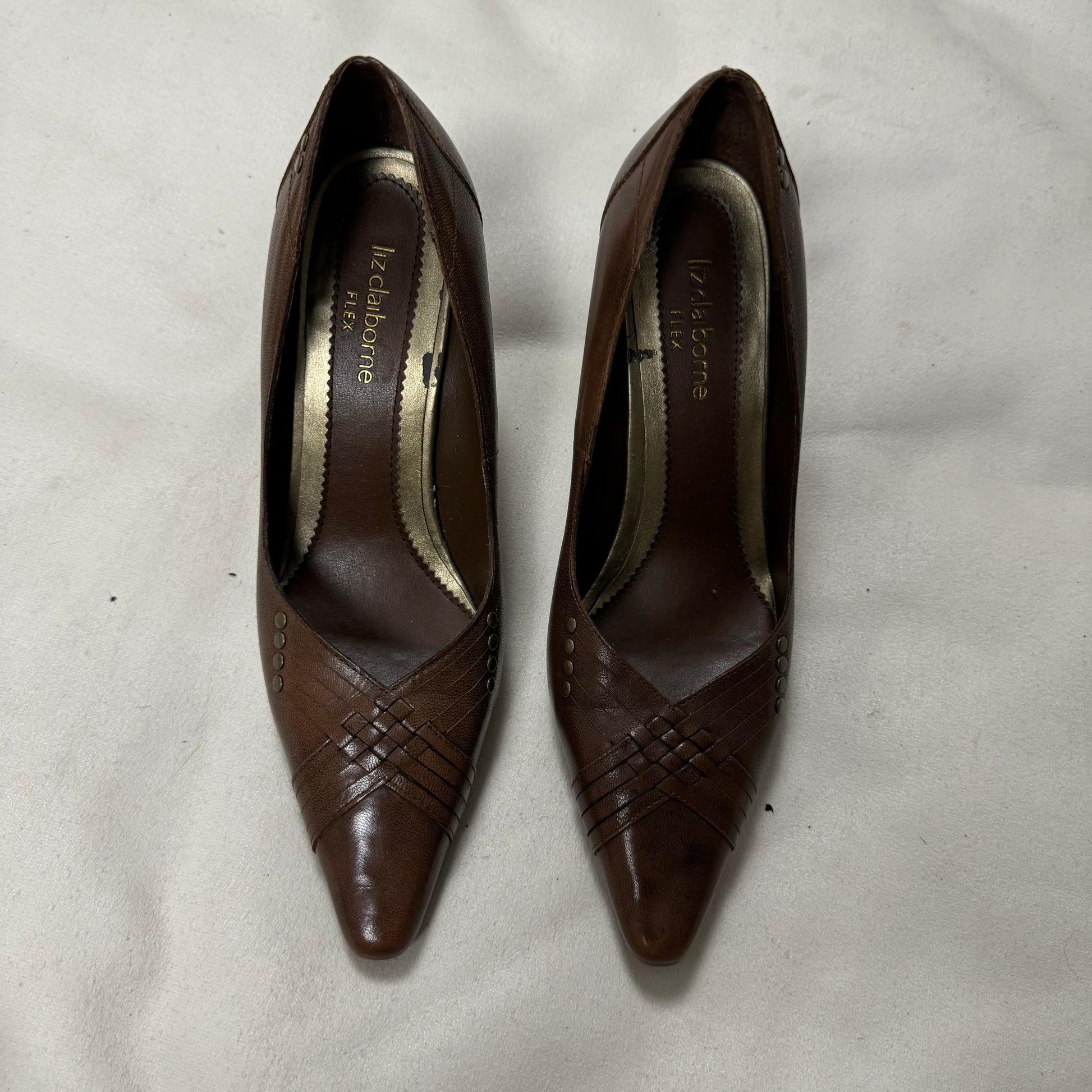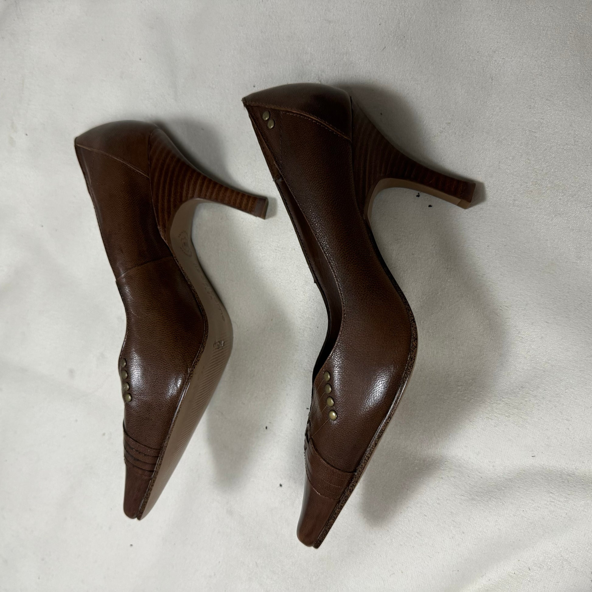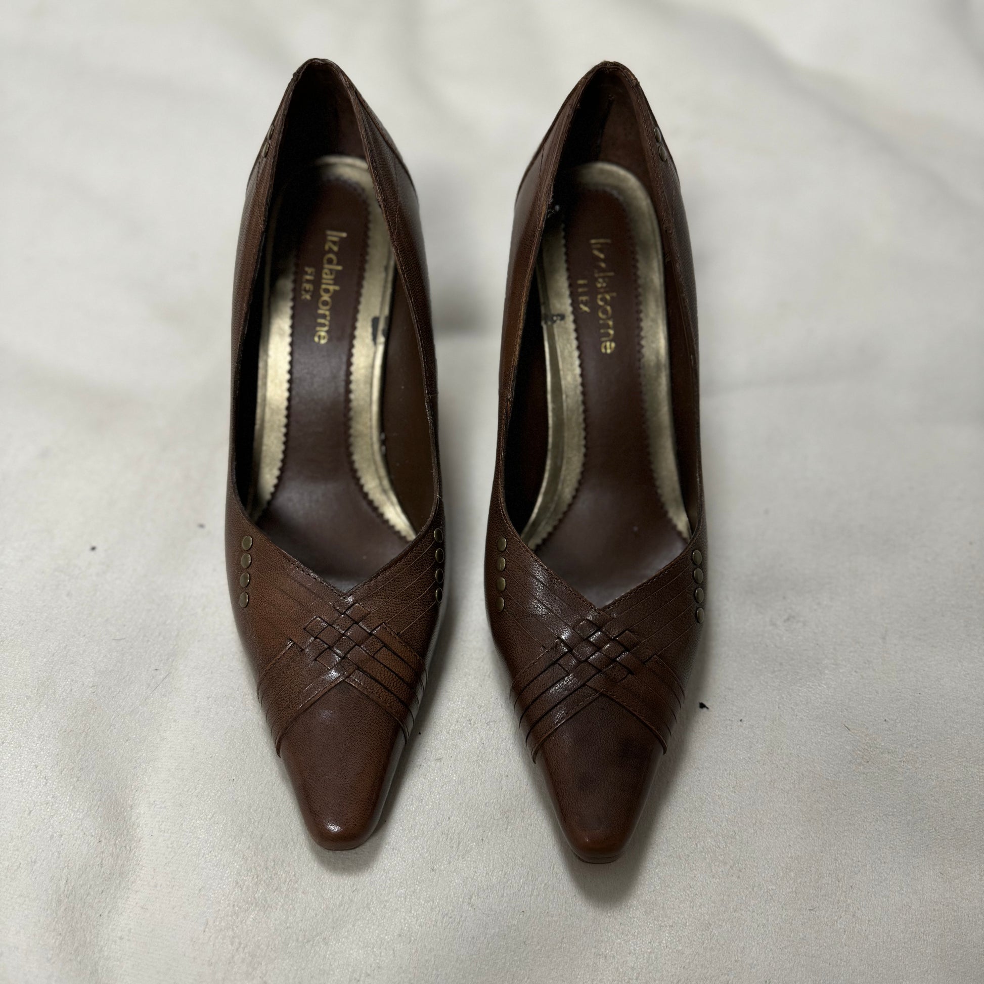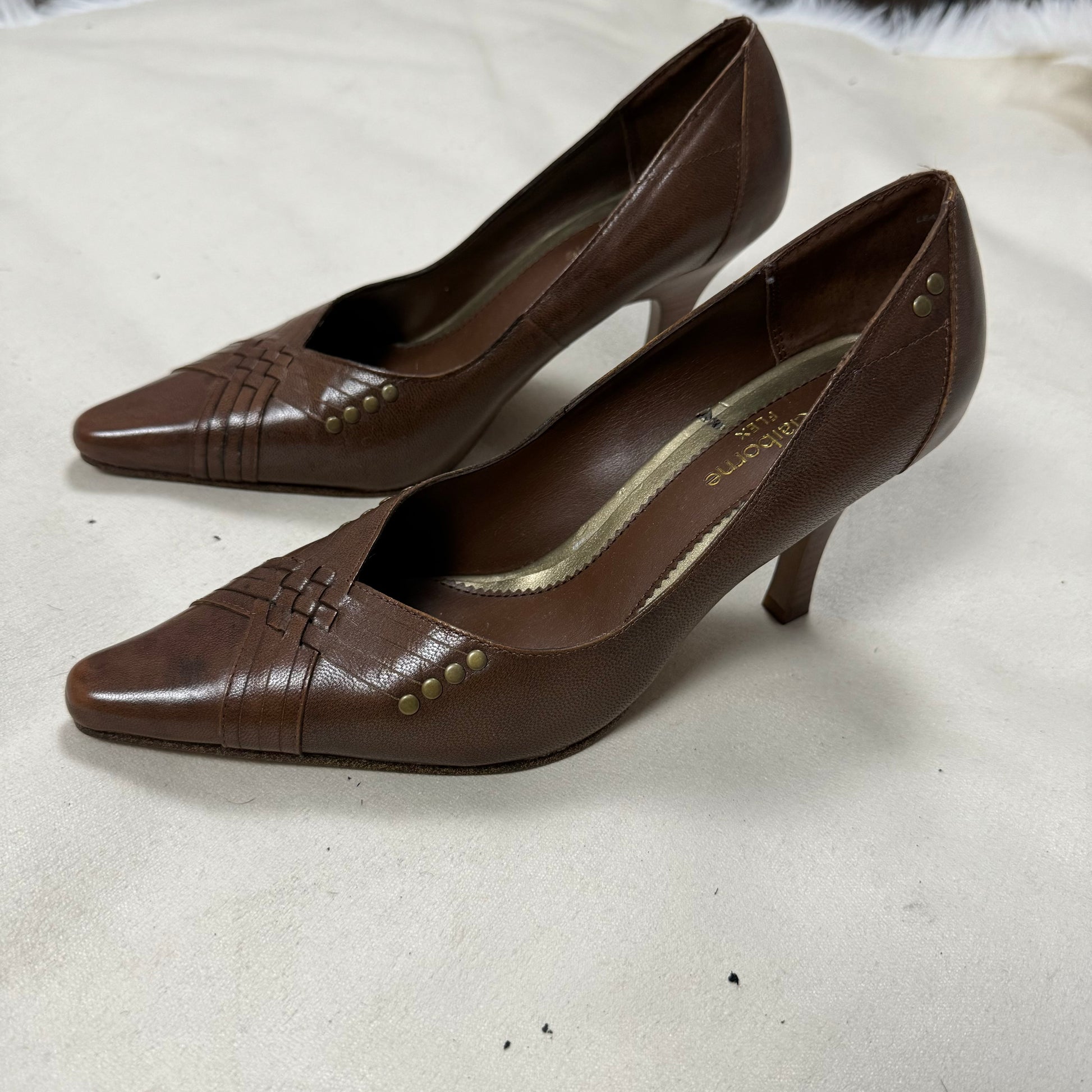 Details: Brown pointed toe kitten heels with gold studs and a gorgeous design.