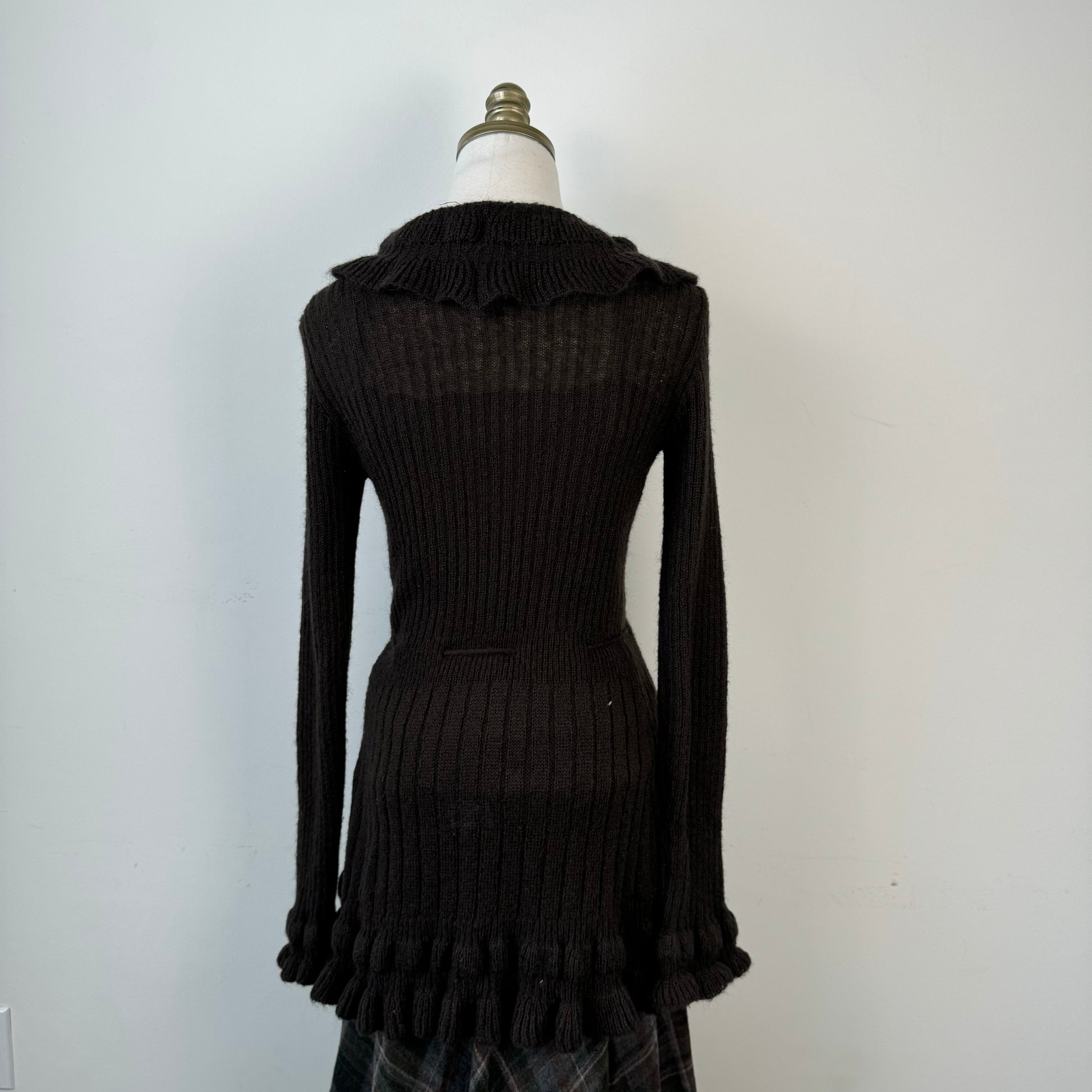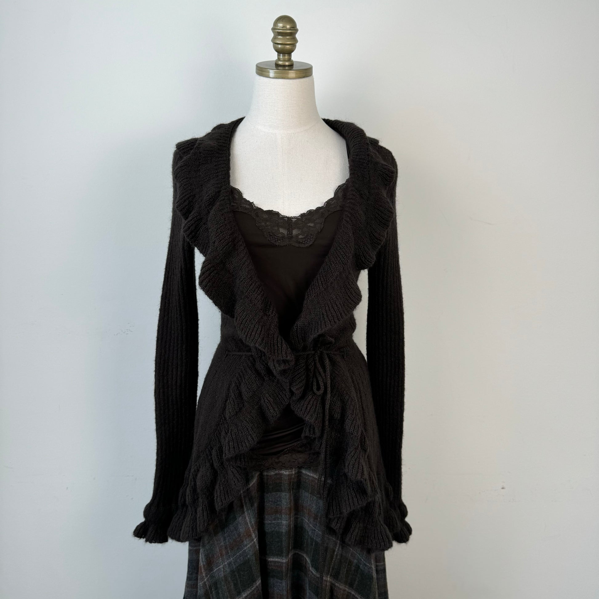 Details: Brown long cardigan with ruffled tie-up front and ruffle trim, made in Italy.