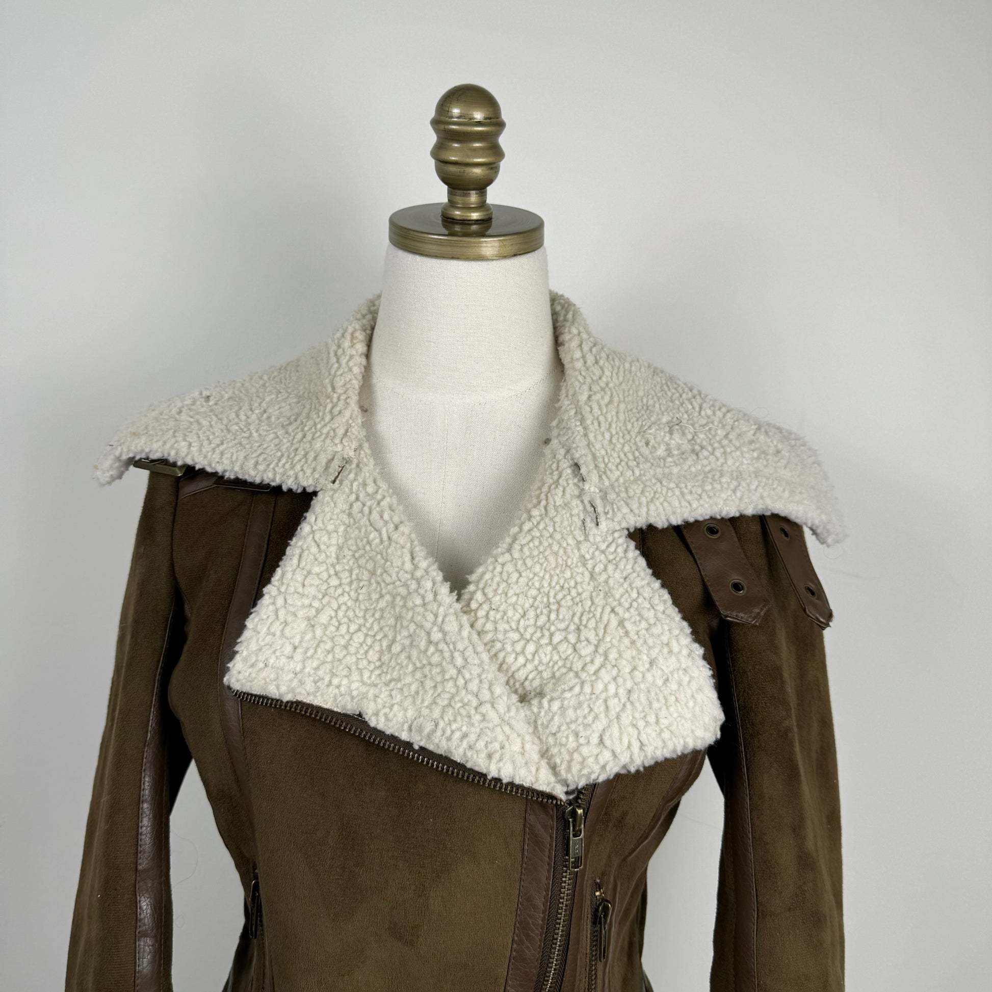 Details: Brown fitted jacket with shearling trim, faux suede and faux fur trim, buckled closure at neckline, and funnel neck.