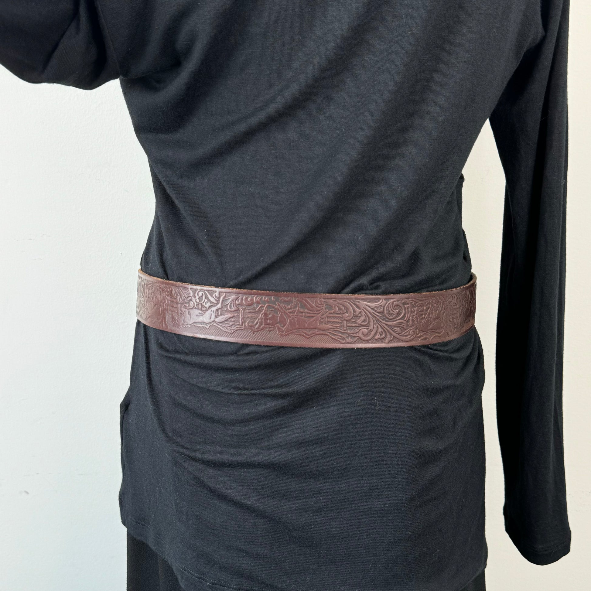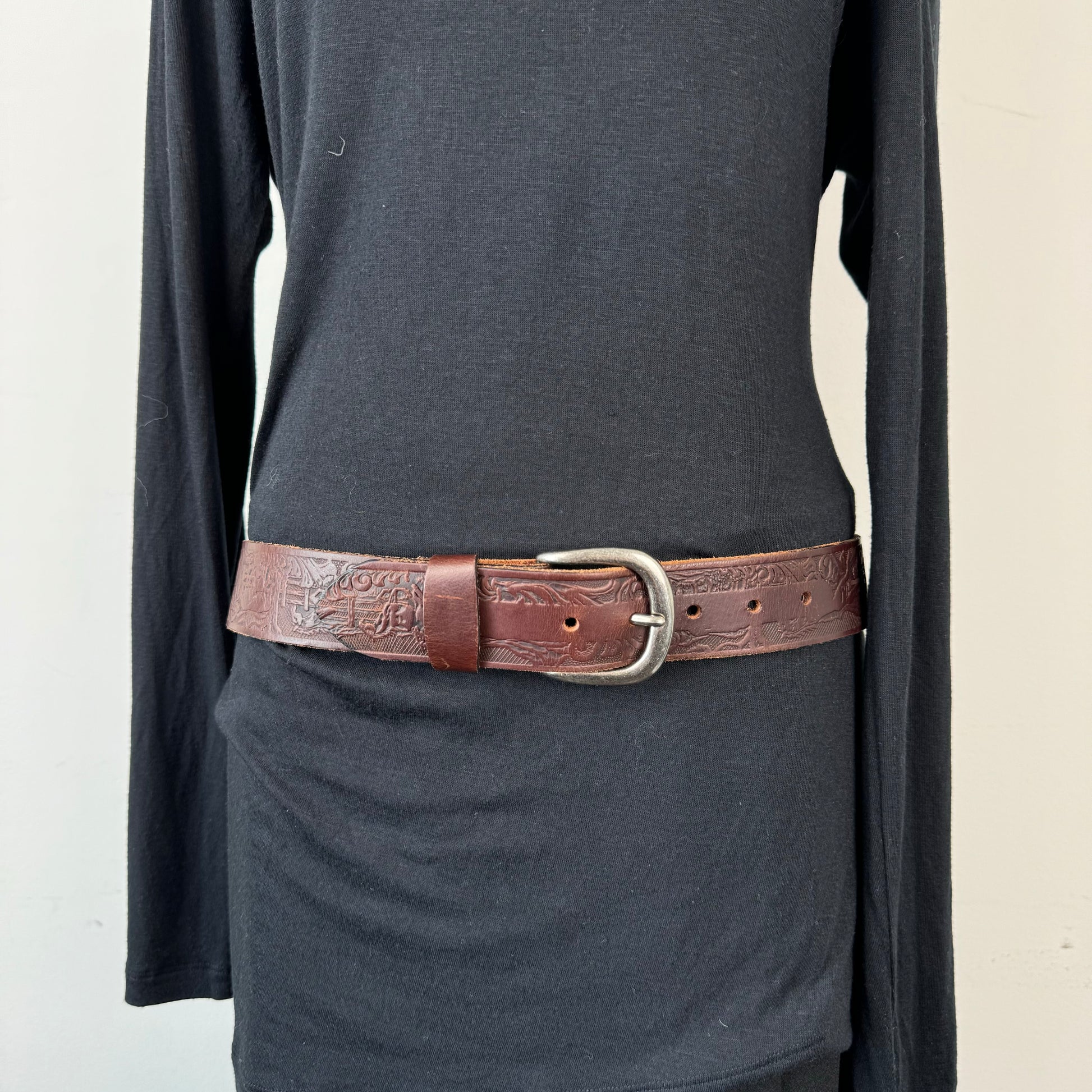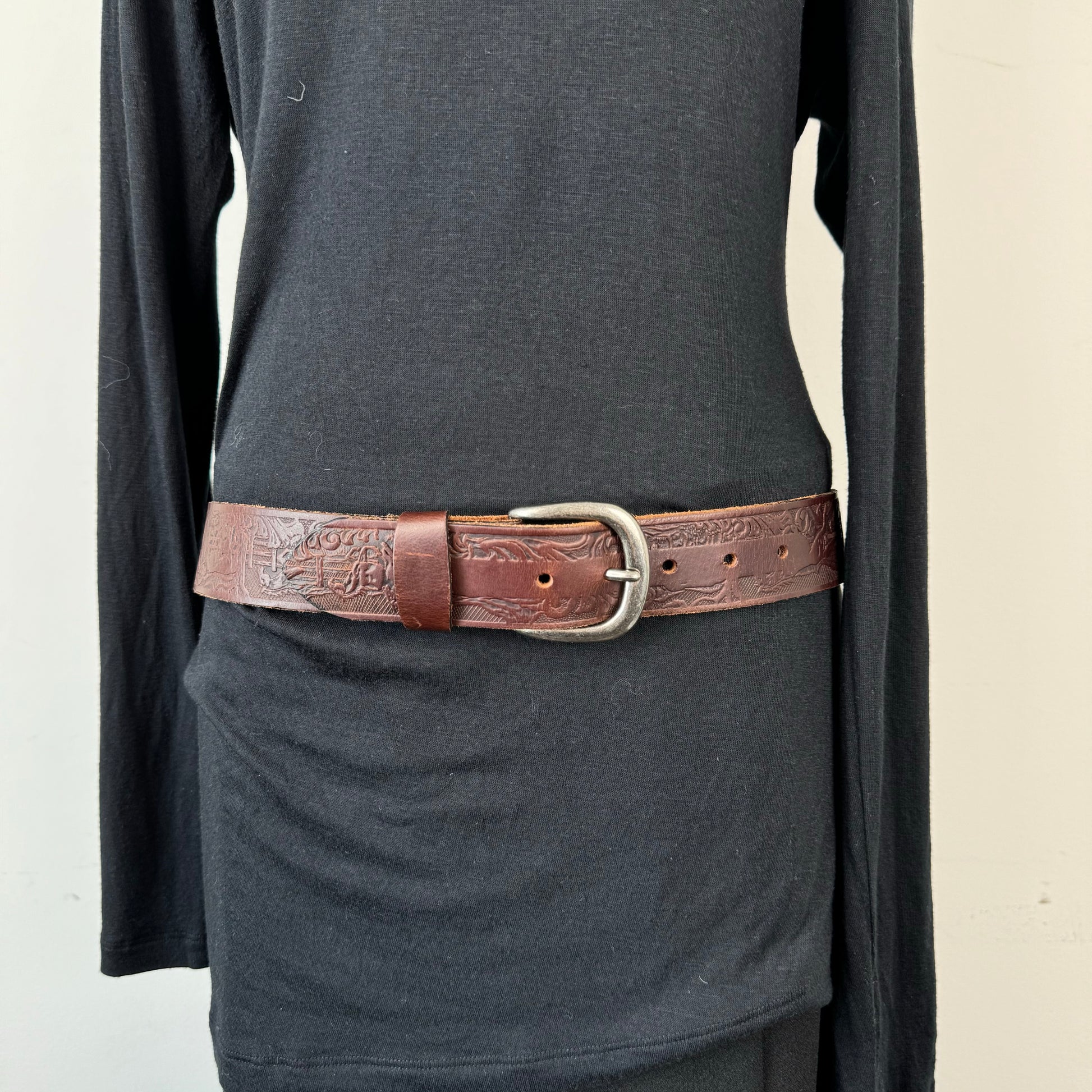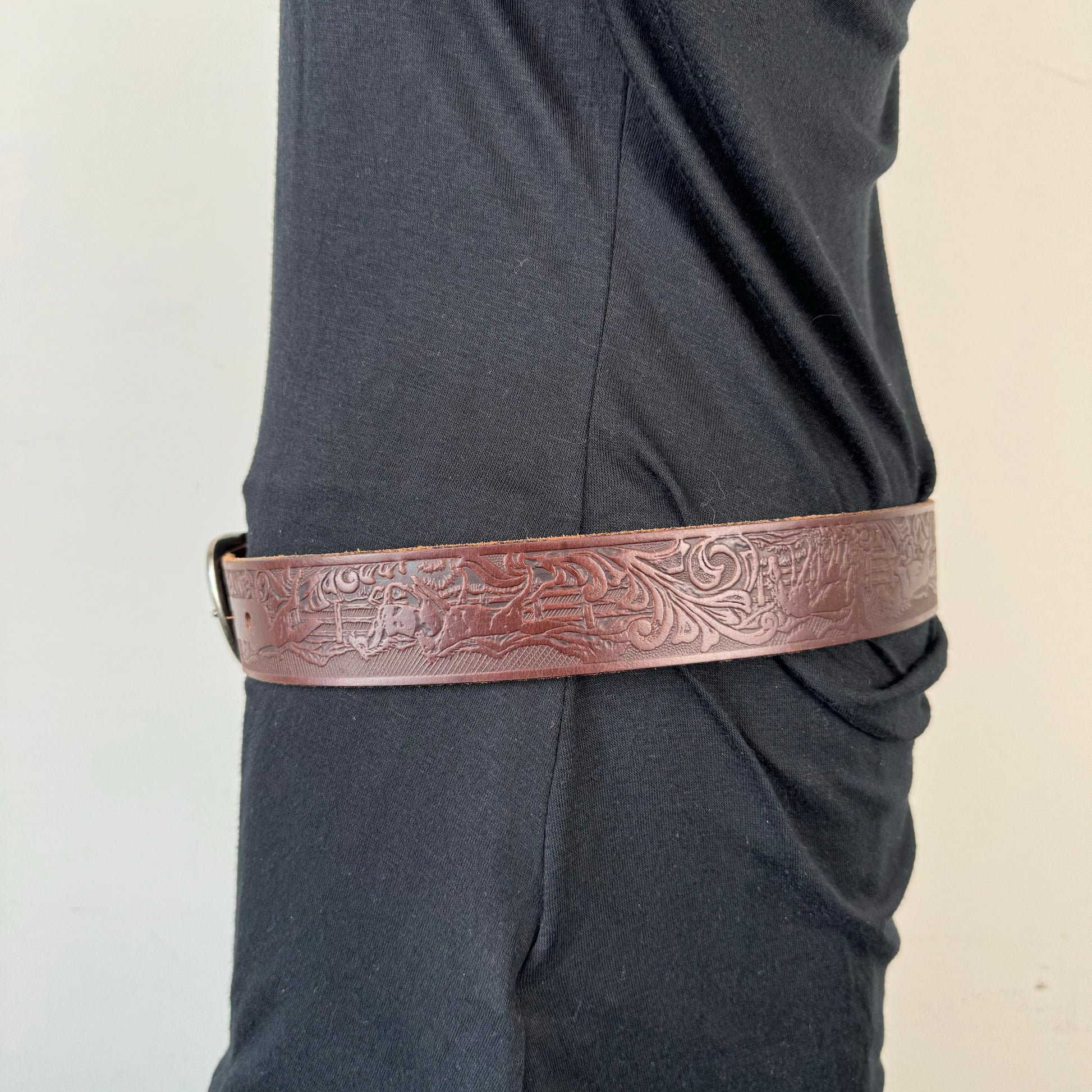 Details: Brown genuine leather belt with silver buckle featuring a western horse pattern engraving.