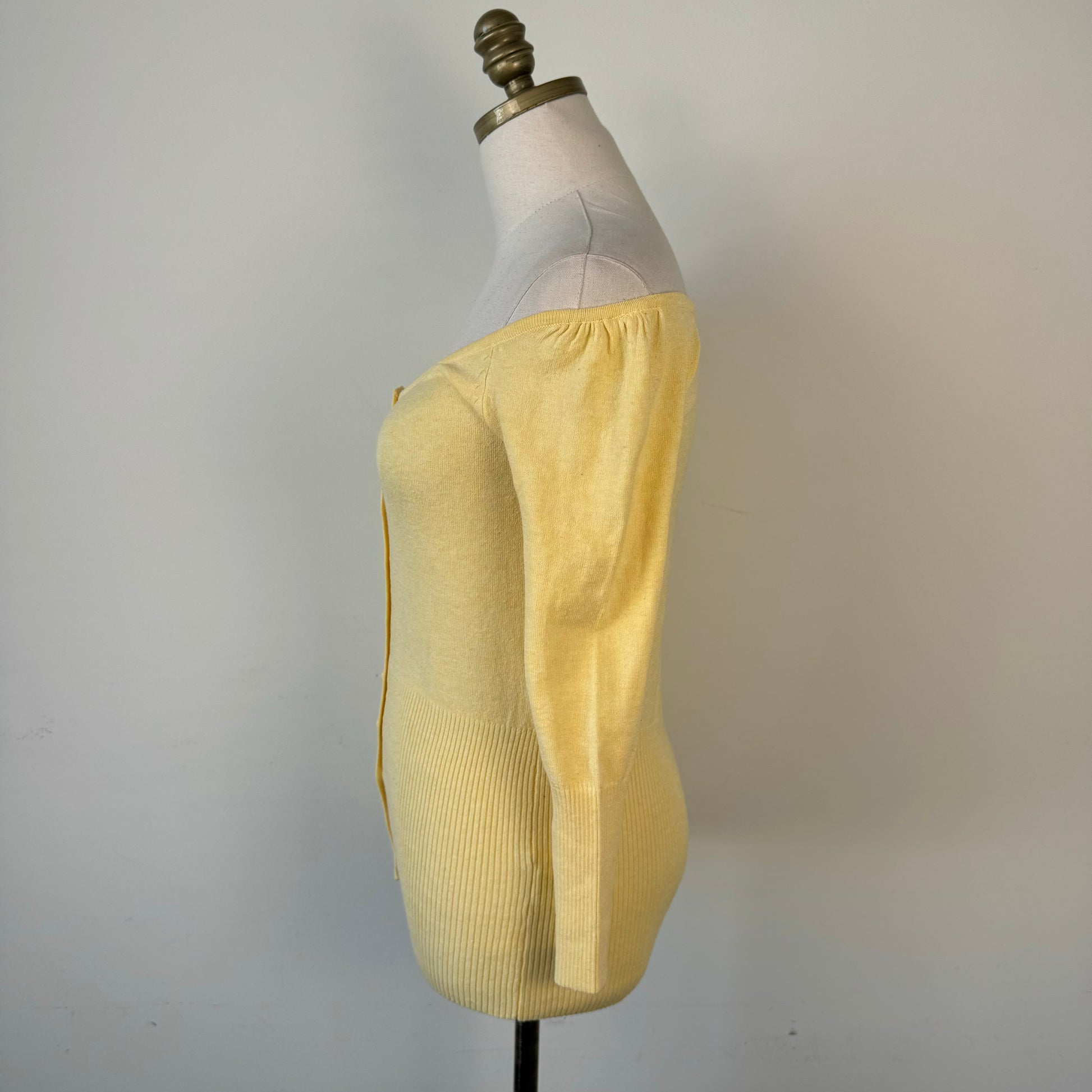Details: Butter yellow off-shoulder top with a cinched waist, button-up front, and 3/4 sleeves.