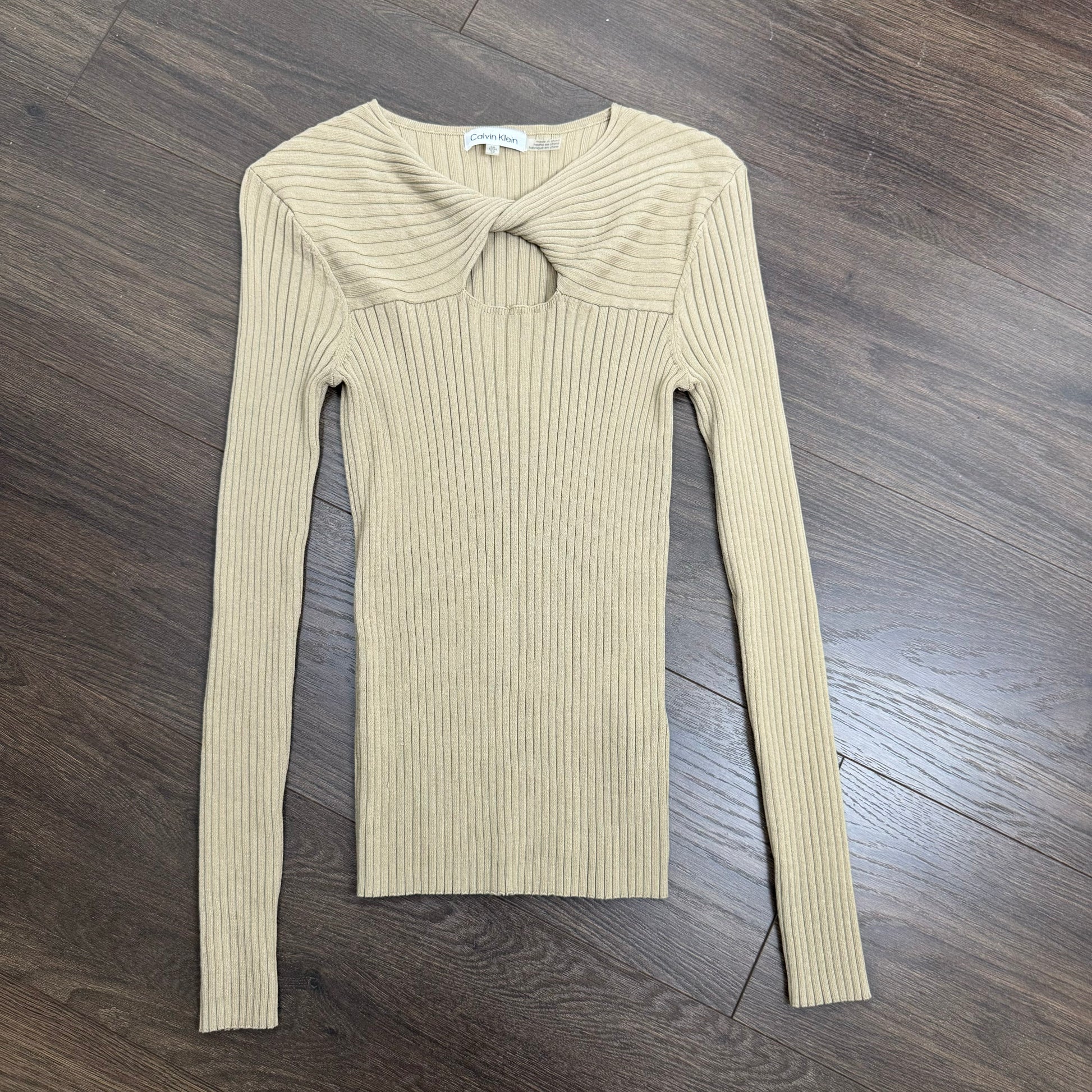 Details: Sand/beige ribbed knit long sleeve top with a cutout at the neckline.