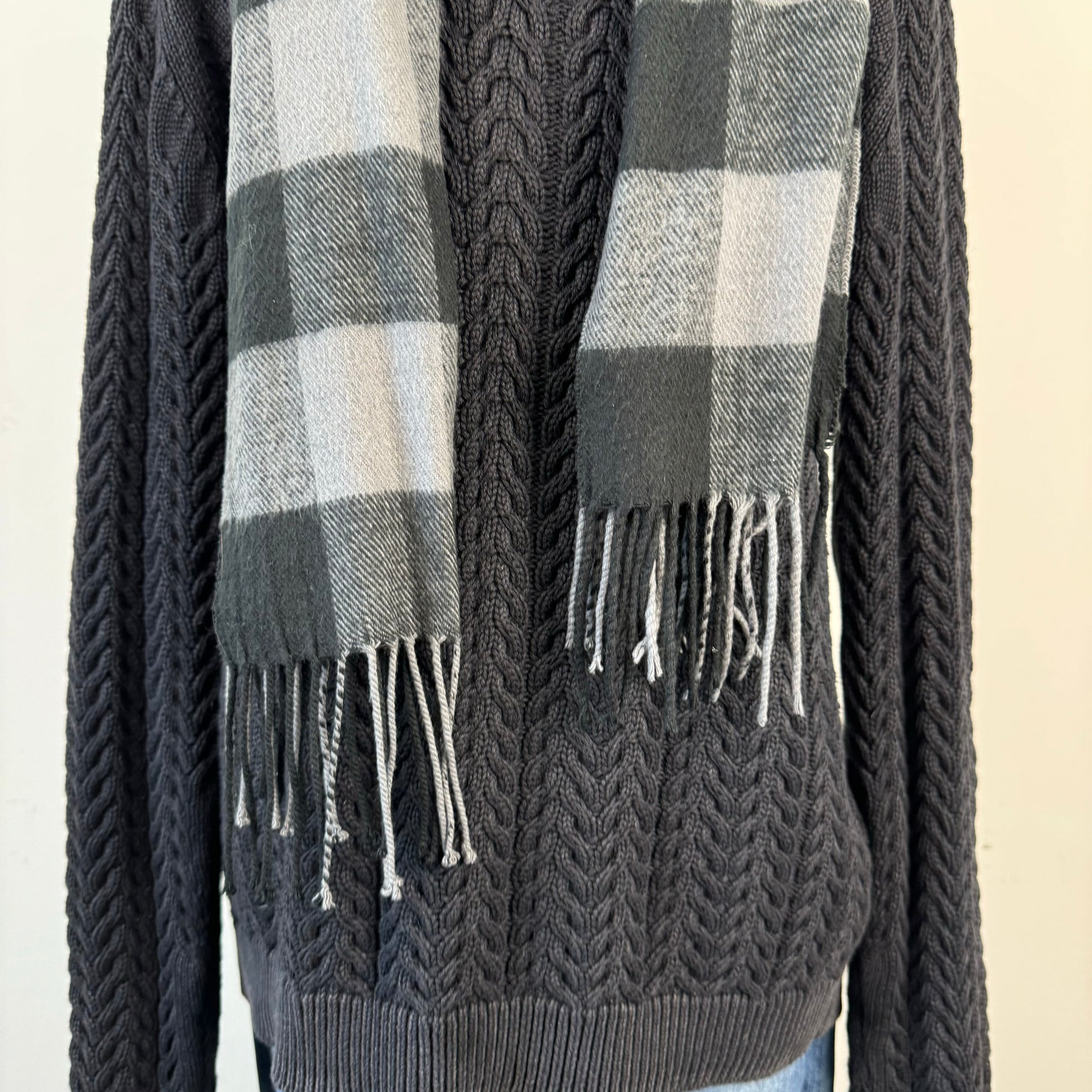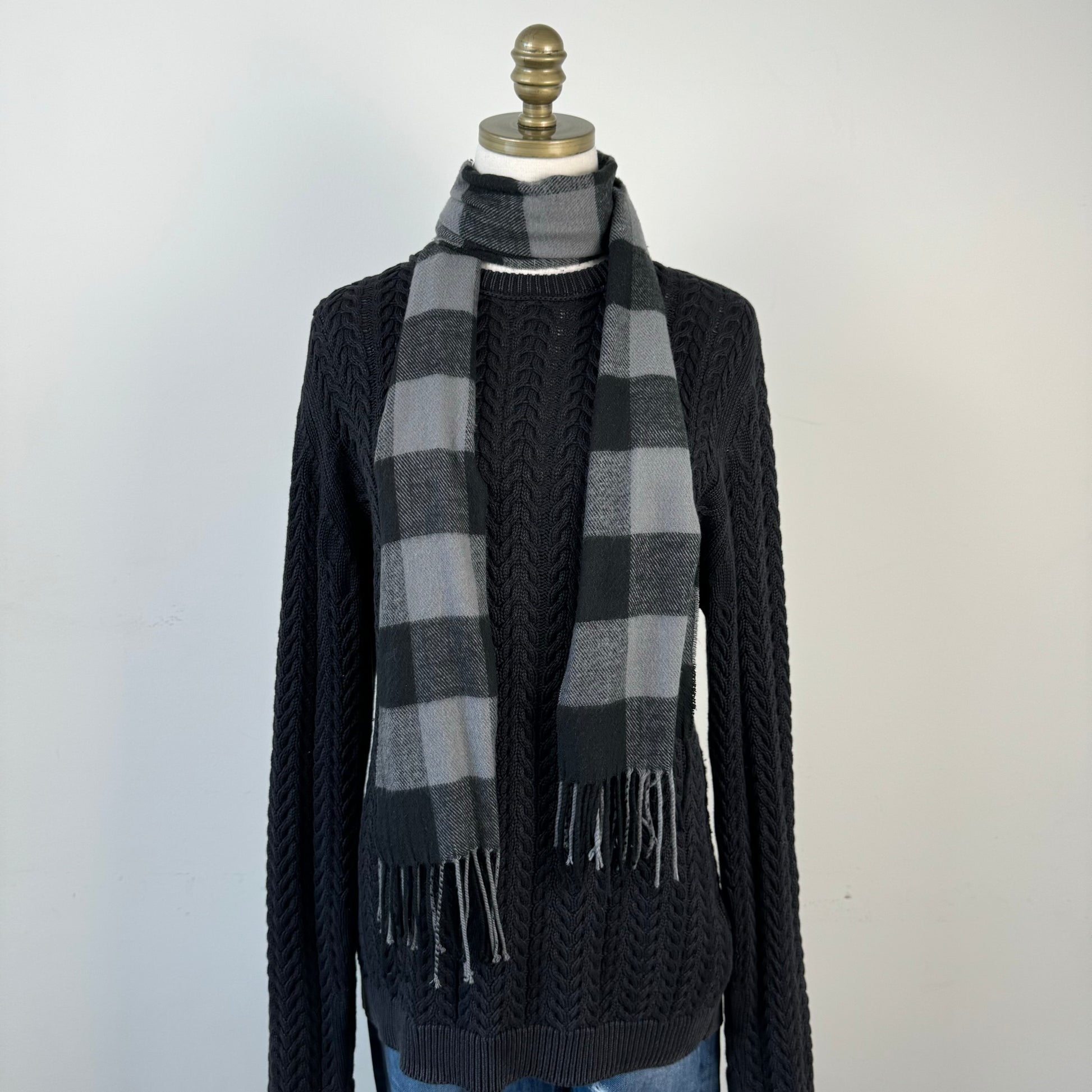 Details: Black and grey checked plaid knit scarf in a cashmere blend.