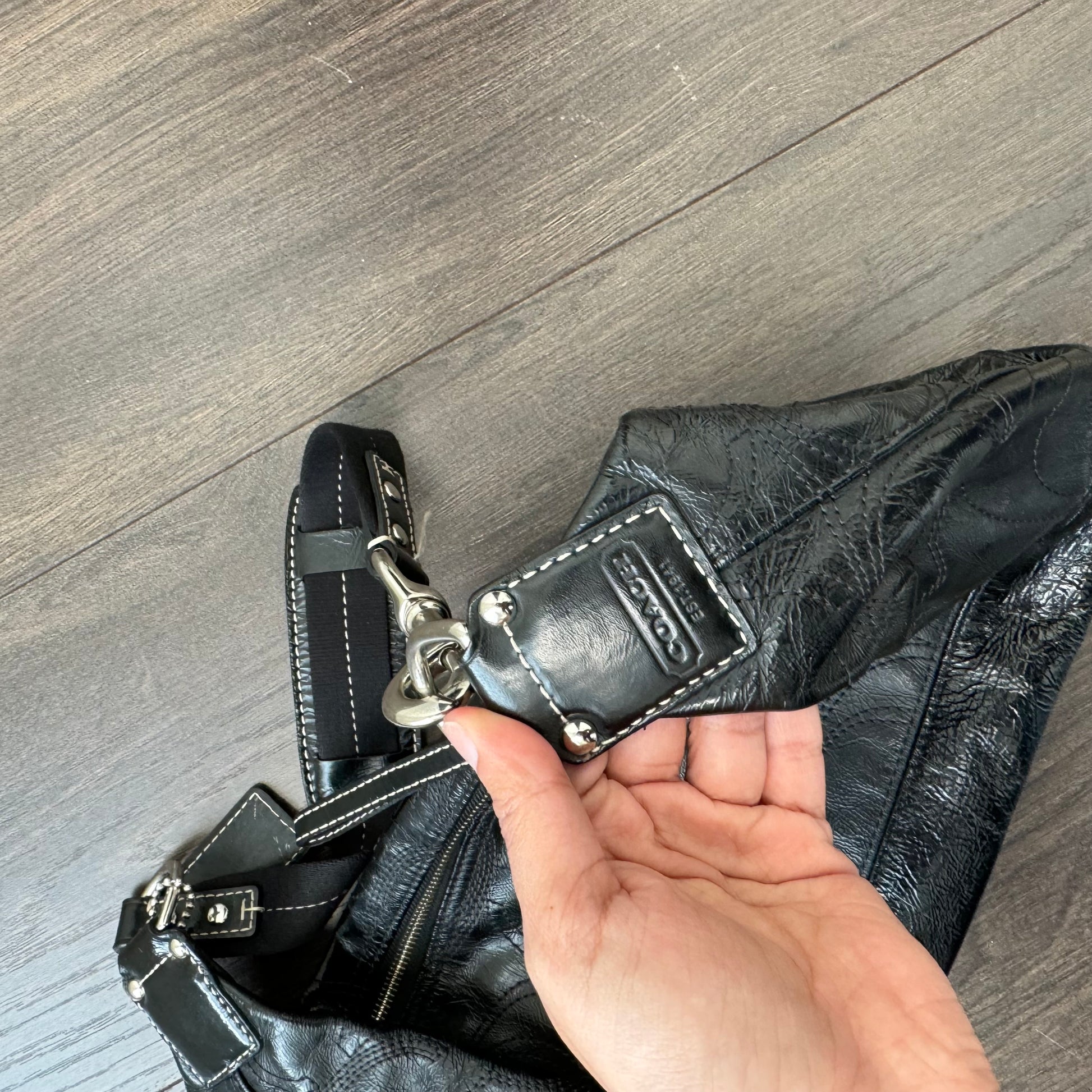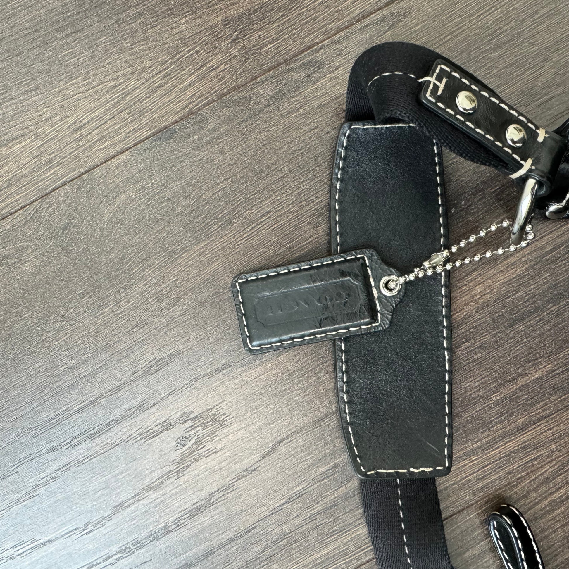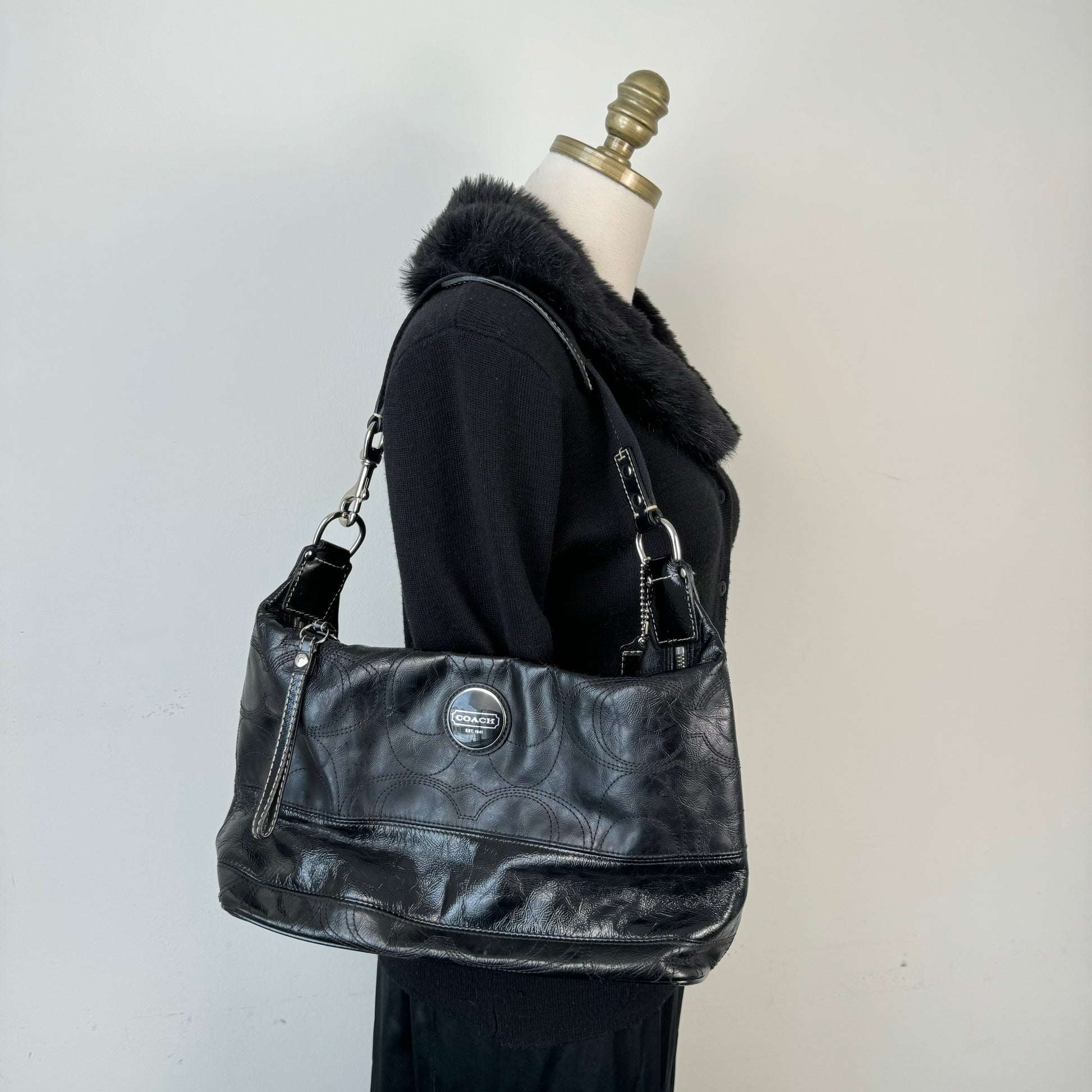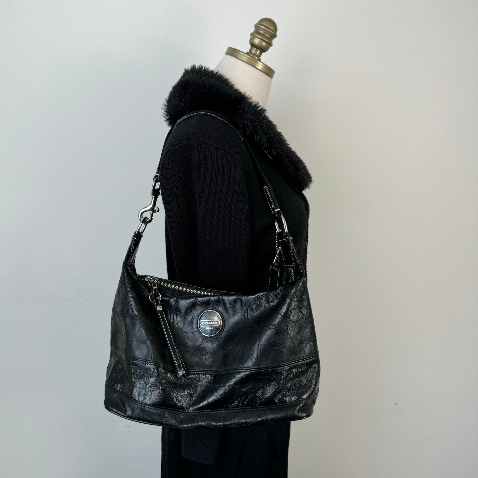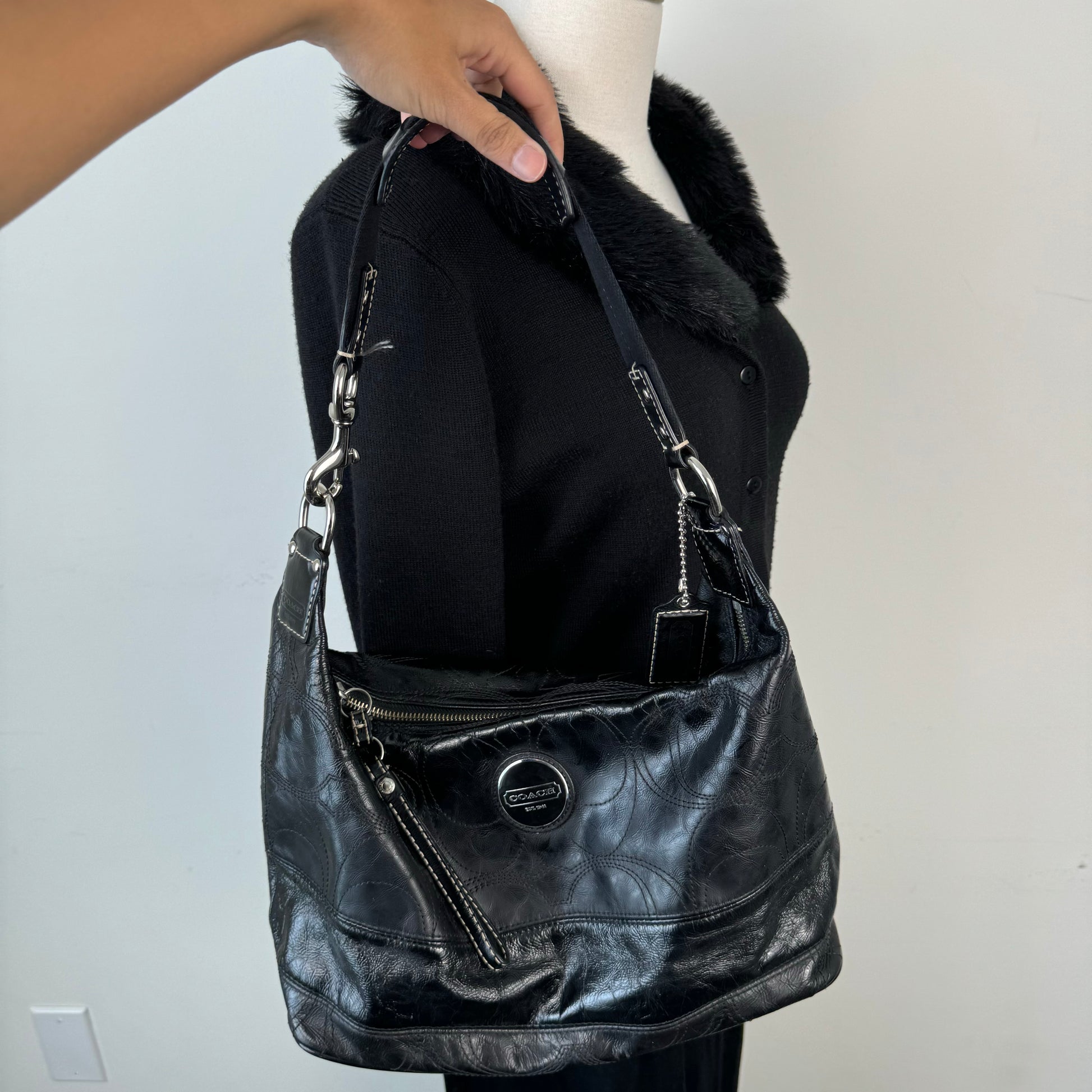 Details: Black leather shoulder bag with silver hardware detailing and blue satin lining.