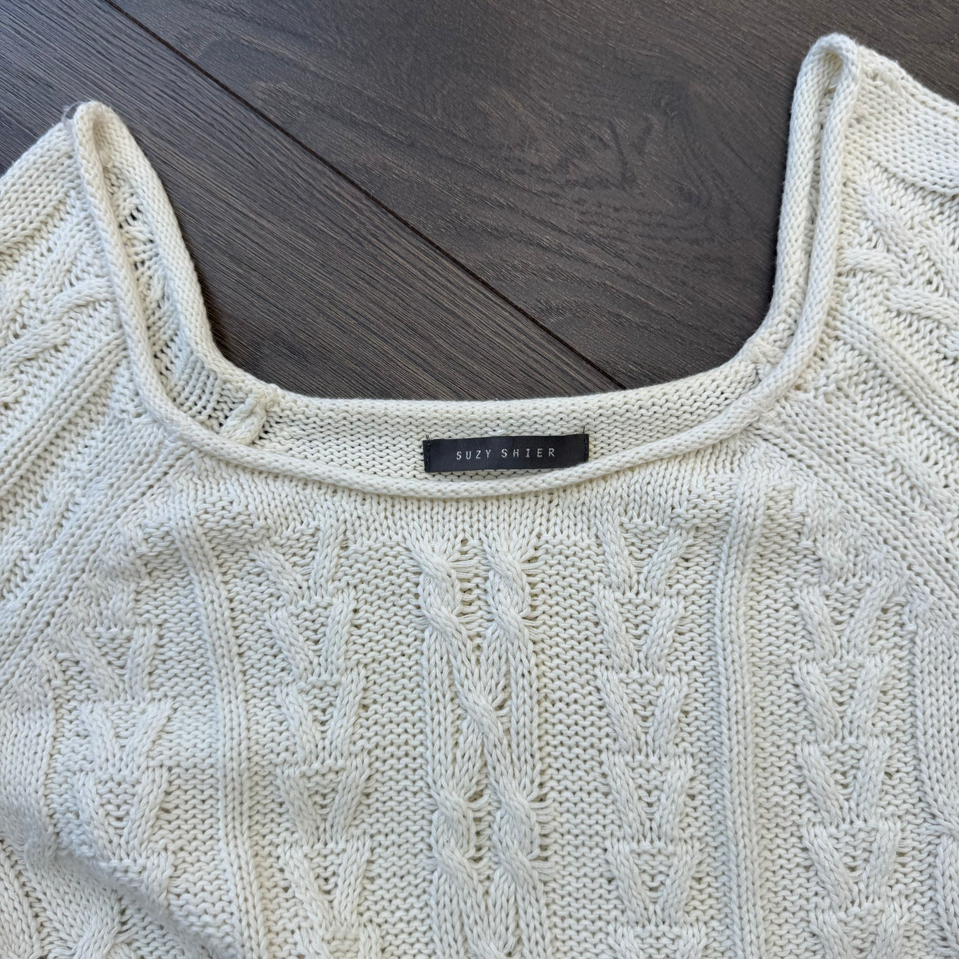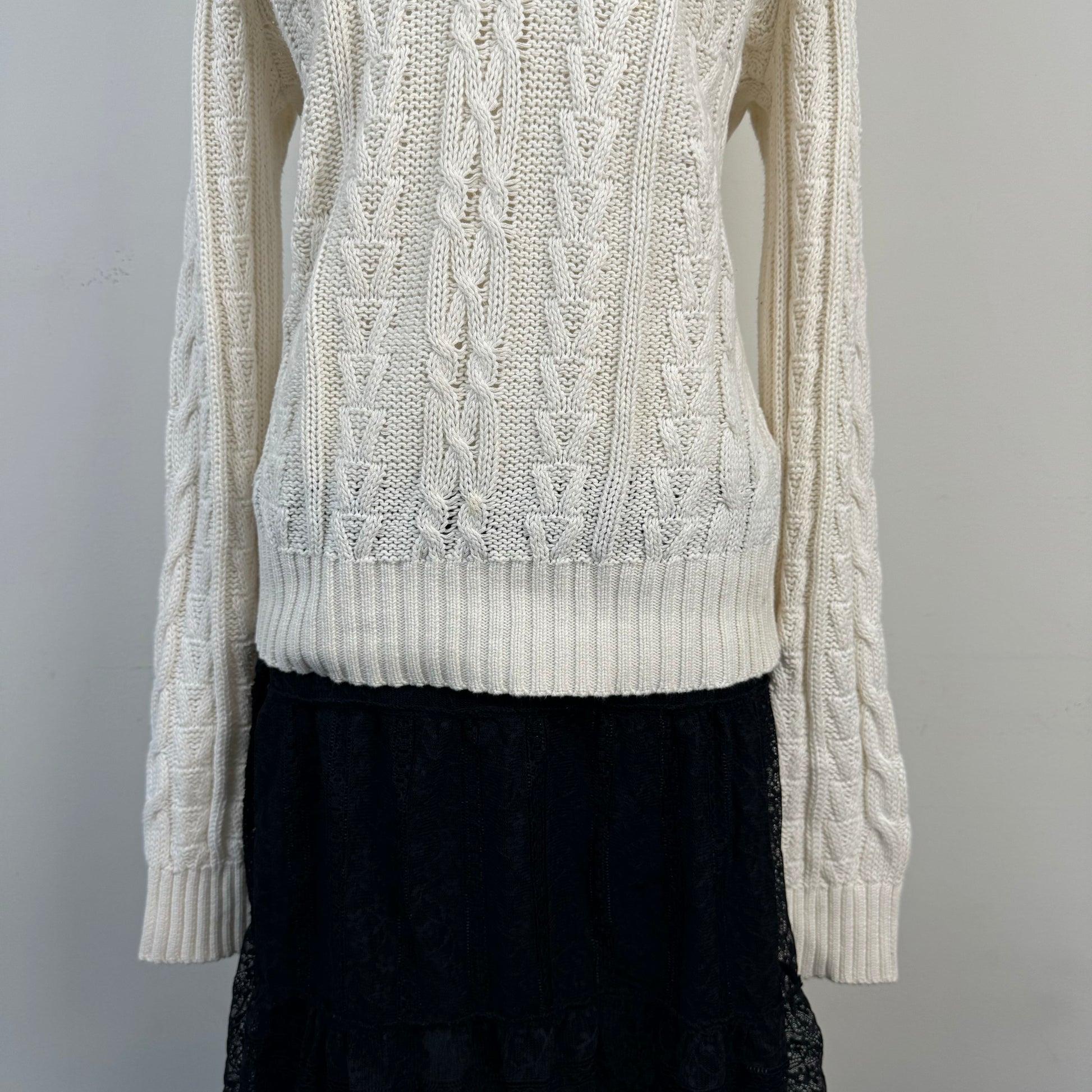 Details: Cream cable knit sweater with an off-shoulder/boat neck design.