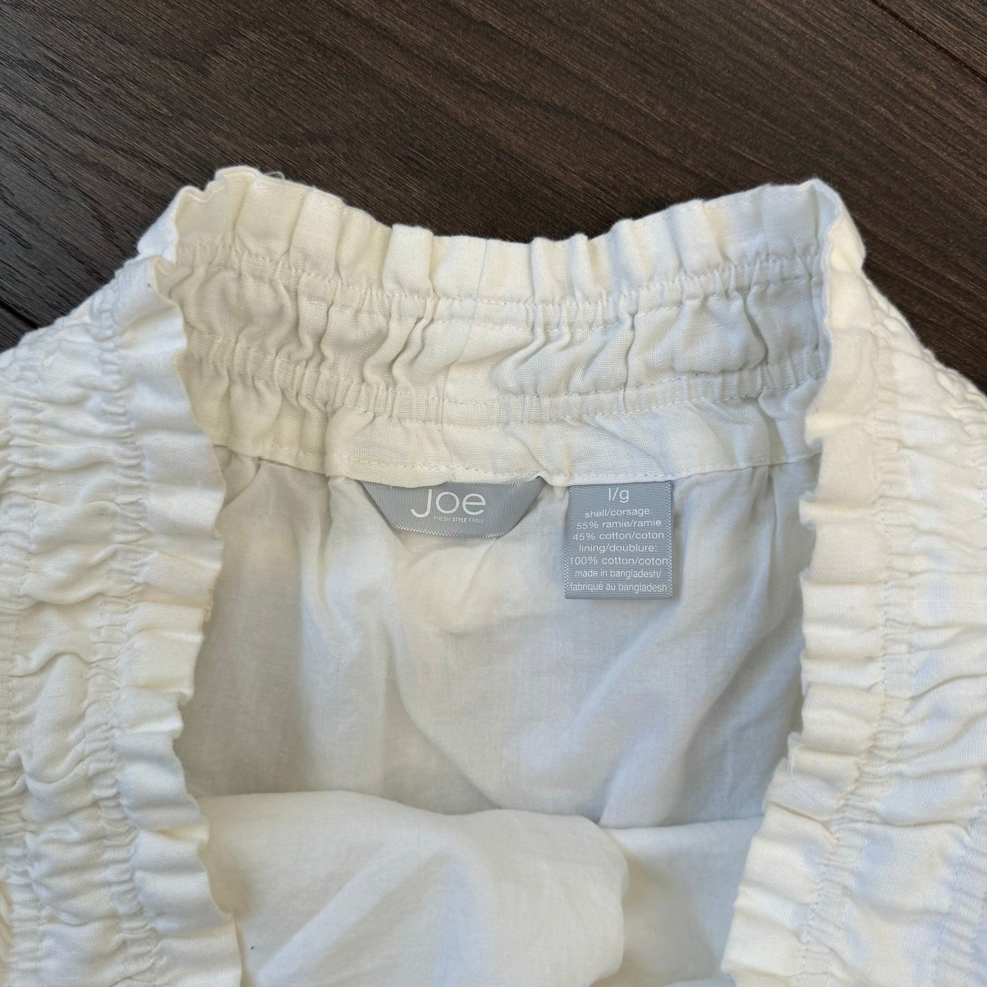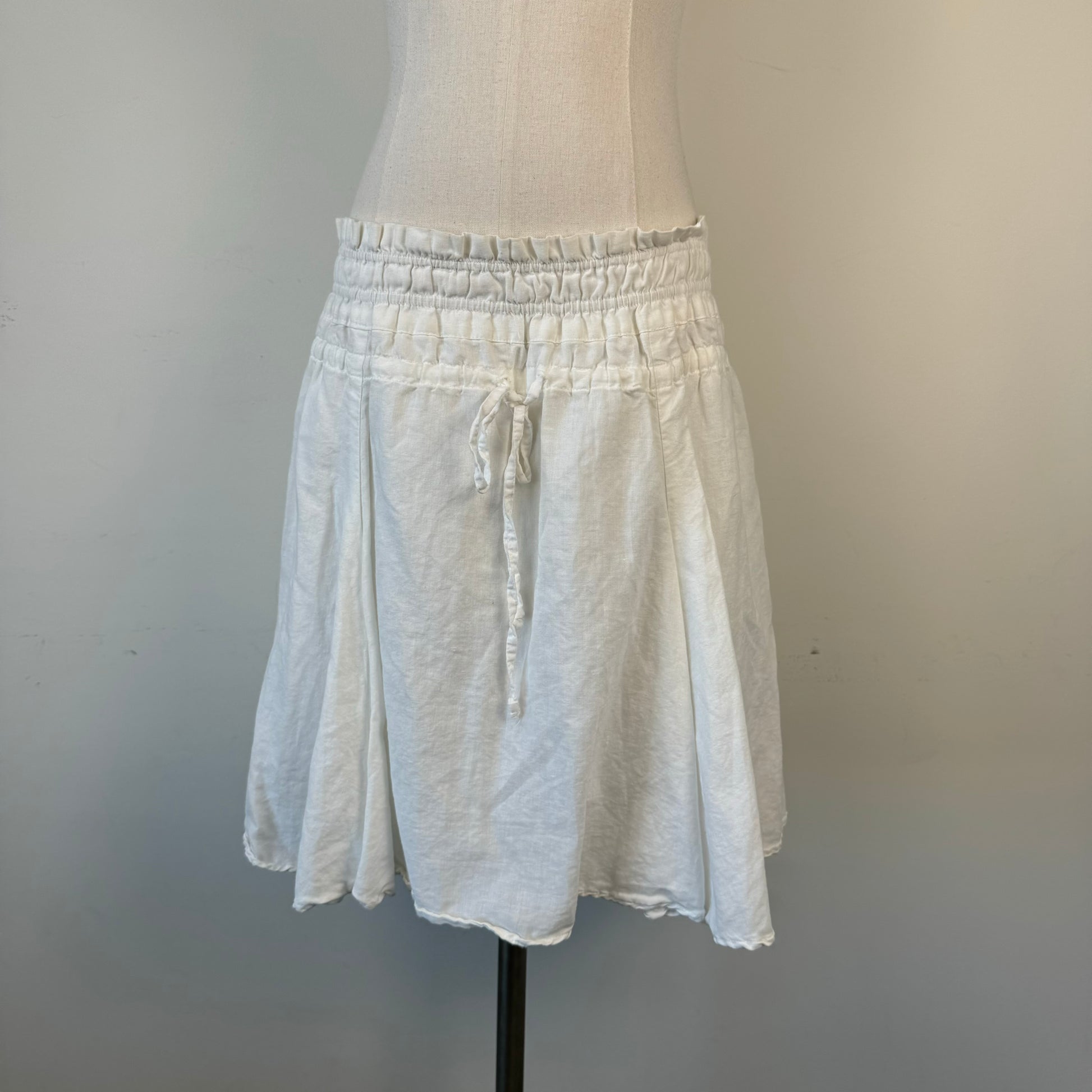 Details: Cream midi skirt with a drop waist, flared and ruffled design, made of a cotton linen blend, featuring a ruched waist band.